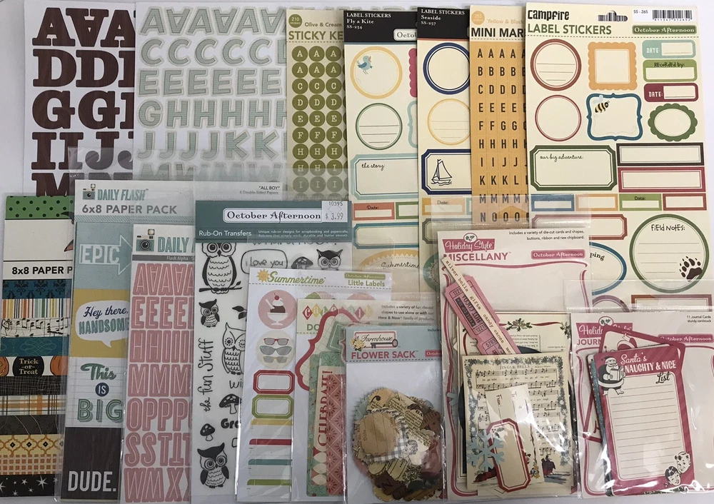 October Afternoon Scrapbooking Lot of 16 Items *Read For Items Included* The items included in the October Afternoon lot are: Campfire Alpha Stickers SS-266 Campfire Label Stickers SS-265 Travel Girl Alpha Stickers SS-1016 Olive & Cream Sticky Keys SS-294 Fly A Kite Label Stickers SS-254 Seaside Label Stickers SS-257 Yellow & Black Mini Market SS-285 Daily Flash 6x8 Paper Pack “All Boy” PP-1156 Daily Flash Strawberry Ice Cream Alpha SS-1114 Rub On Transfers Owls Summertime Little Labels SS-1315 Cakewalk Doo-Dads DC-172 Farmhouse Flower Sack EM-855 Holiday Style Miscellany DC-154 Holiday Style Journal Cards DC-155 Witch Hazel 8x8 Paper Pad (Not a full book. Only has 14 pages) Please see photos for all of the items included.