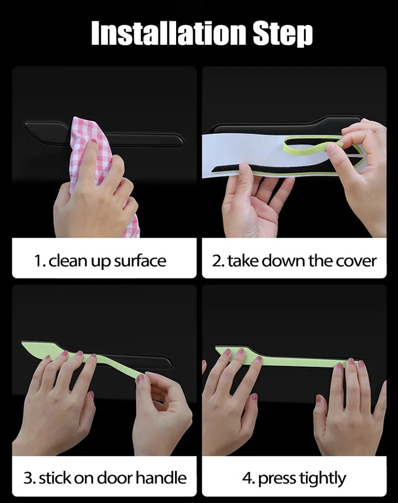 4Pcs/Set Door Handle Cover Protector for Tesla Model 3 Y 2021-2023 Sticker Wrap Trim Decal Car Accessories Specification : Fit for: Tesla Model 3/Y. Installation location: Door handle Material: Soft Silicone. Color: Neon Green, Carbon Fiber, Transparent. Quantity: 4pcs/set Feature : 1. Easy to install. No need to install wiht other kits. 2. Lightweight, wear-resistant. 3. Made of high-quality materials, durable and practical. 4. A perfect protector for your car handle and door. 5. The green strip glows in the dark(ONLY after it absorb lights). Package Included : 4pcs/set Door Handle Cover Notice : 1.Please allow slight error due to manual measurement. 2.The actual color may have slight difference to the listing pictures, due to different screen. Thank you for your understanding.