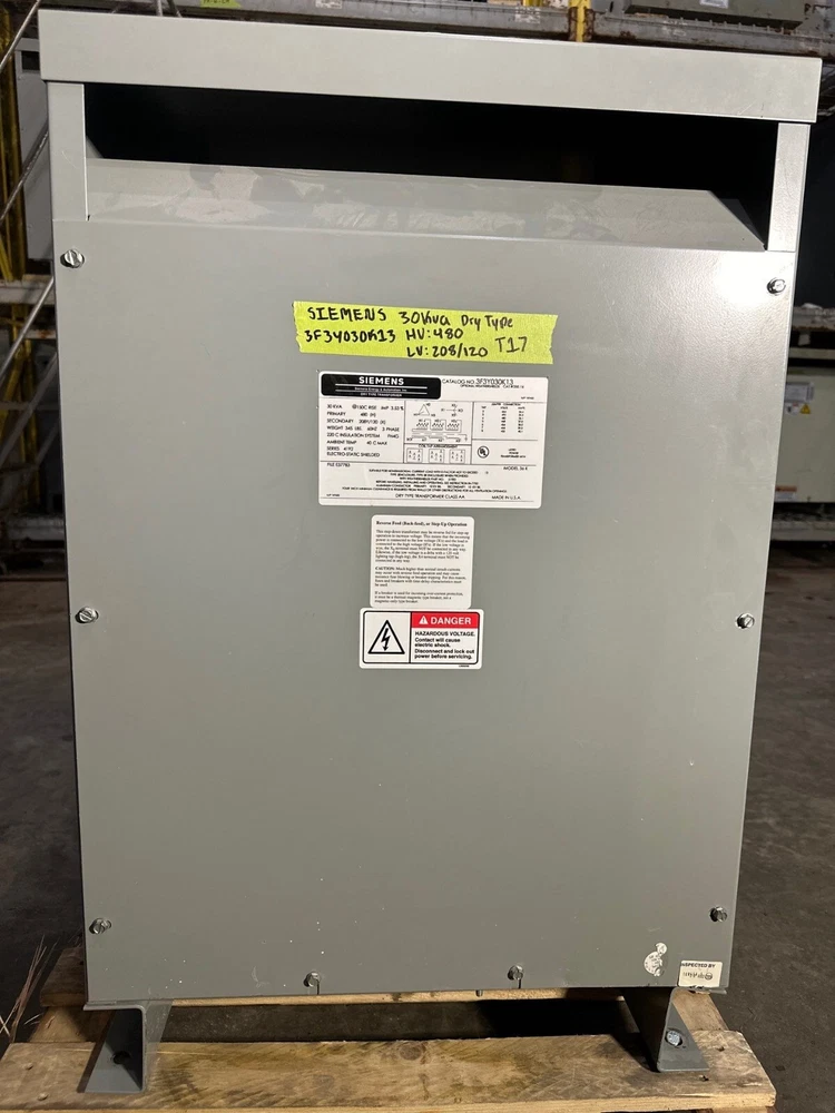 30 KVA Siemens 3F3Y030K13 Transformer Pri 480V Sec 208Y/120V 3 Phase Indoor 3PH Weight: 345lb Item pictured will be exact item you will receive unless multiple quantities listed. Please message for a freight quote if needed. PLEASE MESSAGE FOR A SHIPPING QUOTE PRIOR TO PURCHASING. SHIPPING IS NOT INCLUDED IN THE PURCHASE OF THIS ITEM. Transformer current condition is as shown in the photographs. Lugs are included with all transformers. We ship to the lower 48 states. Brilliant Equipment Services buys and sell new surplus and used/reconditioned electrical equipment. New Out of box products may have shelf wear but the photos on the listing are of the actual product. Reconditioned products are cleaned and tested before shipping. If you require a certified test on breakers larger than 200 amp 480v, please message us before purchasing the item. All parts are marked to ensure returns are of the original product we shipped. If you would like to send us a UPS shipping label and have a product shipped on your account, please contact us before purchasing. Do you have surplus for sale? We buy new surplus and used equipment. Removal services available nationwide.