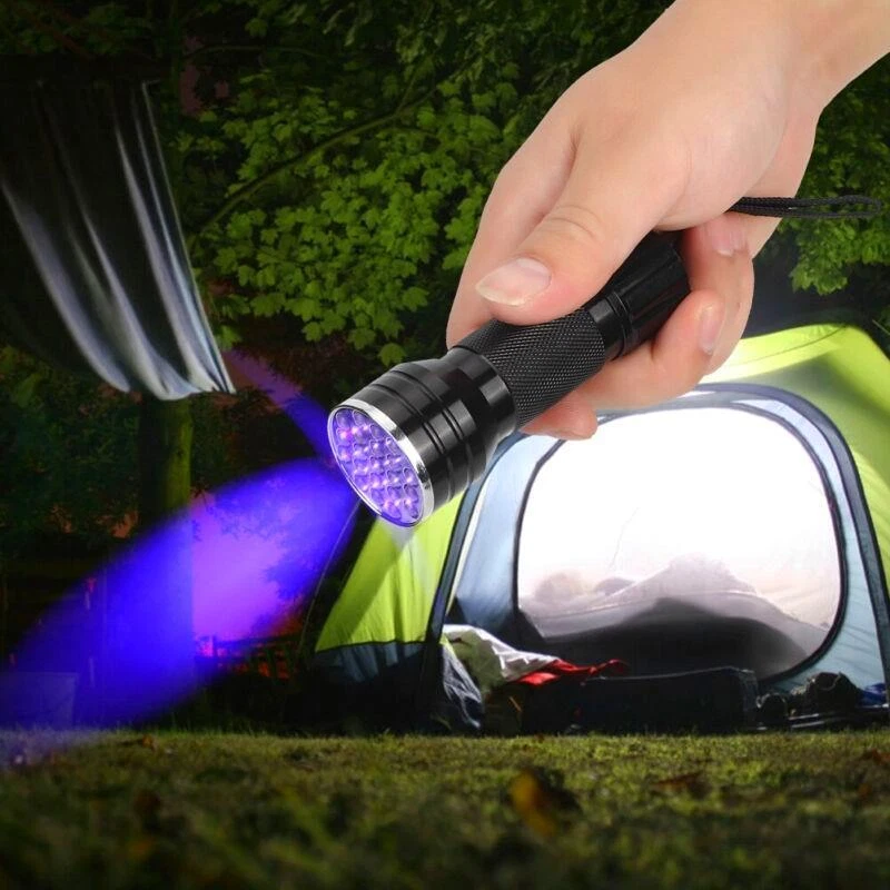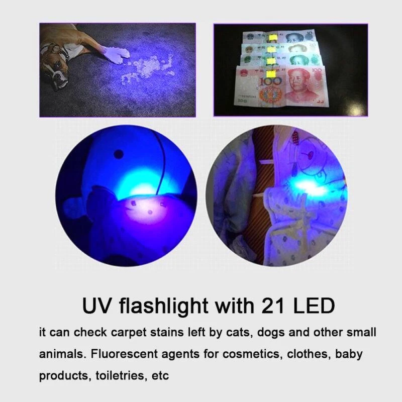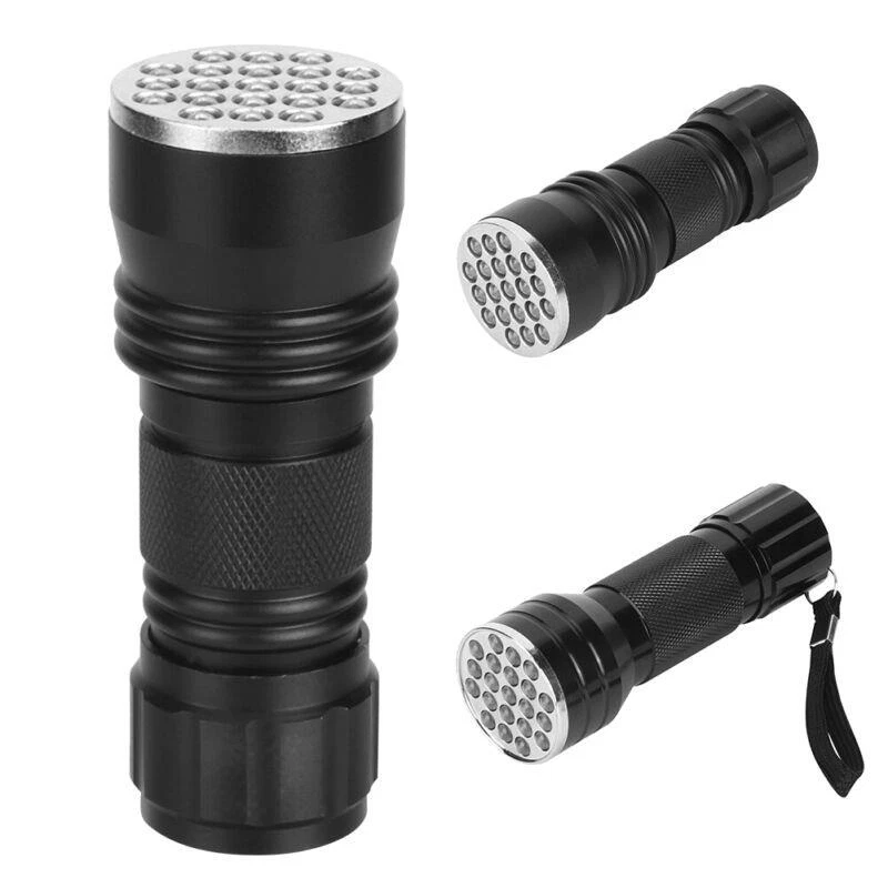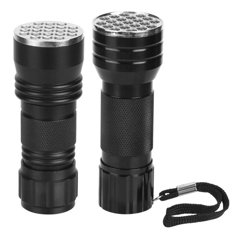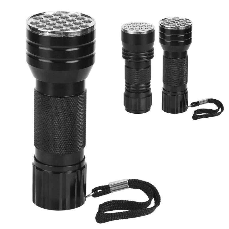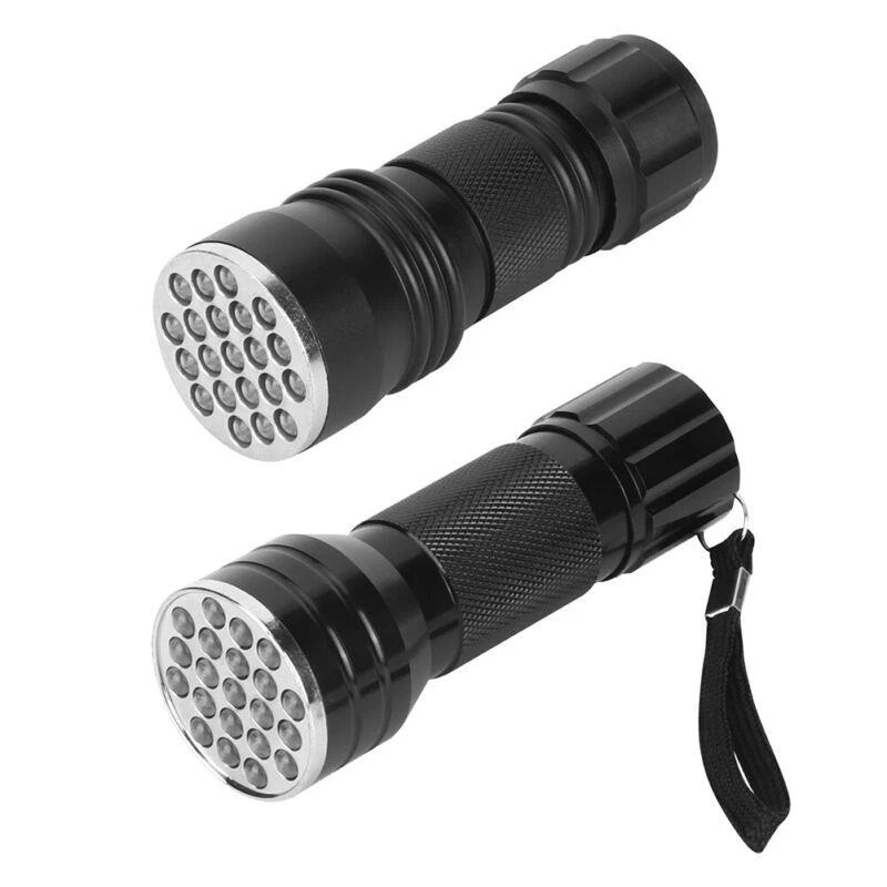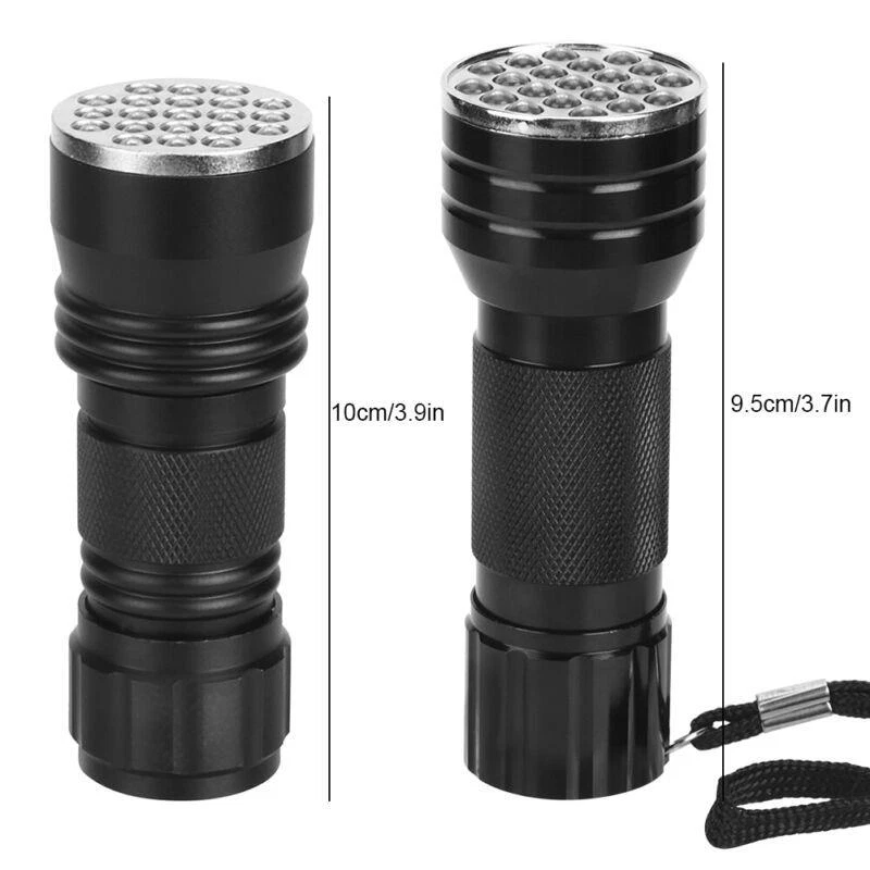 Features: - UV flashlight with 21 - Can check carpet stains left by cats, dogs, and other small animals - Can detect fluorescent agents in cosmetics, clothes, baby products, toiletries, etc. - Can easily catch scorpions - Emits 395nm wavelength for hunting scorpions and minerals - Made of high-quality aluminum alloy - Waterproof and durable - Exquisite anti-skid handle for safe and reliable use - Small and portable - Easy to use with heat dissipation - Suitable for checking notes, credit cards, fluorescent ink, broken glass, crime scenes, and outdoor activities Specification: - Condition: Brand New - Material: Aluminum alloy - Color: Black - Option: with strap, without strap - Length: approx. 10mm/3.9inch (with strap), approx. 9.5cm/3.7inch (without strap) - chip: 395nm (UV) - Power: 390-395nm - quantity: 21 - Battery: 3 x AAA battery (Not Included) - Lifespan: 100000H - Waterproof: IPX-4 Package List: - 1 x Flashlight Please note that the text provided does not contain any additional information related to the product.
