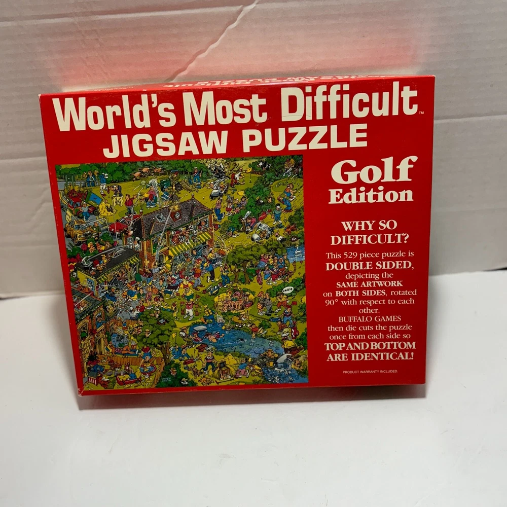 This Golf Puzzle is the perfect challenge for any puzzle enthusiast. With 529 pieces, it is considered one of the most difficult jigsaw puzzles in the world. The puzzle features a colorful and vibrant image of a golf course, making it a great addition to any collection. The puzzle is made of high-quality cardboard material and is double-sided, adding to its durability and enjoyment. It was manufactured by Buffalo Games Inc. in 1995, making it a classic and sought-after item. This puzzle is sure to provide hours of entertainment and a sense of accomplishment when completed.