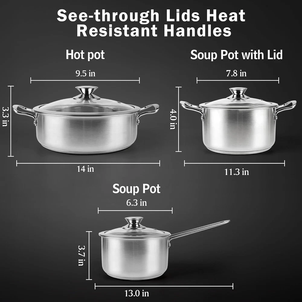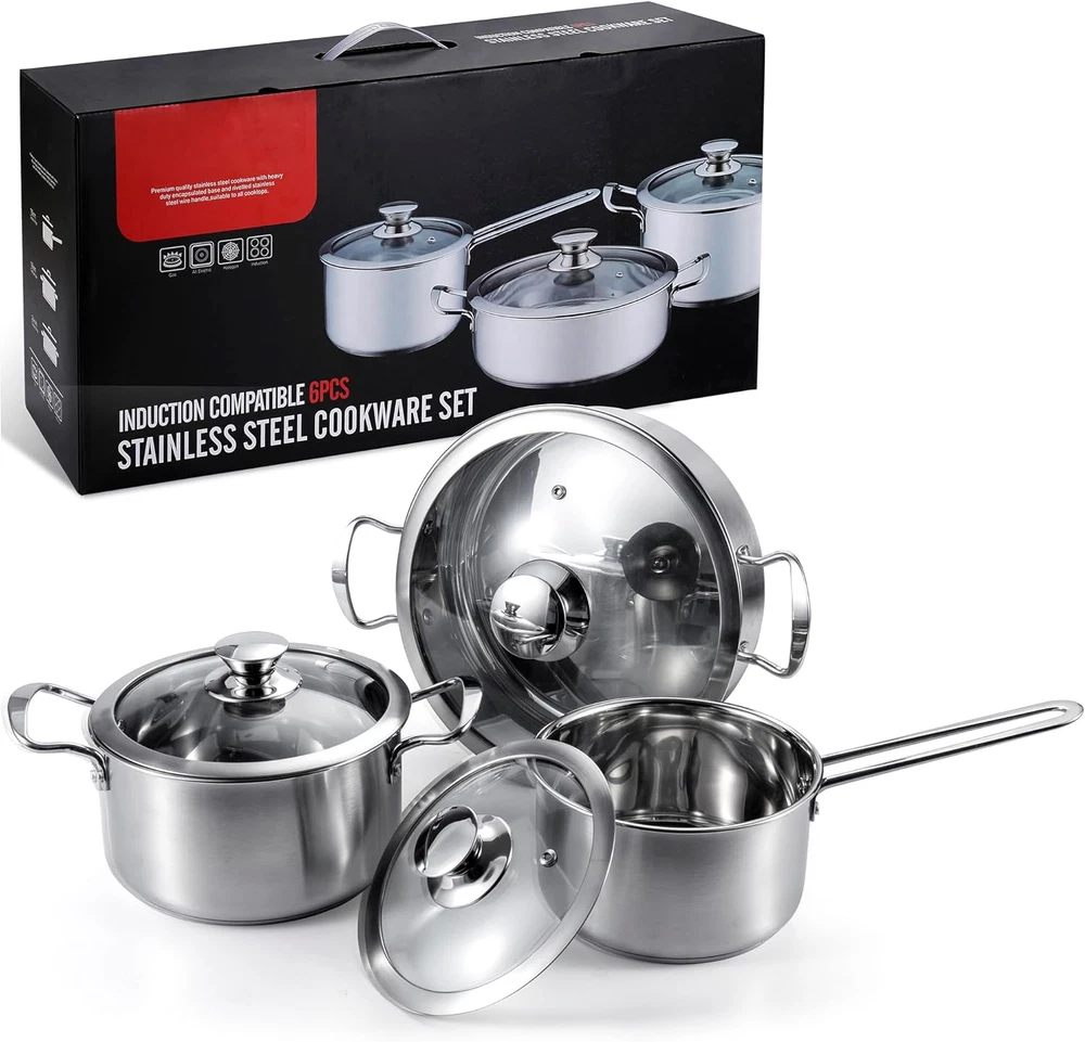 Store New Arrivals Add to Favorite View Feedback Contact Stainless Steel Pots and Pans Set, 6 Piece Kitchen Cookware Sets with Glass Lids, Stay Cool Handle, Works with Induction, Electric and Gas Cooktops, Non Toxic, Oven & Dishwasher Safe Description Capacity 2.6 Quarts Color Silver Product Dimensions 9.5"D x 14"W x 3.3"H Material Stainless Steel Material Type Stainless Steel Item Weight 6.5 Pounds Is Oven Safe Yes Finish Types Polished Finish Type Polished Item Dimensions D x W x H 9.5"D x 14"W x 3.3"H Size 6-Piece 【Exquisite Set Match】The ASKSCICI 6 pieces stainless steel pots and pans set is an excellent choice that satisfies both gifting needs and practical kitchen use. The set includes a 2 Qt Saucepan with Lid, a 2.6 Qt Stockpot with Lid, and a 3.7 Qt Stockpot with Lid, making it the perfect option for gifts and family cooking 【Seal In Flavors】The pots and pans in this set are equipped with tempered glass lids. These lids not only help to retain heat but also seal in the flavors of the food. During the cooking process, you can easily observe the changes in the food. This feature makes it very convenient to control the heat, ensuring safe cooking 【Stay Cool Handle】The set features solid riveted stainless steel handles. These handles are ergonomically designed, which means they are easy to grip and will not scald your hands, providing a comfortable and safe cooking experience 【Easy To Clean】This pots and pans set is easy to clean. It is dishwasher safe and oven safe up to 500˚F. Thanks to its scratch resistant surface, you can use scouring or steel wool pads to clean it without worrying about scuffing or wearing it down, even when using metal utensils 【High-Quality Materials】The pots and pans are made with a drip free pouring tri-ply construction. The first and third layers are made of stainless steel, which gives the set sturdy characteristics. The aluminum layer in between conducts heat evenly and consistently, ensuring excellent cooking results every time 【Use & Care】Before cooking, please preheat the pot and add oil or butter. Even and fast heating only needs medium or low heat to meet your cooking needs. Supports hand washing and dishwasher. After cleaning, it is recommended to wipe dry with a soft towel and place the pot in a dry and ventilated place Product Description ABOUT US We offer the best prices around on high quality products. Our E-store includes media such as books, movies, music and games while offering electronics, toys, sporting apparel, clothing, tools, general home, garden items and more. SHIPPING We are always working hard to ensure your package arrives as soon as possible. Please understand that some factors like weather, high postal traffic, and the performance of shipping companies are outside of our control. We offer free shipping to the lower 48 states and ship within 2 business days of payment, usually sooner. We do not accept P.O. Boxes. Please provide a physical address. For shipping outside of the continental USA, we only use eBay's Global Shipping Program.The item is shipped to KY and then sent to the rest of the world. International customers are responsible for all duties and taxes. Continue to check out in order to calculate costs for shipping the item to your country. Messages regarding eBay's Global Shipping Program MUST be directed at eBay EXCLUSIVELY. RETURNS We offer a 30-Day Return Policy on items which you are not completely satisfied with. You have the option for a full-refund or an exchange of the item. No returns are available on items shipped outside of the USA. PAYMENT We accept PayPal. CONTACT US This page content is yet to come Please ad us to your favorite seller and visit again later Thank You CUSTOMER SATISFACTION We try our very best to make sure every customer is completely satisfied. If there's a problem, message us! We're happy to help. WE ACCEPT Copyright © 2021 AutoDS. | All Rights Reserved