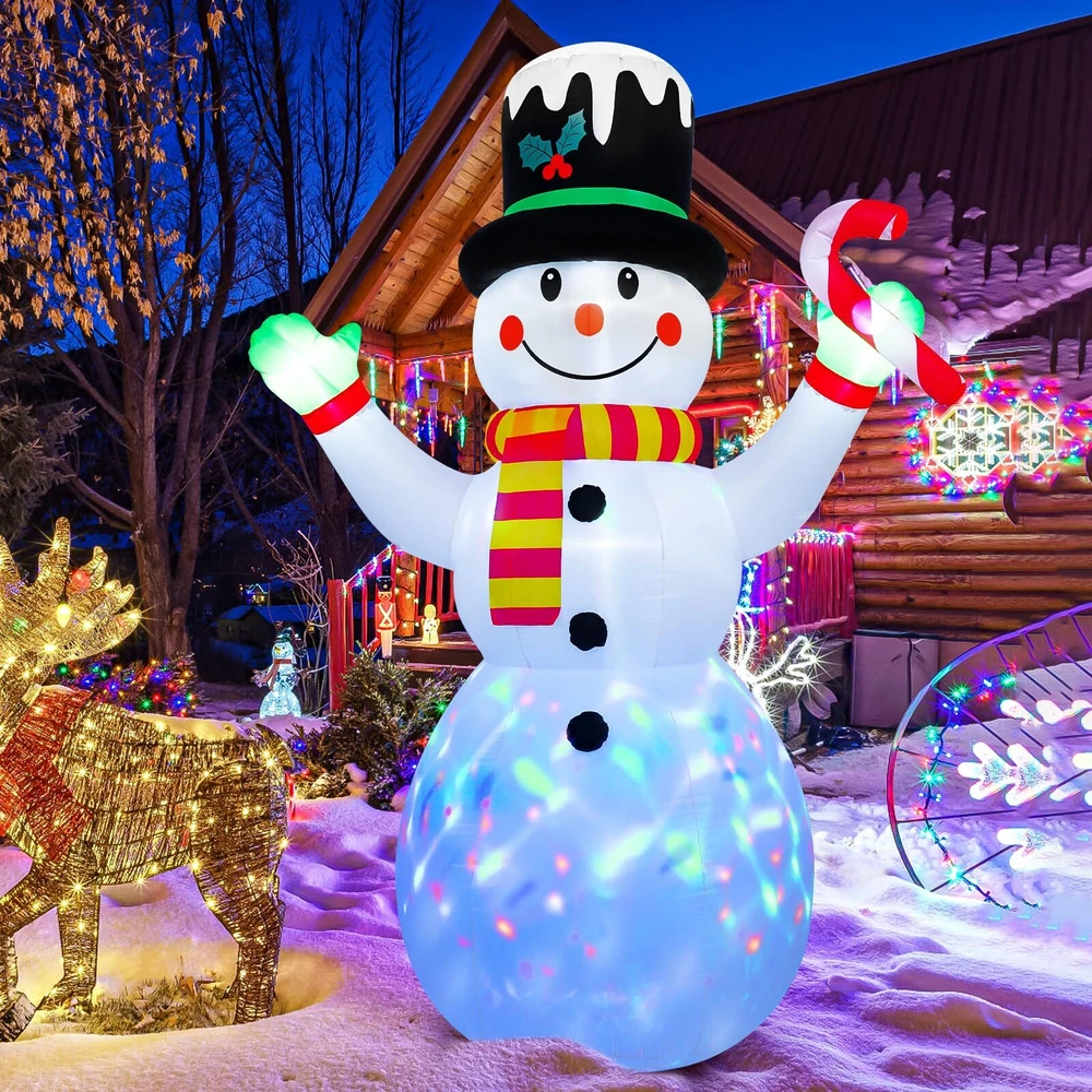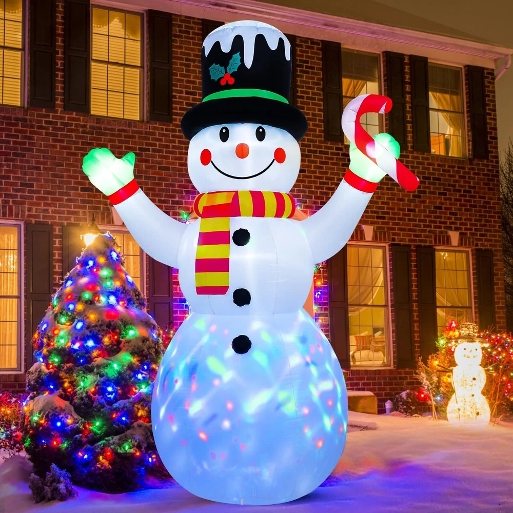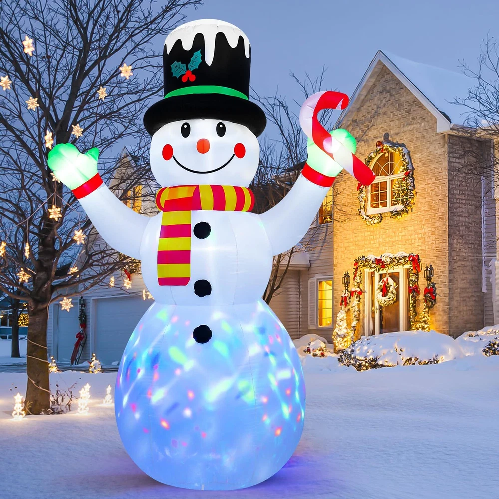 Christmas Yard Decoration: This 7 ft Christmas inflatable decoration is wearing a cute top hat and scarf, holding candy canes in his hand, with a happy smile on his face, extending his arms as if giving you a comfortable hug.This snowman inflatable brings a strong Christmas atmosphere and makes your family have a charming and enjoyable holiday time. Durable and Safety: This Christmas blow up yard decoration is made of thickened polyester fabric, which is not only more waterproof, wrinkle resistant, fade resistant, but also improves the tightness of the product and makes its service life longer.And the power plug is UL certified to ensure the safe and reliable operation of the product. Stable Use: The Christmas inflatable outdoor decoration is equipped with 6 ground inserts, 2 water bags, 2 pull strings. These accessories can effectively prevent the gingerbread man inflatable from being blown away when placed outdoors, making the product more stable. LED Lights & Scenes: Rotating magic colorful led lights are installed inside the inflatable Christmas decorations. When the power is connected, it will light up your night, bringing you a good Christmas atmosphere and attracting everyone's attention. The 7 ft Christmas inflatable is suitable for living room, garden, yard, party, doorway, patio, hallway, etc. Fast Inflating & Convenient Storage: This blow up Christmas decoration outdoor comes with an air blower that allows for quick and effortless inflation.After the holidays, simply deflate, fold, and store it in the included space-saving box for easy reuse next year.Note: Close the bottom zipper when inflating, and make sure that there is no obstruction at the blower.