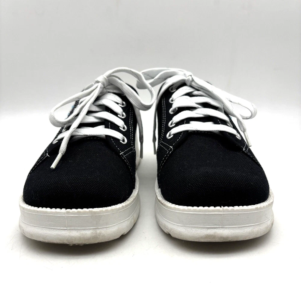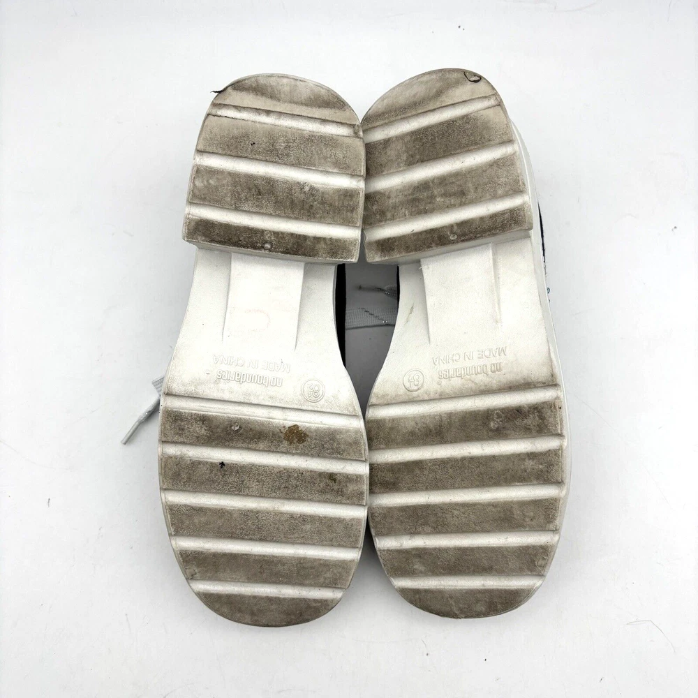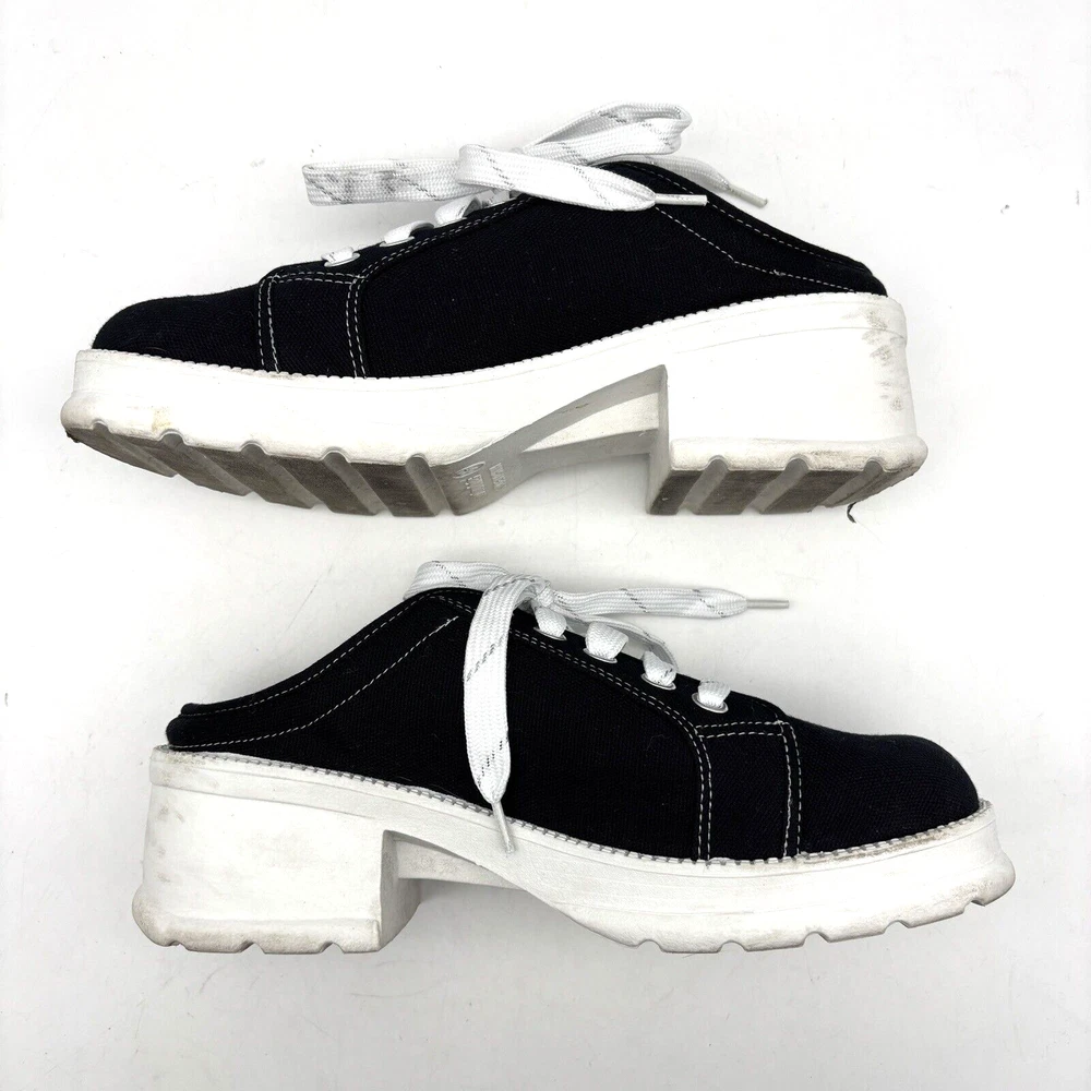 Vintage 90s Y2K No Boundaries Platform Sneakers Model: MICHELE Black Canvas Upper Lace Up Slip On Open Back Round Toe Block Heel Metallic Silver Embroidered Beaded Dragonflies on Sides Shoe Width: Standard 2.5" heel 1" platform Women's Size US 8.5 UK 6.5 EU 39 Great vintage pre owned condition. Gently owned. Mild wear on soles - shown in photos. Otherwise, no rips, tears, stains, holes or other notable flaws. Clean and from a smoke free home.