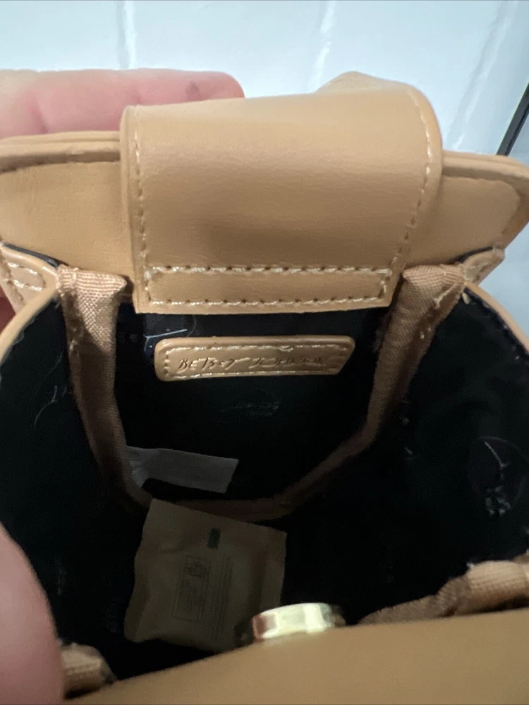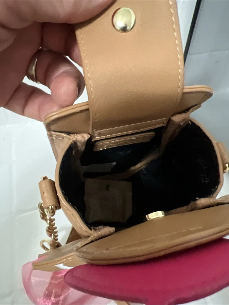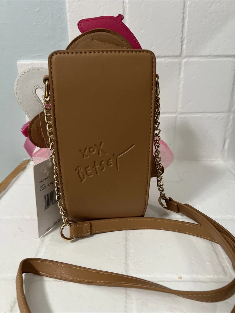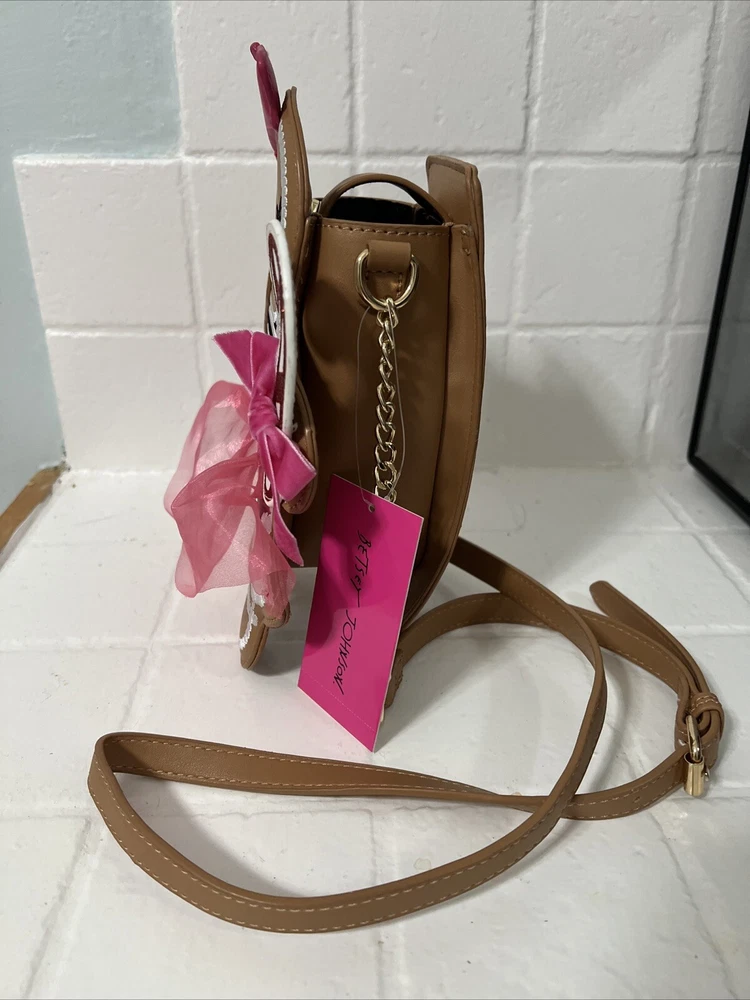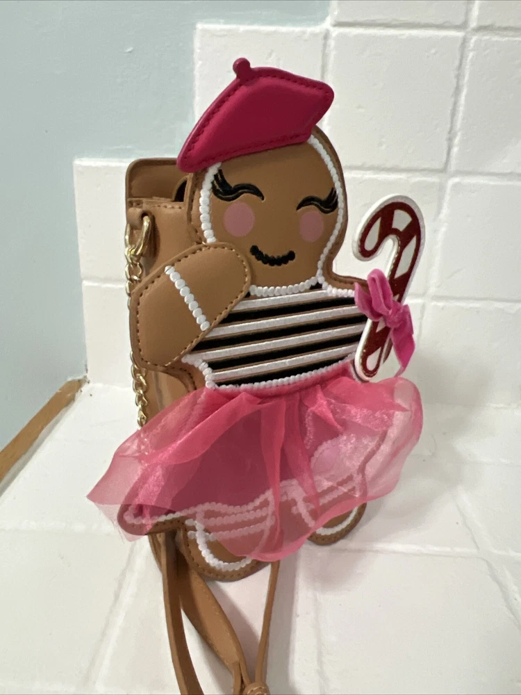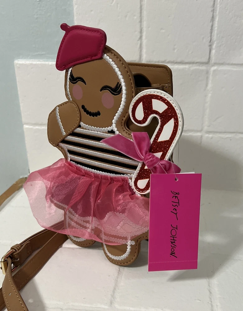 This limited edition Betsey Johnson crossbody bag features a festive gingerbread girl design with a colorful tulle skirt, glitter accents, and embroidered stitching. The bag has a magnetic snap closure and an adjustable crossbody strap with a light brown faux leather handle and gold chain accent. Measuring approximately 6.75 inches across the widest section, 3 inches in depth, and 10 inches at the highest point, this small bag is perfect for any occasion, from casual to formal, and is sure to make a statement with its unique design. The bag is lined with polyester and fabric and has a black lining color. The XO Betsey model is part of the Betsy XO product line and is suitable for women who love designer and holiday-themed accessories.