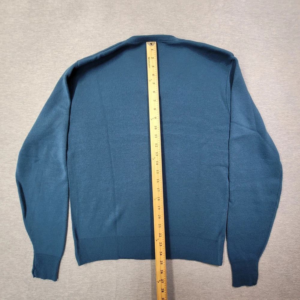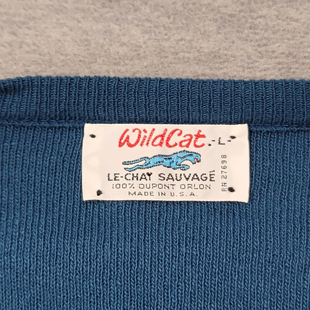 This vintage Wild Cat sweater is a must-have for any fashion-savvy man. Made in the USA, this pullover features a classic fit with a V-neckline and long sleeves. The blue color and solid pattern make it a versatile addition to any wardrobe. Crafted from high-quality cotton knit fabric, this sweater is both comfortable and durable. The Wild Cat logo accents the design, adding a touch of style and sophistication. Perfect for any occasion, this sweater is a timeless piece that will never go out of fashion.