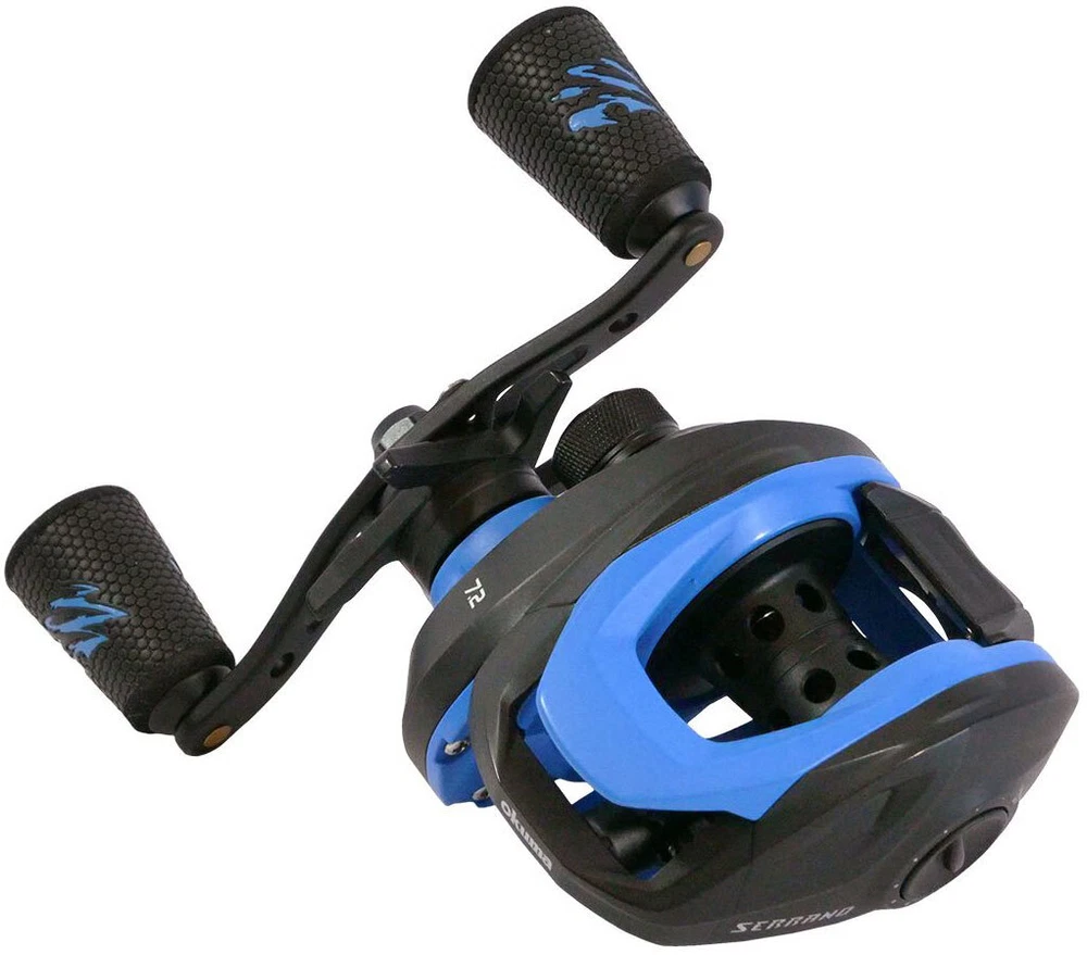 Okuma Serrano Baitcasting Reels boast a rigid, corrosion resistant frame and sideplate construction, Precision cut high strength brass main and pinion gears, and a 33.5mm machined aluminum black anodized spool at an economical price. Ask Seller a Question Free domestic shipping on most items The No.1 Source For All Your Fishing Needs 30 Day Returns Policy Description Okuma Serrano Baitcasting Reels boast a rigid, corrosion resistant frame and sideplate construction, Precision cut high strength brass main and pinion gears, and a 33.5mm machined aluminum black anodized spool at an economical price. Features: Rigid, corrosion resistant frame and sideplate construction Precision cut high strength brass main and pinion gears 33.5mm machined aluminum, black anodized spool 6BB + 1RB precision stainless steel bearing drive system Quick Set anti-reverse bearing for solid hook sets Externally adjustable magnetic cast control system Multi-disc drag washers for consistent performance Double paddle, 95mm aluminum swept handle arm TGT Grip: Traction Grip Technology Serrano reels are backed by a 1-year limited warranty Model Gear Ratio Bearings Line Retrieve Max. Drag Pressure Mono Capacity (yd/lb/mm) Retrieve Weight SRN100-A 6.5:1 6BB + 1RB 26.8'' 11 lb. 120/12 (0.31) 110/14 (0.33) 90/16 (0.37) Right Hand 7 oz SRN101-A 6.5:1 6BB + 1RB 26.8'' 11 lb. 120/12 (0.31) 110/14 (0.33) 90/16 (0.37) Left Hand 7 oz