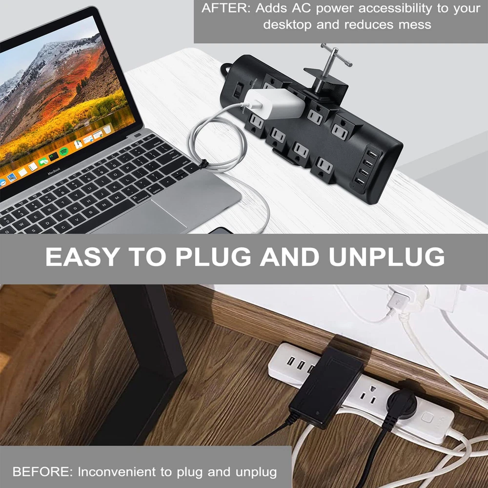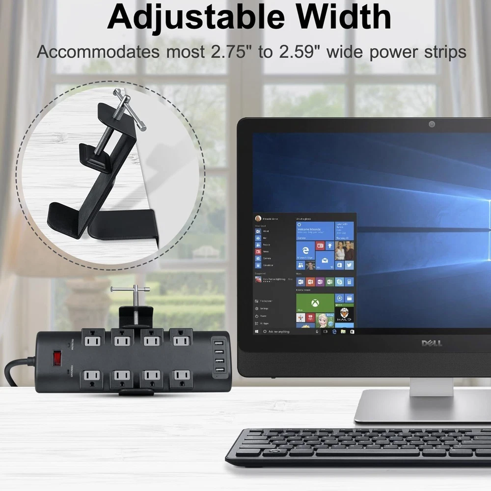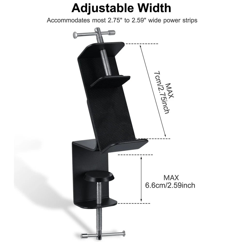 🗜️ Easy Use 🗜️ With Power Strip Clamp you don't need to put the plug into a place for the sake of desktop tidiness, nor do you need to be behind the desk or bend down to the ground to plug and unplug the power. 🗜️ Adjustable Use 🗜️ Fix the Power Strip Holder on the desk (0.4 to 2.75 inches thick), the width of the Power Strip (2.55 to 4.13 inches) it will fit, and does not require any punching holes. Desk Clamp also uses a rubber gasket as protection, and after the overall installation you will find that it meets your requirements for the drain plug without affecting the neatness of your desk. 🗜️ Space Saving 🗜️ The Table Clamp features a slim metal design with a 45° tilt designed to maximize your use of space. Even if the table is against the wall, it can still be used. 🗜️ Sturdy Durable🗜️ Power Strip Table Clip are made of high quality metal for stability and durability. It can be easily replaced with other widths of power strip. 🗜️ Flexible Change 🗜️ No need to buy a power strip with clips just to want a clip, because many times what we are missing is not a power strip, but an Power Strip Mount.