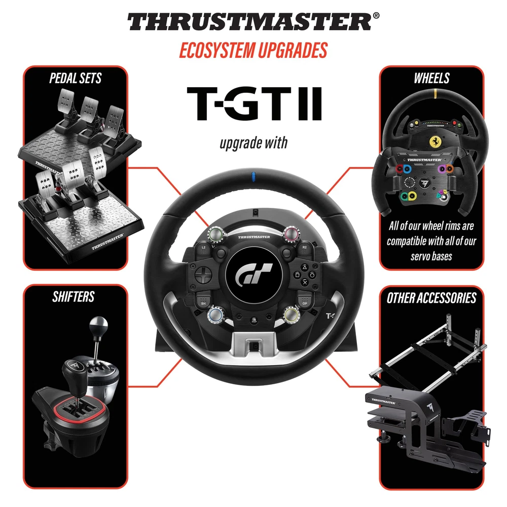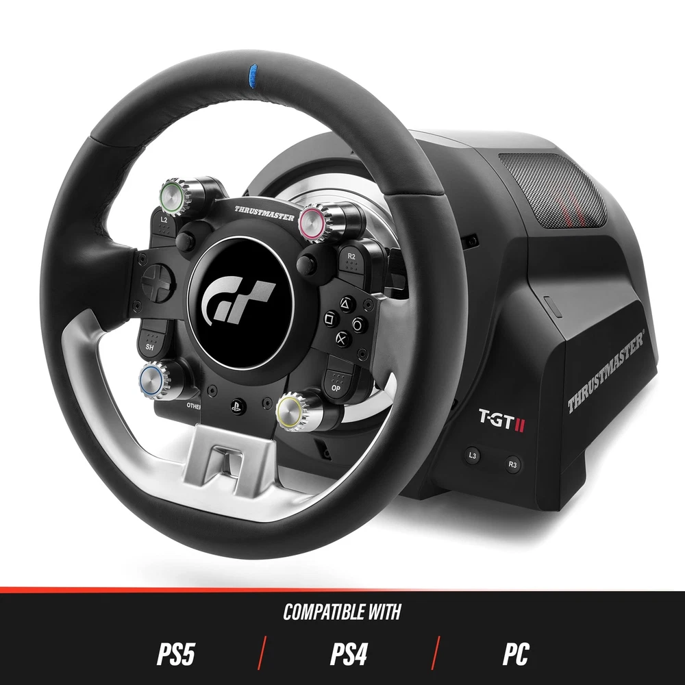 THRUSTMASTER T-GT II Force Feedback Racing Wheel (compatible w/ PS5, PS5 Pro, PS4 & PC) Description T-GT II keeps providing direct access to the same features in Gran Turismo Sport as its predecessor. Features: Leather-wrapped wheel with 25 action buttons, 1 push-button and 4 rotary selectors natively recognized in GT Sport (differential braking, traction control, fuel mapping, torque management) High-velocity, next-generation 40-watt brushless motor for exceptionally responsive Force Feedback with high torque capacity Internal components from the European automotive industry (AEC-Q), for maximum quality and lifespan Proprietary magnetic technology (H.E.A.R.T) for an unlimited lifespan and optimal precision Quick and easy wheel changing system, allowing for different types of wheels (F1, Rally, etc.) to be used (sold separately) Product Details: Release date: December 7, 2021 Type of item: Video Game Item model number: 4169099 Item Weight: 31 pounds Manufacturer: Thrustmaster Country of Origin: China Date First Available: November 30, 2021 Handling We will ship all orders within 3 business days of payment. Delivery We do not ship outside of the Continental US. Feedback We take our reputation seriously, we buy and sell online, so we understand the value of trust. If you are unsatisfied with your order, please contact us and we will work with you to resolve it to your satisfaction.