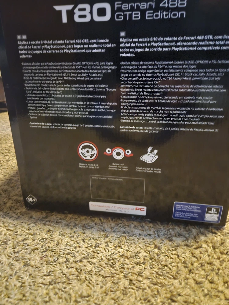 THRUSTMASTER T80 FERRARI 488 GTB EDITION IS BRAND NEW NOT BEEN OPEN AND IT IS STILL IN THE SAME BIX THAT IT CAME IN AND IT IS GOING UP FIR BIDD OR BUY IT NOW THE BOX HAS NO DENTS AND NO SCRATCHES ON THE BOX YOU ARE BUYING THIS ASNIS AND IT IS BRAND NEW STILL IN THE BOX THERE ARE NO RETURNS OR REFUNDS. IF YOU NEED MORE INFORMATION SEND ME A MASSAGE ON HEAR PLEASE AND THANK