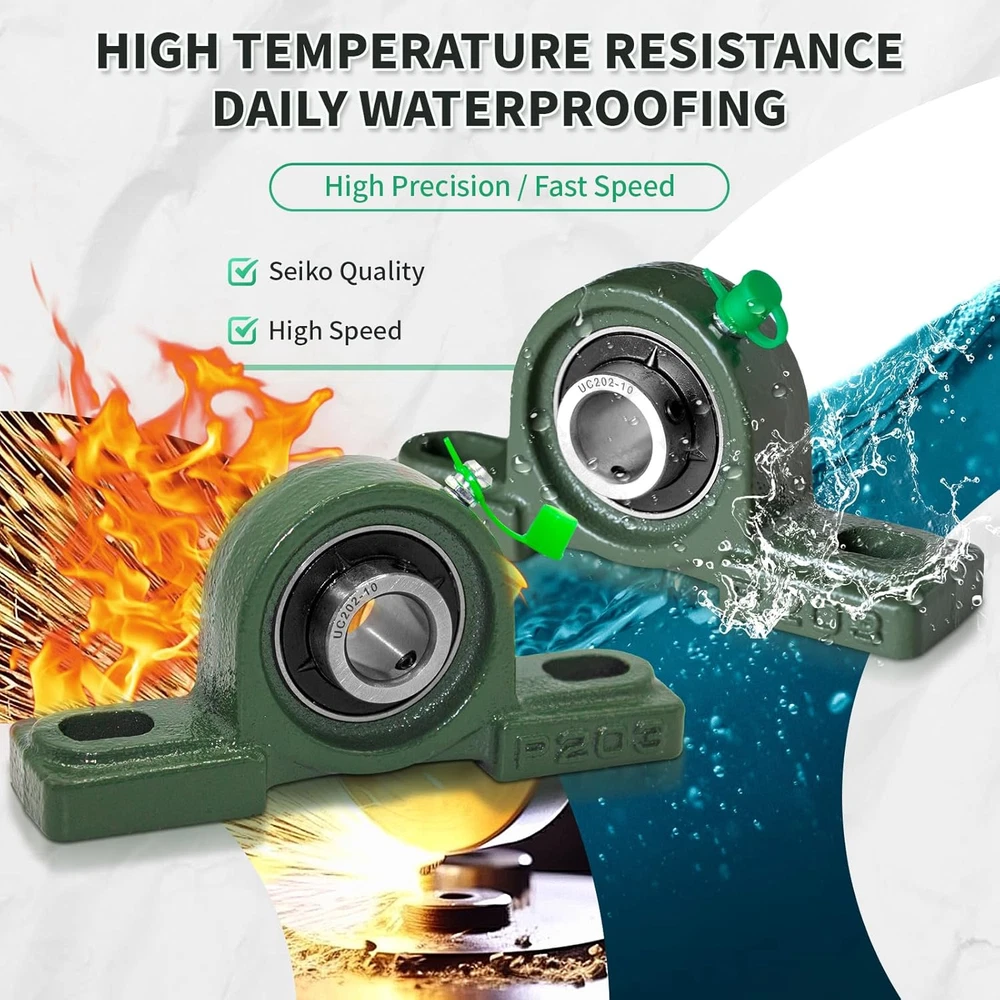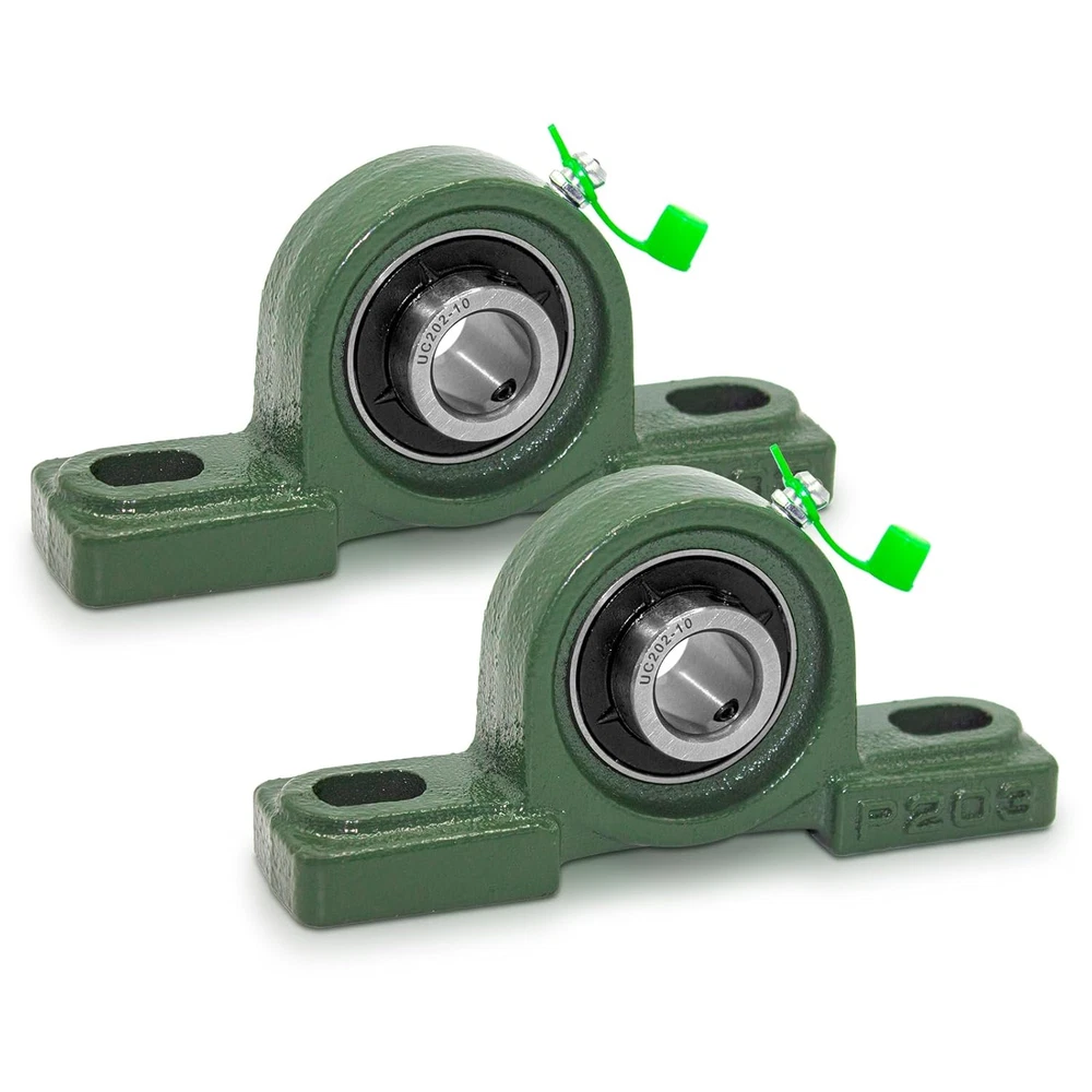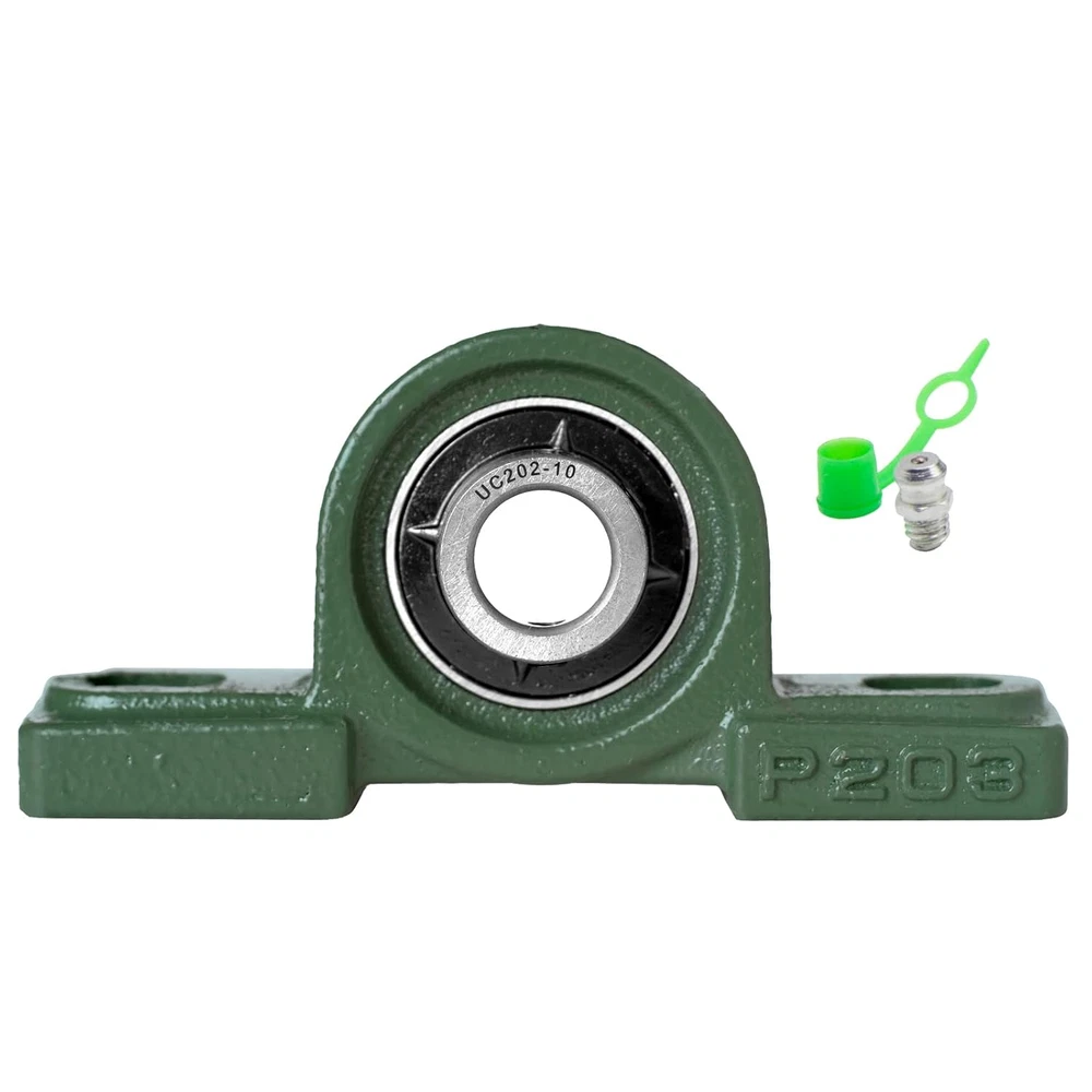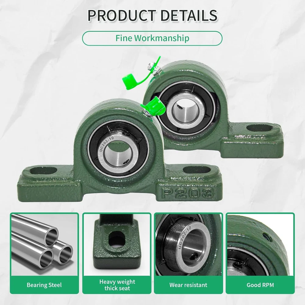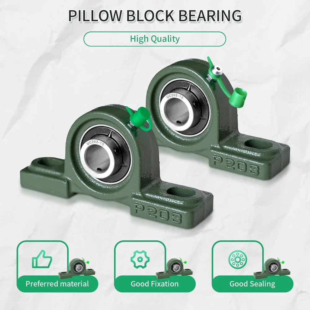 Robust Design: The UCP pillow block bearing series features a secure two-bolt mounting with set screw locking, ensuring stability and reliability. Durable Construction: Crafted with a solid base, Grewirifc pillow blocks eliminate cavities, enhancing bearing strength, preventing material build-up, and simplifying maintenance. Self-Aligning Performance: Wide inner ring ball bearings with self-aligning spherical outside diameters compensate for shaft misalignment, ensuring optimal functionality. Ready-to-Use and Maintain: Pre-lubricated for immediate installation, these pillow block bearings come with a supplied grease fitting for easy re-lubrication, reducing maintenance efforts. High-Quality Material: Made to last, the pillow block bearings consist of chrome steel (AISI 52100) ball bearings, providing exceptional resistance to wear and tear for long-lasting performance. Product Description At Grewirifc, a leading provider of high-quality bearings, including our UCP, UCF, and UCFL series pillow block bearing, designed to meet the demanding needs of various industries with reliable support for rotating shafts. Grewirifc's UCP202-10 Pillow Block Bearings Features Premium Quality Material: Constructed with high-strength cast iron housing for exceptional durability and stability in demanding industrial environments. Precision Engineering: Engineered with precision to ensure smooth and efficient operation, minimizing friction and vibration for optimal performance. 5/8 Inch Bore Diameter: Designed to accommodate 5/8 inch diameter shafts, offering compatibility with a wide range of machinery and equipment. Easy Installation: Equipped with pre-drilled mounting holes and set screw locking mechanism for quick and hassle-free installation, ensuring secure attachment to shafts. Versatile Applications: Ideal for various industrial applications including conveyor systems, agricultural machinery, material handling equipment, and more, providing reliable support for rotating shafts. Grease Fitting for Lubrication: Includes a grease fitting for convenient re-lubrication, extending the bearing's service life and reducing maintenance requirements. Designed for easy disassembly without the need for specialized tools, allowing for quick maintenance and replacement of components. Utilizes modular design principles, enabling individual components to be easily removed and replaced without requiring disassembly of the entire unit. UCP202-10 Pillow Block Bearings - 5/8 Inch Bore Diameter Solid Cast Iron Housing Item UCP202-10 Pillow Block Bearings Bearing Type Pillow Block Bearing Model UCP202-10 Material High-strength cast iron Bore Diameter 5/8 inch Shaft Size Compatibility 5/8 inch Housing Type Solid Bearing Insert Material Chrome steel Mounting Type Two-bolt mounting with pre-drilled holes Seal Type Contact seal The UCP202-10 Pillow Block Bearings have a wide range of applications across various industries due to their versatility and reliability The UCP202-10 Pillow Block Bearings find applications in industrial machinery, agricultural equipment, material handling, HVAC systems, mining, construction, food processing, automotive components, pumps, and compressors, providing reliable support for rotating shafts across diverse industries.