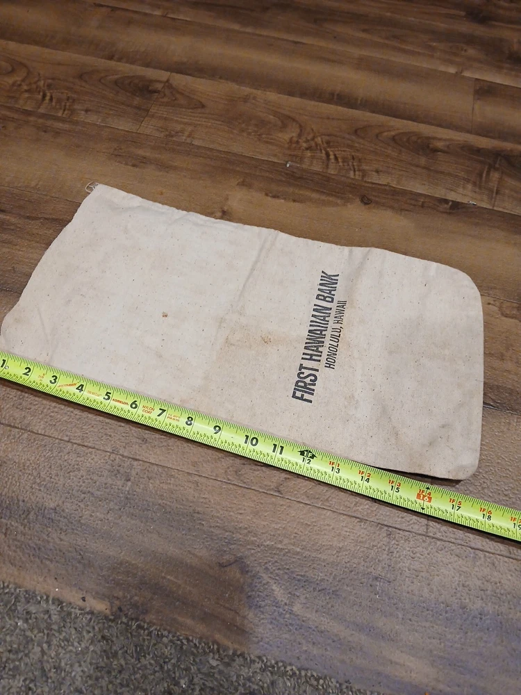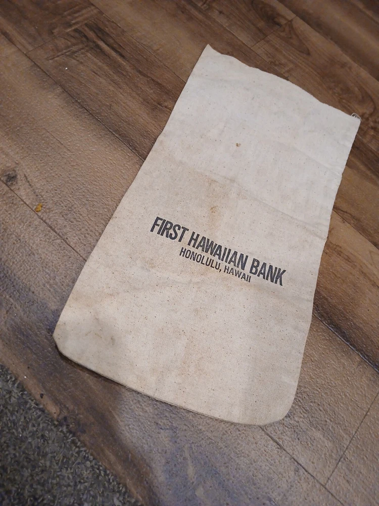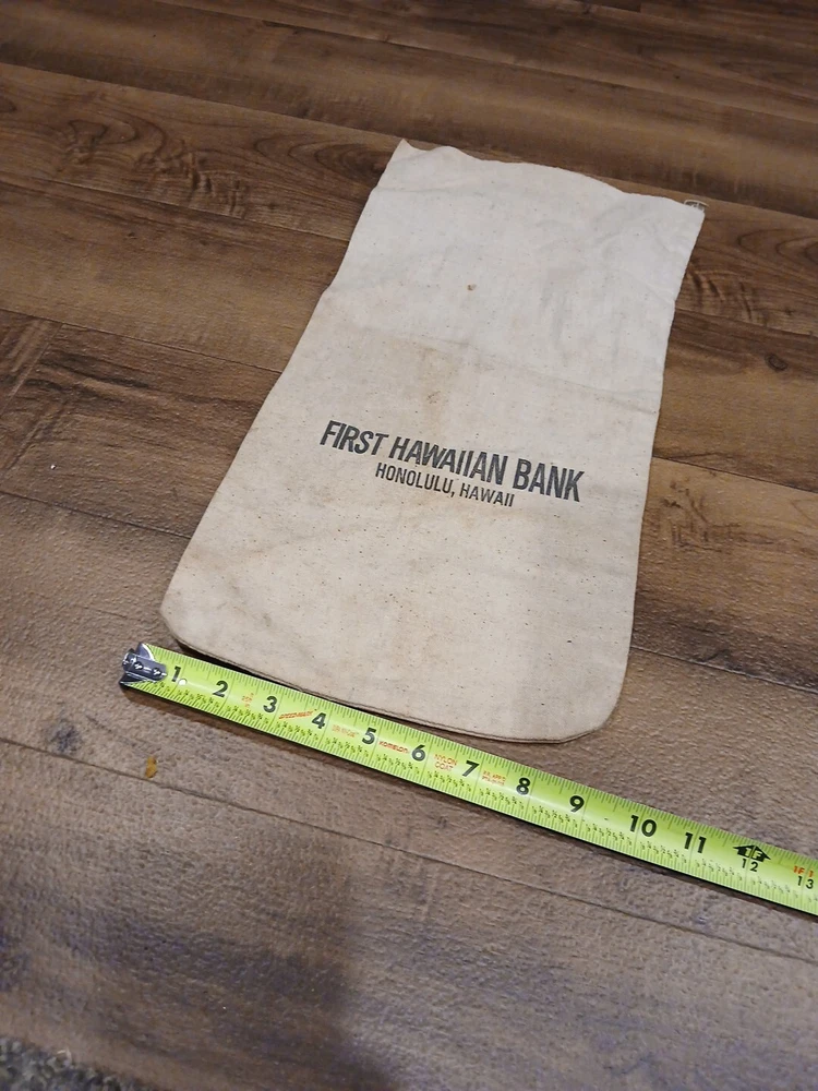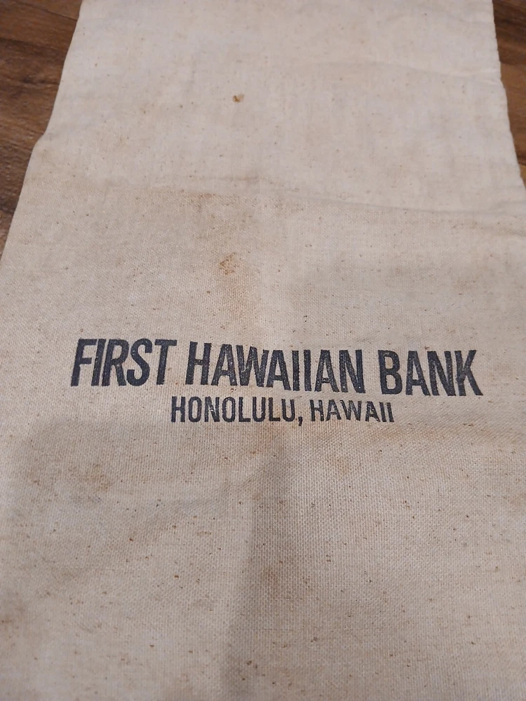 This vintage canvas coin cash bag is a rare find for collectors of historical memorabilia. The bag features the logo of the Hawaiian Bank in Honolulu and is designed for storing and organizing coins and cash. It is a perfect addition to any collection relating to banking and insurance. The bag is made of durable canvas material and has a spacious interior that can hold a significant amount of coins and cash. It is a great conversation starter and a unique piece of history that will make a great addition to any collection.