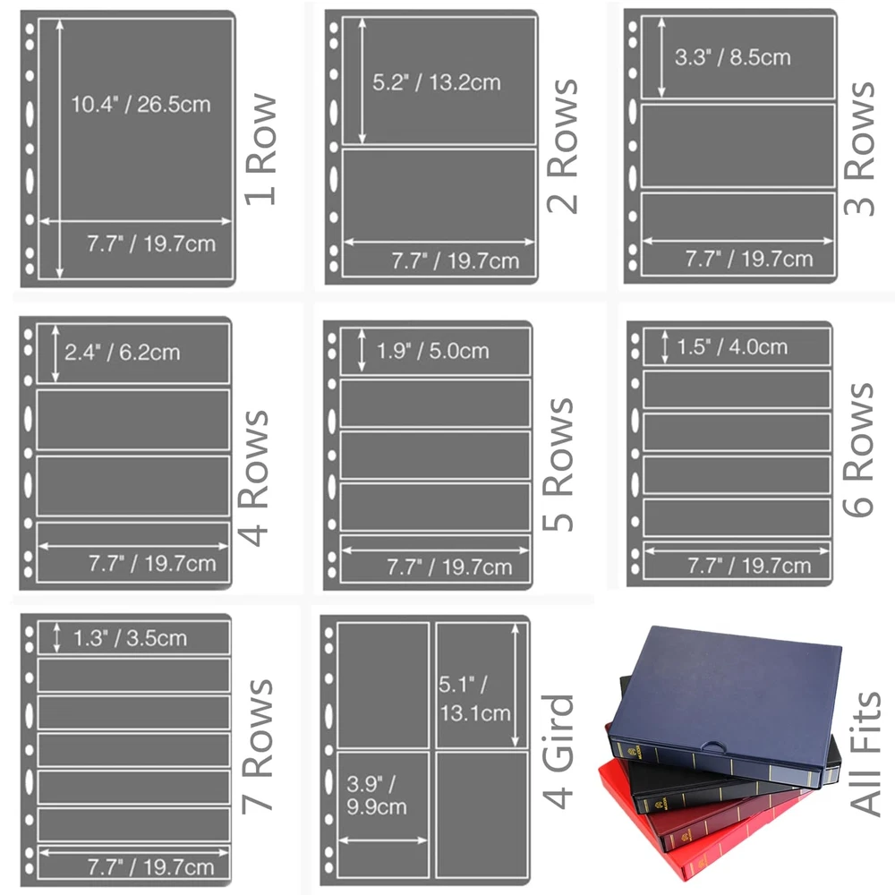 Compatible any 8 1/2" x 11" size 4-ring or 9 hole sheet, The best choice is pages. Fits page size: 210mm x 280mm Premium 4-ring binder, D-shaped design buckle. Binder Size:12 3/5"x9 4/5" x 2 2/5" (320 x 250 x 60 mm),Fits page size: 210mm x 280mm. Suitable for stamps, coins and postcard inner pages, it can holds up to 35 stock sheets (8 1/2" x 11") . Compatible any 8 1/2" x 11" size 4-ring or 9 hole sheet, The best choice is pages. There is a label bag at the bottom of Spine, which can be put into the label for easy classification.