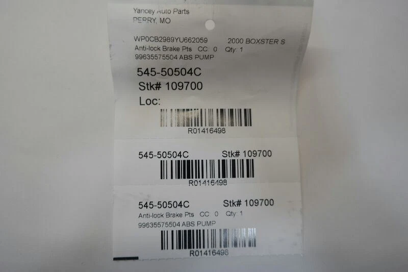 Powered by Frooition Home About us Returns Policy FAQs Contact Shop Categories All Categories 00 PORSCHE BOXSTER ABS ANTI-LOCK BRAKE PART ASSEMBLY OEM Item Description This listing is for a USED 00 PORSCHE BOXSTER ABS ANTI-LOCK BRAKE PART ASSEMBLY OEM. This part was removed from a 2000 BOXSTER S stock number 109700 and the mileage was 94000 miles. Part Condition Notes: 99635575504 ABS PUMP This part will fit these makes and models with these options: PORSCHE 911 00 Assembly; Carrera (RWD), w/o Porsche Stability Management; w/o traction control PORSCHE 911 01 Assembly; exc. turbo; Carrera (RWD), w/o Porsche Stability Management; w/o traction control PORSCHE BOXSTER 00 Assembly; w/o locking differential; w/o traction control and automatic limited slip differential About Us About Us Payment Shipping Terms Returns About Us Located on 26 acres in rural Perry, Missouri, Yancey Auto Parts has a large inventory to meet your needs. You won't find a better selection of recycled late model auto and truck parts (foreign and domestic). Payment Payment We accept immediate payment using a credit card via PayPal only. Sales tax will be applied to all orders shipped to the state of Missouri. ALL ENGINES ARE SOLD AS LONG BLOCKS. ANY ITEMS THAT ARE INCLUDED ARE CONSIDERED CONVENIENCE ITEMS AND ARE NOT COVERED UNDER WARRANTY. Shipping Shipping Yancey Auto Parts ships to US addresses within the 48 states only via UPS ground. No Alaska, Hawaii, Puerto Rico, APO, FPO or PO Box please. Freight items are shipped through a variety of carriers. Please send us an email with you zip code for a freight quote. The cheapest freight is to a commercial address with means of unloading the item, ex. Loading dock, fork lift, etc? Items can also be picked up at the nearest freight terminal of carrier for this price. Pick up at our facilities is available. Please contact us prior to your purchase to arrange pick up. Taxes will apply for local pick up. Items will be shipped within 1-2 days of purchase. Please allow 5-10 days for delivery. Most areas in the US are within 5 days. If an item arrives damaged, please contact us within 24 hrs for instructions. Terms Terms STANDARD PARTS ONLY WARRANTY applies for all in stock parts, and covers 90 days from the date of purchase unless noted on the original invoice at the time of sale. This warranty applies to the original purchaser and covers the parts only and does not cover any labor. In the event of a part failure, the part will be replaced with a similar like, kind, and quality part. If a part is not available a refund will be made in the amount of the original part price. Warranty is Null and Void if: -The vehicle is used for off-road or racing use. -The part is installed in an application for which the vehicle manufacturer did not intend for the vehicle. -Failure is caused by abuse, misuse, or modifications. -The part fails or becomes defective due to the vehicle being involved in a collision, fire, theft, vandalism, or any form of disaster. -The part is sold ?As Is? as indicated on the front of the invoice. -The vehicle is not serviced at proper intervals, or fuel/oil/coolant is not used in accordance with the vehicle manufacturer?s specifications. -The engine oil and filter are not replaced and documented every 3000 miles with appropriate OEM recommended motor oil. (Must be documented) -The transmission fluid and filter are not replaced at time of installation with OEM recommended transmission fluid. (Must be documented) -Warranty is void if the heat tab(s) are removed or melted. -Warranty is void without original receipt. Terms and Conditions -Approval for repairs or replacements must be approved by Yancey Auto Parts prior to any work being performed. -We reserve the right to inspect any product prior to replacement. -Labor is only included if expressly stated on the invoice. -Appropriate maintenance records are required. -This warranty is not transferable. -Windshield and other glass breakage are not covered under this warranty. -This warranty does not cover associated shipping costs or similar damages. -This part may have accessories that are attached, and must be switched or removed to accommodate proper installation, which is the responsibility of the installer. Such accessories have been included to aid in the convenience of installation and are not covered by this warranty. Engine warranties are limited to defects in the block, heads, pistons, crankshafts, camshafts, rockers, and bolts. All other parts that may be provided are ?Accessories and Extra Parts.? No warranty is provided for any such parts that are attached, including parts such as switches, sensors, cables, electronics, belts, hoses, water pumps, and manifolds. -Water pump, timing belts, thermostat, spark plugs, fluids and seals are routine maintenance items and should be replaced at the time of installation and at the vehicle manufacturer?s recommended service intervals. -We are not responsible for injury or damages during, or as a result of the installation of our product. -Transmission: It is the responsibility of the installer to replace the radiator or transmission oil cooler, flush the transmission oil cooling lines, fill differential, adjust shifter mechanisms, replace filters, seals, pan gaskets, and reset or replace computer codes when installing a transmission. -Engine: All claims associated to overheating and/or improper lubrication of the engine or its components are not covered by this warranty. ALL ENGINES ARE SOLD AS LONG BLOCKS. ANY ITEMS THAT ARE INCLUDED ARE CONSIDERED CONVENIENCE ITEMS AND ARE NOT COVERED UNDER WARRANTY. -Gaskets, fluids, seals, filters or other materials are not warranted -Oil leaks are not guaranteed -Suspension: Wheel bearings, tie rod ends, ball joints, and bushings related to steering and suspension components are not covered by our warranty and should be inspected and replaced as needed by the installer. Important Notices -All implied warranties, including warranties 