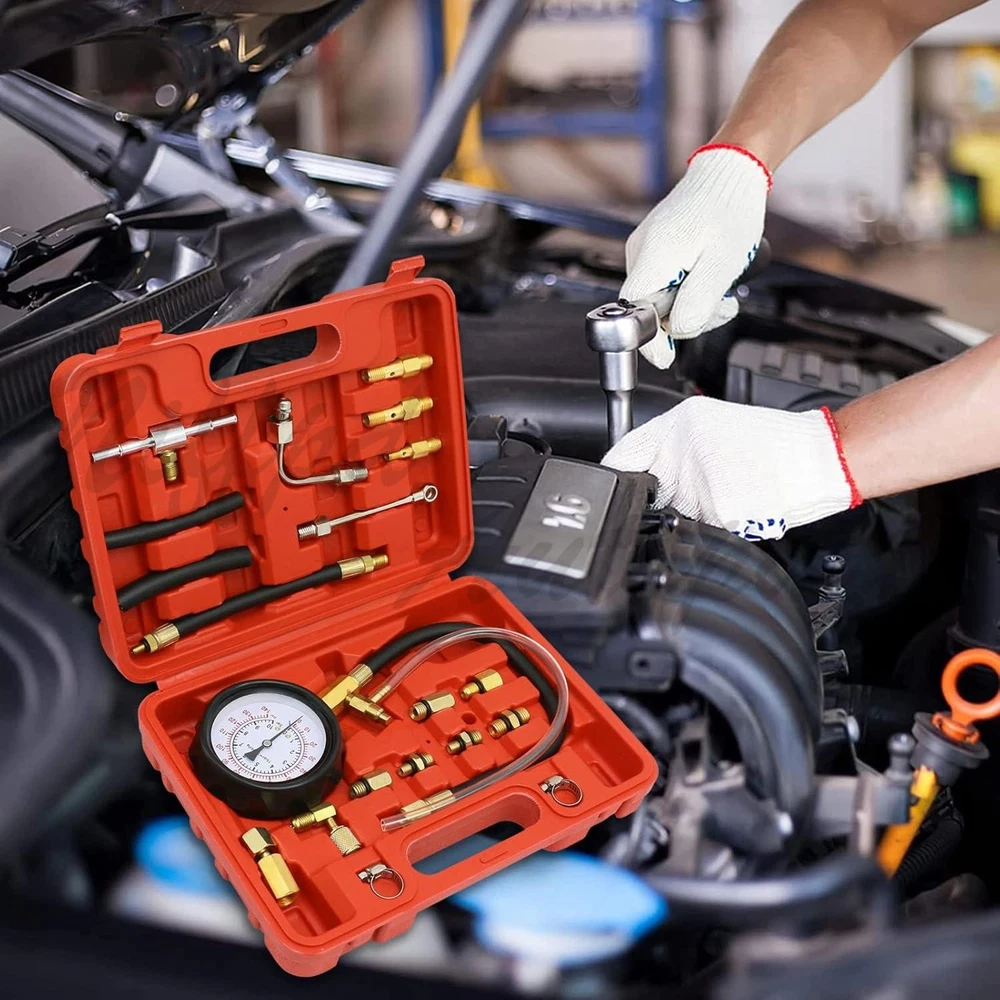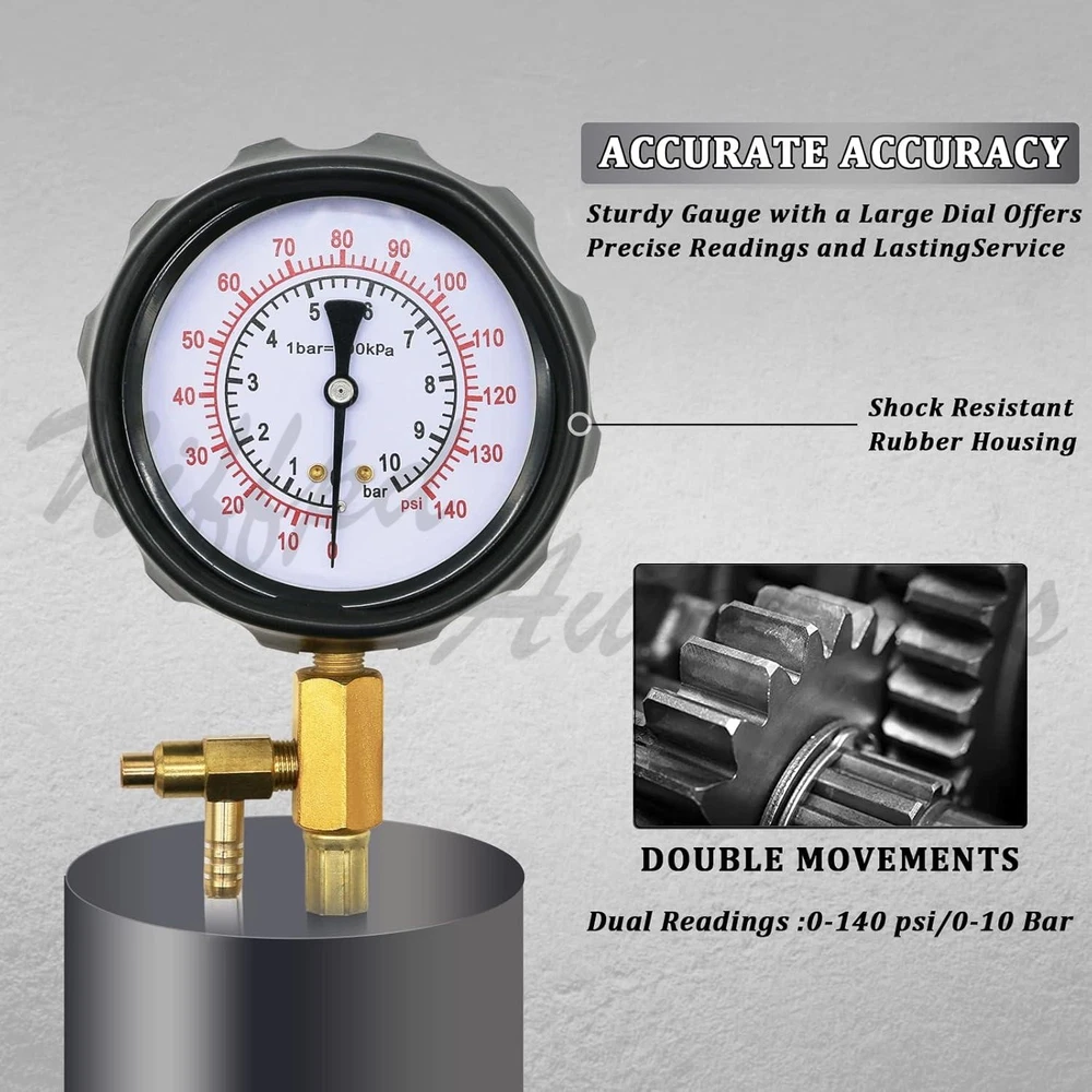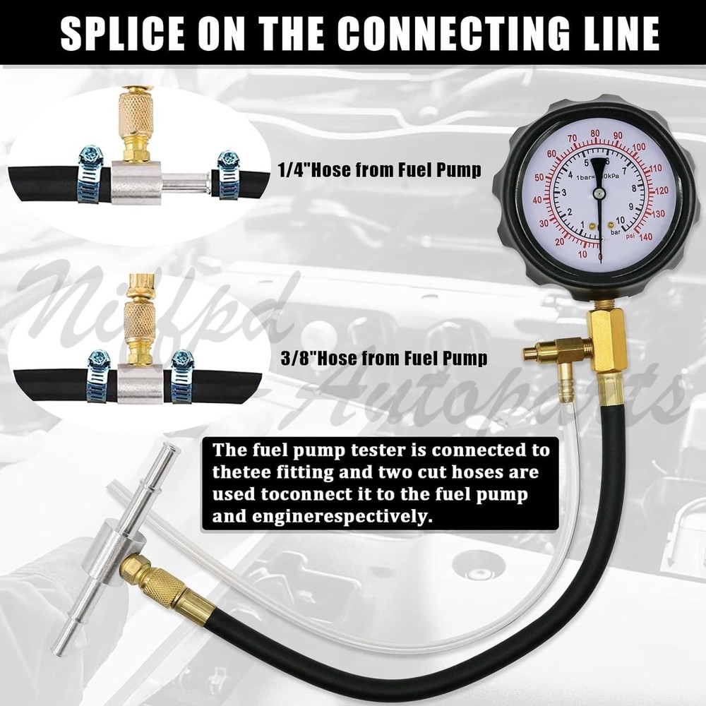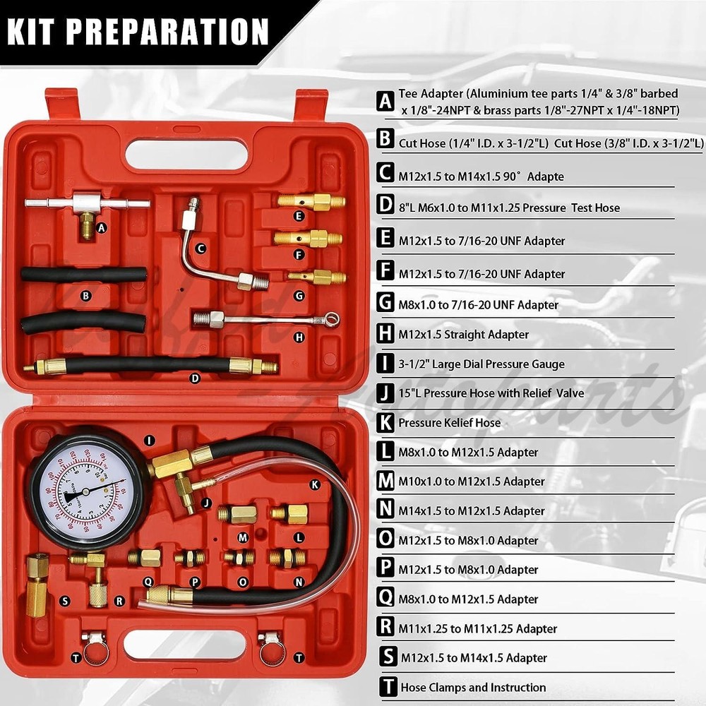 Product Description 0-140PSI Fuel Injection Pump Pressure Tester Injector Pump Pressure Gauge Kit US Description: With automatic diagnosis function: fuel pressure gauge automatic diagnosis tool, suitable for fuel injection pump tester. Protector: The assembly is equipped with a quick connect system and safety valve to prevent accidental discharge of fuel under pressure. Safe Fuel Recovery: The gauge features a pressure relief valve on the side and a long drain hose for safe fuel recovery. PERFECTLY EQUIPPED: Kit includes copper adapters and accessories for modern schrader test port fuel injection systems. Reading Range: 90mm pressure gauge equipped with two scales (psi and bar), reading range from 0 to 140 psi and 0 to 10 bar. Feature: 1. Complete accessories 2. The connecting hose is durable under pressure 3. Pressure gauge measurement accuracy 4. Combined CNC machine tool processing, more precise 5. Simple operation, convenient use and reasonable design 6. 90mm professional double scale head, plexiglass surface 7. Suitable for all kinds of small cars 8. Head measurement range: 0-140 psi (0-10) bar 9. The workbench is equipped with a pressure reducing valve, which is safe and fast. Application: 1. Comprehensive diagnosis of automobile fuel pressure. 2. Detect the leakage of the fuel injector 3. High temperature and oil resistant instrument Method: Use the tee fitting to measure the fuel pressure gauge on the line between the fuel pressure regulator and the injector. The measured values can be used to judge the operation of fuel system components such as electric gasoline pumps and oil pressure regulators. NOTE: 1. Pay attention to ventilation to prevent fire 2. Be sure to release the pressure before removing the oil pipe 3. The oil pipe shall not have aging leakage. Fitting size: 1# AdaptorM10X1&M12X1.5 2# AdaptorM12X1.5&M14X1.5 3# AdaptorM8X1&M12X1.5 4# AdaptorM8X1&M12X1.5 5# Adaptor7/16-20UNF 6# Adaptor7/16-20UNF 7# Adaptor7/16-20UNF 8# AdaptorM10X1 9# Adaptor7/16-20UNF 10# Adaptor7/16-20UNF&M12X1.5 11# Adaptor7/16-20UNF&M12X1.25 12# Adaptor7/16-20UNF&M12X1.5 13# AdaptorM8X1&7/16-20UNF 14# AdaptorM12X1.5&M14X1.5 Package List: 1x 3-1/2" big dial pressure gauge 1x 14"L long hose with 1/4" Female brass parts 1x 8"L short hose with 1/4" Male x M6 brass parts 13x Brass parts 2x Hose clamps 1x T type parts (Aluminium tee parts 1/4" & 3/8" barbed x 1/8"-24NPT & brass parts 1/8"-27NPT x 1/4"-18NPT) 1x Hose (1/4" x 3-1/2"L) 1x Hose (3/8" x 3-1/2"L) 1x Instruction manual 1x Red storage box About Us Payment Shipping Returns Contact Us We are NOT selling products. We are selling SERVICES! This is our philosophy in this ebay business. Our goal is to provide excellent before and after sales services to all our customers. If there is any issue about the item, please contact us before leaving feedback. Working time: CST+8 9:30 to 18:30, Monday to Saturday We will much appreciate with fast payment ,thank you so much! 1. We ship from USA Stock. We will provide a tracking number after shipping. 2. We will process and ship the package within 1-3 business days. 1. We put buyer's satisfaction at top priority. If you're not pleased with your purchases, we'll be happy to make an exchange or refund the item total price less Shipping and Handling (S&H) charges within 30 days of your purchases. 2. For any Exchange, Refund or Return, the item must be in its original condition, including the box, packaging, and all the accessories or gifts. 3. We'll provide prepaid return shipping label if the return is a result of our error. Postage reimbursement is offered only on standard mails, and it needs to be approved by our staff prior to returning. 4. Please allow up to 7 business days for returns to be processed. 5. Shipping and Handling (S&H) charges are not refundable. 1. Customer satisfaction is very important to us and our feedback rating reflects this satisfaction. If you have any question or concern, please contact us via eBay message. 2. We respond to all eBay messages as quickly as possible. Though your question will usually be answered very soon, please allow us up to one business day before you start thinking your message is neglected or the reply is avoided, because there would be time difference, non-working hours or public holidays that have prevented us from making an instant response. About Us We are NOT selling products. We are selling SERVICES! This is our philosophy in this ebay business. Our goal is to provide excellent before and after sales services to all our customers. If there is any issue about the item, please contact us before leaving feedback. Working time: CST+8 9:30 to 18:30, Monday to Saturday Payment We will much appreciate with fast payment ,thank you so much! Shipping 1. We ship from USA Stock. We will provide a tracking number after shipping. 2. We will process and ship the package within 1-3 business days. Returns 1. We put buyer's satisfaction at top priority. If you're not pleased with your purchases, we'll be happy to make an exchange or refund the item total price less Shipping and Handling (S&H) charges within 30 days of your purchases. 2. For any Exchange, Refund or Return, the item must be in its original condition, including the box, packaging, and all the accessories or gifts. 3. We'll provide prepaid return shipping label if the return is a result of our error. Postage reimbursement is offered only on standard mails, and it needs to be approved by our staff prior to returning. 4. Please allow up to 7 business days for returns to be processed. 5. Shipping and Handling (S&H) charges are not refundable. Contact Us 1. Customer satisfaction is very important to us and our feedback rating reflects this satisfaction. If you have any question or concern, please contact us via eBay message. 2. We respond to all eBay messages as quickly as possible. Though your question will usually be answered very soon, please allow us up to one business day before you start thinking your message i