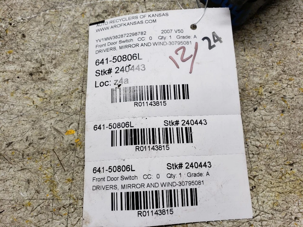 Welcome to our eBay Store! Driver Front Door Switch Driver's Fits 07 VOLVO 40 SERIES 1143815 Description Please read the entire listing before bidding. Our parts are not new! We sell only recycled automotive parts! All parts are tested to the fullest means possible to ensure only the highest quality products are listed in our eBay Store. We make every effort to provide you with the best photos of the product listed. See the seller’s listing for full details and description of any imperfections. Donor Vehicle VIN: YV1MW382872298782 Model: V50 Year: 2007 Mileage: 93000 (0 = not available or unknown) Stock Number: 240443 Store Number: 1 Part Detail Part Grade: A Part Category: U Part Placement: Driver/Left Notes: DRIVERS, MIRROR AND WIND-30795081 This part will fit these makes and models with these options VOLVO 40 SERIES 07 Driver's; mirror and window, w/o power folding; w/power child security locks VOLVO 50 SERIES 07 Driver's; mirror and window, w/o power folding; w/power child security locks WARRANTY / GUARANTEE Most parts we sell through eBay Motors come with a 30-day money back guarantee unless otherwise stated. The 30 day period starts when you take possession of the part. No labor warranty is provided. In the event a part sold with a warranty fails to operate within the warranty period we will replace the part(s) with a functionally equivalent part or refund the part purchase price, at our option. To return an item you must contact us via eBay Message within the 30 day period to obtain a RMA number (return material authorization). Original shipping charges and return shipping charges are not refunded. Once you obtain an RMA number, ship the item back to Auto Recyclers of Kansas, 1200 E Macarthur, Wichita, KS 67216 along with the RMA number. SHIPPING NOTES ABOUT US HELP Auto Recyclers of Kansas ships to US addresses within the 48 states only via UPS ground. International orders are sent via ebay's Global Shipping Program . Pick up at our facilities is available. Please message us prior to your purchase to arrange pick up. Items will be shipped within 1-2 days of purchase. Please allow up to 10 days for delivery unless item falls under ebay's Guaranteed Delivery p rogram. Most areas in the US are within 5 days. If an item arrives damaged, please contact us via eBay Message within 24 hours for instructions. If you have a question about a part please contact us BEFORE purchasing. Our main contact method is by eBay Messages. We try to answer all messages within 24 hours. If we are unable to answer your questions before the listing ends the item will be re-listed again soon for you to purchase. Core Charge. Core is an acronym for ‘Cash On Return’. A core charge is sometimes applied to rebuildable parts such as engines or alternators that can be redeemed for a portion of their original price. If the part you are purchasing has a core charge applied, it will be noted in the description. Parts Grading. A standard code system is used to communicate the condition and quality of a part between automotive recyclers, automotive repair shops, and insurers. Knowing how these codes are used will help you understand whether the part meets your expectations before you buy it and what you can expect from the part when you receive it. A Grade - The highest quality part. It is of low miles and/or exceptional condition for its age. B Grade - The second level quality part. It is of average miles and normal condition for its age. C Grade - The third level quality part. It has high miles and/or light damage. No Grade - A part that has not yet been graded.