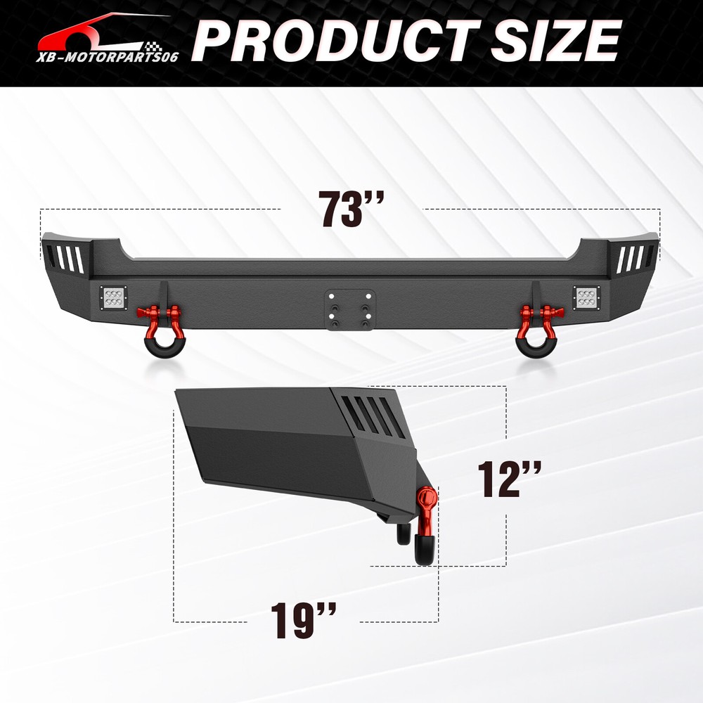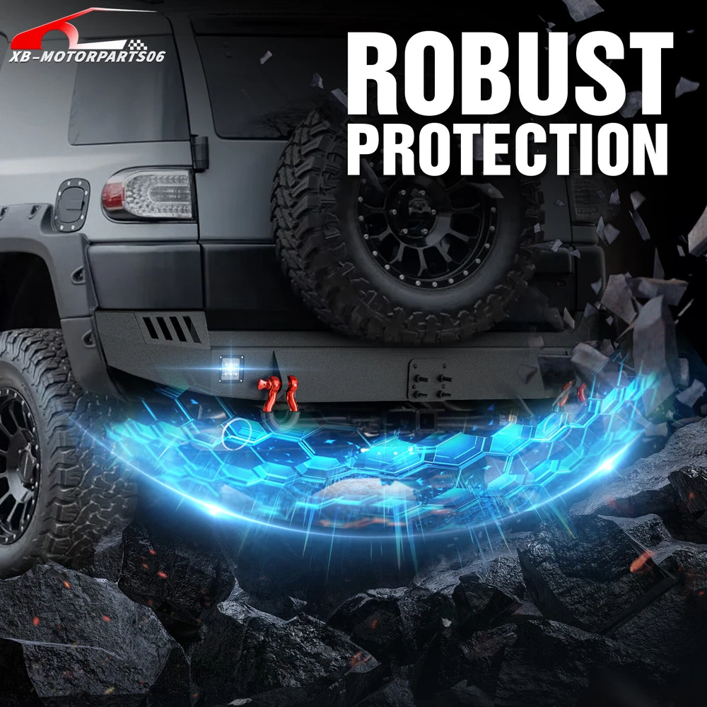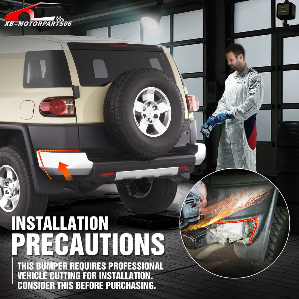 Rear Bumper W/ 2× D-rings&Tow Hitch Plate For 07-2014 Toyota FJ Cruiser 1st Gen For safety reasons, we strongly recommend that you seek professional installation services Suitable Models : Compatible with 20 07-2014 Toyota FJ Cruiser 1st Gen Package Includes: 1 x Rear Bumper, 2 x D-rings, 2 x LED Lights, Tow Hitch Plate, 1 x manual, screw fittings Product Information: Product Dimensions: 73" x 19" x 12" Installation mode: Bolt-On With Sensor Holes: No Steel thickness: 3mm Placement on Vehicle: Rear Item Weight: 61 Pounds Material: Carbon Steel Color: Black (hand measurements may have an error of 2-3 mm/0.078-0.118 in) Feature: ① Our rear bumper boasts an array of features: two high-powered 18W LED spotlights, a tow hitch mounting plate (Tow Hitch Not Included), and two 4.75-ton D-rings. Plus, it comes with comprehensive installation instructions and all the necessary screw fittings; ② Durable steel rear bumper featuring a two-stage black powder coating, providing resistance against rust and ensuring long-lasting durability and aesthetic appeal; ③ No need to cut the rear bumper; the car requires cutting. After completing the cutting, the subsequent installation is a simple bolt-on procedure. For safety considerations, we strongly advise seeking professional installation; ④ Durability, Waterproof, Rust-proof; Warranty Period: 2 year Standard Shipping (FedEx Ground or FedEx Home Delivery) Will usually ship within 3 business days of receiving cleared payment For safety reasons, we strongly recommend that you seek professional installation services Suitable Models : Compatible with 20 07-2014 Toyota FJ Cruiser 1st Gen Package Includes: 1 x Rear Bumper, 2 x D-rings, 2 x LED Lights, Tow Hitch Plate, 1 x manual, screw fittings Product Information: Product Dimensions: 73" x 19" x 12" Installation mode: Bolt-On With Sensor Holes: No Steel thickness: 3mm Placement on Vehicle: Rear Item Weight: 61 Pounds Material: Carbon Steel Color: Black (hand measurements may have an error of 2-3 mm/0.078-0.118 in) Feature: ① Our rear bumper boasts an array of features: two high-powered 18W LED spotlights, a tow hitch mounting plate (Tow Hitch Not Included), and two 4.75-ton D-rings. Plus, it comes with comprehensive installation instructions and all the necessary screw fittings; ② Durable steel rear bumper featuring a two-stage black powder coating, providing resistance against rust and ensuring long-lasting durability and aesthetic appeal; ③ No need to cut the rear bumper; the car requires cutting. After completing the cutting, the subsequent installation is a simple bolt-on procedure. For safety considerations, we strongly advise seeking professional installation; ④ Durability, Waterproof, Rust-proof; Warranty Period: 2 year