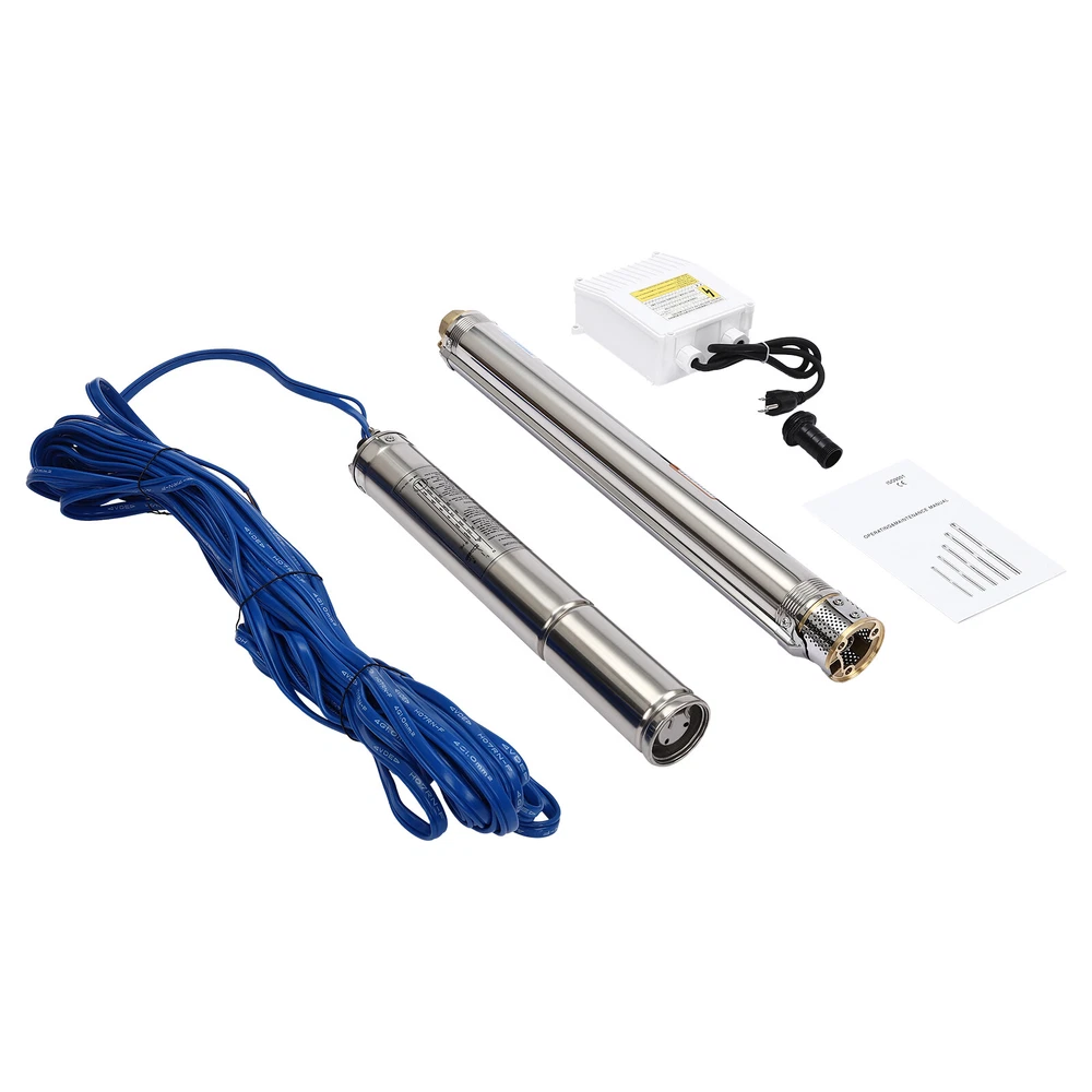Specifications Material: Stainless Steel, Copper, Plastic, Rubber Color: Silver and Blue Process: Polishing Assembly Required: Yes Power Source: Corded Electric Plug Type: US Standard Type: 2.5SDB1.5/17 Voltage: 110V, 60Hz Power: 0.55KW(0.75HP) Speed: 3420rpm Delivery Lift: 13m/42.65ft, 43m/141ft, 60m/196.85ft Flow Rate: 5L/1.32gal/min, 25L/6.6gal/min, 45L/11.89gal/min Number of Impellers: 17 Outlet Diameter: 2.54cm/1in Cable Length: 20m/65.62ft Control Box Size: 18.5*15*6.8cm/7.28*5.91*2.68in Water Outlet Size(D*H): 2.54*5.5cm/1*2.17in Gross Weight: 12.5kg/27.56lbs Package Size: 96.5*26.5*11cm/37.99*10.43*4.33inch Product Size(D*H): 6.6*107.2cm/2.6*42.2in Package Included 1* Submersible Pump 1* Water Outlet 1* Control Box 1* English Manual 0.75HP Deep Well Submersible Pump 1" Outlet 110V Stainless Steel w/ Control Box Description If you're looking for an efficient and simple irrigation solution, take a look at our submersible pump, a jewel in the world of irrigation technology for its performance and ease of operation. This submersible pump's unique design of deep water and silent operation quietly provide your farmland with a constant supply of living water, making every inch of soil come alive, which is undoubtedly the ideal choice for scientific irrigation and improved agricultural efficiency. Key Features Build to Last : It is made of high-quality stainless steel, copper, plastic, and rubber, and adopts a polishing process, making it solid, and not prone to rust and corrosion, so it can remain beautiful and practical for a long time. High Efficiency: The 0.55KW submersible motor, 3420rpm speed, maximum 11.89gal flow rate with 17 impellers as well as a diffuser and intake screen make your pumping and watering work faster and easier. Large Delivery Lift: The maximum lift of the pump is 196.85ft, which allows you to irrigate farmland, fish ponds, and orchards for a long distance, saving the time and cost of manual transportation. Easy to Clean: Thanks to its smooth surface and simple structure, and it is used to work in water, so it is very easy to clean. Space-saving: Vertical construction and compact dimensions ( 2.6*42.2 inches ) allow it to be used or stored in the trunk of a car without taking up too much space. Simple Installation: Simple construction and a detailed English manual make it easy to put together and get up and running quickly. Protective Package: Our product is packaged with a sponge to maximize protection from damage during shipping. Customer Service: We aim to provide quality products and services. If you have any problems, please feel free to contact us. We will reply and solve the problem for you as soon as possible. Details Standard Water Outlet: The pump adopts a 1-inch large diameter water outlet, which can be matched with different types of water pipes and is very practical. Long Cable: The 65.62ft long cable increases safety and convenience for you. Application This product is suitable for extracting groundwater from deep wells, and can also be used in water-lifting projects of rivers, reservoirs, canals, and so on. It can be used for farmland irrigation, and water for humans in mountainous areas, villages, homes, farms, campervans, cities, factories, and railways. Specifications Material: Stainless Steel, Copper, Plastic, Rubber Color: Silver and Blue Process: Polishing Assembly Required: Yes Power Source: Corded Electric Plug Type: US Standard Type: 2.5SDB1.5/17 Voltage: 110V, 60Hz Power: 0.55KW(0.75HP) Speed: 3420rpm Delivery Lift: 13m/42.65ft, 43m/141ft, 60m/ 196.85ft Flow Rate: 5L/1.32gal/min, 25L/6.6gal/min, 45L/11.89gal/min Number of Impellers: 17 Outlet Diameter : 2.54cm/1in Cable Length: 20m/65.62ft Control Box Size: 18.5*15*6.8cm/7.28*5.91*2.68in Water Outlet Size(D*H): 2.54*5.5cm/1*2.17in Gross Weight: 12.5kg /27.56lbs Package Size: 96.5*26.5*11cm/37.99*10.43*4.33inch Product Size(D*H): 6.6*107.2cm/2.6*42.2in Package Included 1* Submersible Pump 1* Water Outlet 1* Control Box 1* English Manual Notes Please check that the voltage and frequency correspond to local standards before ordering. Please do not use it without water. Please note that the pump needs to be installed vertically. Please note that the pumping speed is related to the depth at which the water pump enters the water, and the deeper the depth, the lower the speed. Please note that this product is only suitable for pumping clear water, not oil, chemical raw materials, and other liquids. Please read the operating manual and label completely before use, and pay particular attention to the safety instructions included. Please allow the slight color difference caused by the shooting light and 1-3cm error due to manual measurement, and make sure you do not mind before ordering. Payment Delivery details Terms of sales About us Contact us Payment We accept ebay payment 。 Fees such as import duties, taxes are not included in the item price or shipping costs. These charges are the buyer's responsibility. Delivery details Shipping: 2-9 working days to: USA Terms of sales We maintain high standards of excellence and strive for hundred percent customer satisfaction. Feedback is very important to us. We hope that you contact us immediately before you give neutral or negative feedback, so that we can address your concerns. It is impossible to address issues if we do not know about them! About us Your satis faction is our ultimate goal. We work hard to earn your trust and future business. Our certified technicians have tested each item before shipping. The unit comes with 1 year limited warranty on all manufacturing defects. a) If you receive a defective item, you may return it or ask for a discount. Please contact us within 14 days after you receive the package. b) What you returned must be intact and in its original packaging as re? u. Customer is responsible for shipping costs of the returned item. c) We will cover the cost of shipping back t with the shipping rate indicated in the registratio