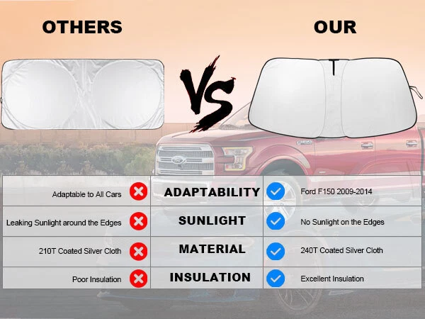 For 09-14 Ford F150 Car Windshield Sun Visor Sunshade Foldable Window UV Block Fitment For Ford F-150 2009-2014 Features Custom Fit : Windshield Shade Cover custom fit for Ford F150 2009-2014, Full covered your windshield,No Gap,Perfect fit. Double Thickness Material : Made of 210T Reflective Polyester, Sun Blocker is consist of both double reflective layers and double thermal insulating layers which can make shading and insulation more effective,Keeps your vehicle cool and protects against damage caused by hot sunlight. Air Condition Works Faster & Easier : Using less energy and gas instead of having to wait 15 minutes for your AC to cool off your car, the AC cools faster & easier. Saves your money while making your drive much more comfortable and enjoyable. Great Protection : With windscreen sun shade,it can protect car interior from harmful UV rays and heat that will fade dash and seats.Also when you travel by car or need a nap,our Custom fit Windshield Shades can block 99% sun shine and UV rays,give you and your family more protection. Easy to install & store : The foldable built-in elastic ring design allows you to prop the sunshade up in seconds with ease and fold-away storage making it convenient for daily use. Without falling off.Easy to twist, fold and store in the storage pouch. Specifications Product Name: Car sunshade Suitable for: Front Rear Windshield Material: Reflective Silver-Coated Nylon with foldable metal frame Color: Black + Silver Tone Net Weight: 180g Package Included 1 X Car Front Windshield Sunshade 1 X Sunshade Storage bag Payment We can accept payment of Paypal only. Payment should be made within 7 days after purchasing. (No payment orders eBay system will automatically open unpaid dispute, and this is not good to your account.) Shipping Item will be shipped out within 48 hours upon receipt of your cleared payment. We can not ship on Sundays and other public holidays. International Buyers Please Note: 1, Import duties, taxes and charges are not included in the item price or shipping charges. These charges are the buyer's responsibility. 2, Please check with your countrys customs office to determine what these additional costs will be prior to bidding/buying. Please make sure your address in paypal is correct. we will only follow your address listed in the Paypal payment for the shipment. Combine shipment is not allowed. If you want to combine all the items together, you should still pay for all of the shipping, insurance and handling fee! Returns We offer you 30 days return. The buyer is responsible for return shipping including a result of customer error or wrong item bought: 1) If you received an incorrect, damaged, defective, or item not as described, contact us for a partial/full refund or replacement on our cost. 2) If you want to return the item, please contact us within 60 days after package received. Return products must also be in its original condition: including box, packaging and all other accessories. Feedback 1.We are appreciated your business and to improve our customer service and our commitment to quality. 2.We will leave a positive feedback immediately after payment is received. We appreciate a positive feedback as much as you do. 3.If for some reason there is any issue with the purchase, please contact us prior to leaving feedback, and we will be glad to work with you to have it resolved. Contact Us We do appreciate your purchase from our store. If you are satisfied with the item as well as our service, please kindly leave us a Positive Feedback to help develop our business. Thank you in advance. Our office hours are MONDAY - FRIDAY 9:00PM - 18:00PM PST , we do not answer any E-mails or eBay messages on weekend. All E-mail or eBay message take us around 24 hours to respond. Thanks a lot. For 09-14 Ford F150 Car Windshield Sun Visor Sunshade Foldable Window UV Block Fitment For Ford F-150 2009-2014 Features Custom Fit : Windshield Shade Cover custom fit for Ford F150 2009-2014, Full covered your windshield,No Gap,Perfect fit. Double Thickness Material : Made of 210T Reflective Polyester, Sun Blocker is consist of both double reflective layers and double thermal insulating layers which can make shading and insulation more effective,Keeps your vehicle cool and protects against damage caused by hot sunlight. Air Condition Works Faster & Easier : Using less energy and gas instead of having to wait 15 minutes for your AC to cool off your car, the AC cools faster & easier. Saves your money while making your drive much more comfortable and enjoyable. Great Protection : With windscreen sun shade,it can protect car interior from harmful UV rays and heat that will fade dash and seats.Also when you travel by car or need a nap,our Custom fit Windshield Shades can block 99% sun shine and UV rays,give you and your family more protection. Easy to install & store : The foldable built-in elastic ring design allows you to prop the sunshade up in seconds with ease and fold-away storage making it convenient for daily use. Without falling off.Easy to twist, fold and store in the storage pouch. Specifications Product Name: Car sunshade Suitable for: Front Rear Windshield Material: Reflective Silver-Coated Nylon with foldable metal frame Color: Black + Silver Tone Net Weight: 180g Package Included 1 X Car Front Windshield Sunshade 1 X Sunshade Storage bag On Feb 7, 2025 at 20:36:48 PST, seller added the following information: