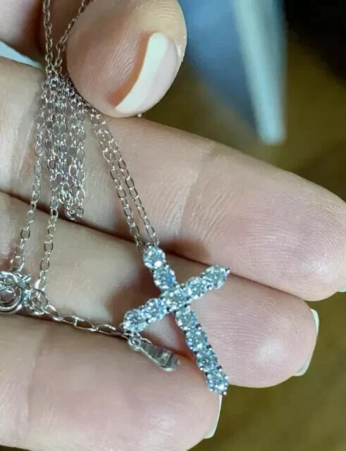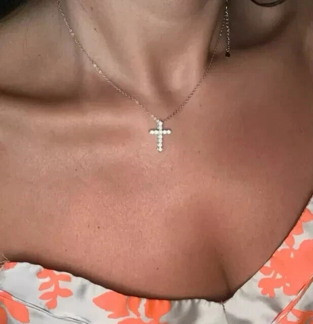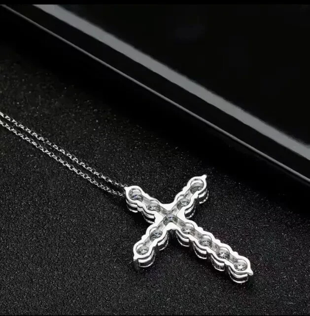 $ 10.042Ct Round Cut Moissanite Cross Pendant in 14K White Gold Plated Chain