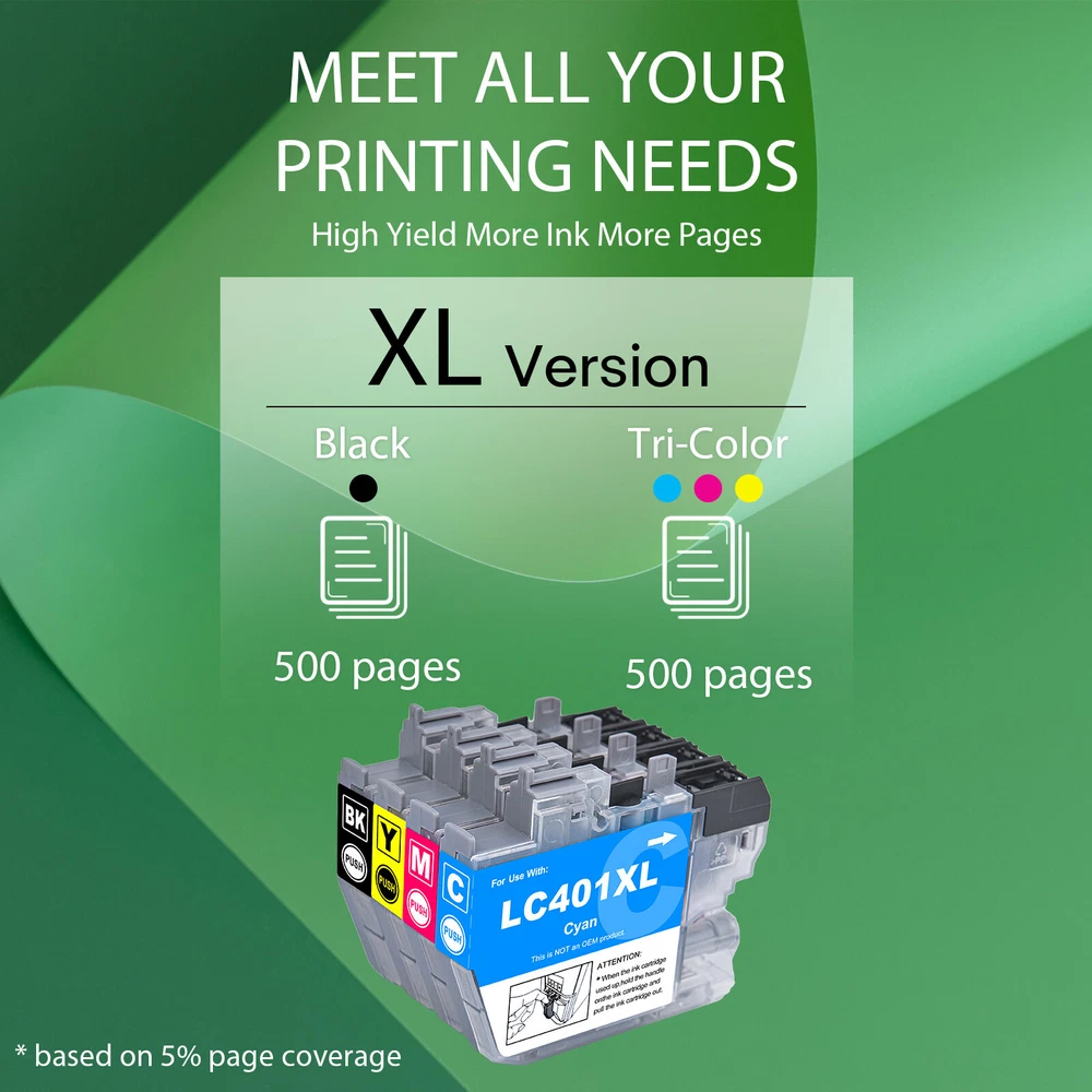 Store Home New Arraival Add to favourite View Feedback Contact Us SPECIFICATIONS/FEATURES Contents: For Brother C401XL-BCMY-4PK Ink Type: Multicolor Cartridge Type: New Package contents: - 1 x Black C401XL Super High Yield - 1 x Cyan C401XL Super High Yield - 1 x Magenta C401XL Super High Yield - 1 x Yellow C401XL Super High Yield Page Yield: 500 pages per C401XL black cartridge 500 pages per C401XL color cartridge ( determined by 5% page coverage) Compatible With the Brother printers MFC-J1010DW MFC-J1170DW MFC-J1012DW Warranty 100% satisfaction guaranteed. Install Instructions: Step 1 : Take off the protective clip. Step 2 : Remove the static protective vinyl tape. Step 3 : Wipe the ink cartridge chip with alcohol pad. Step 4 : Install the cartridge to the printer.Some printers must be black/color ink cartridges match use. Please clean the printhead 1-2 times once a month.If the printer does not work after installing the cartridge, clean the chip contacts of the cartridges with a rubber eraser or cotton swab. Take care not to touch the ink nozzles on the bottom of the cartridge.