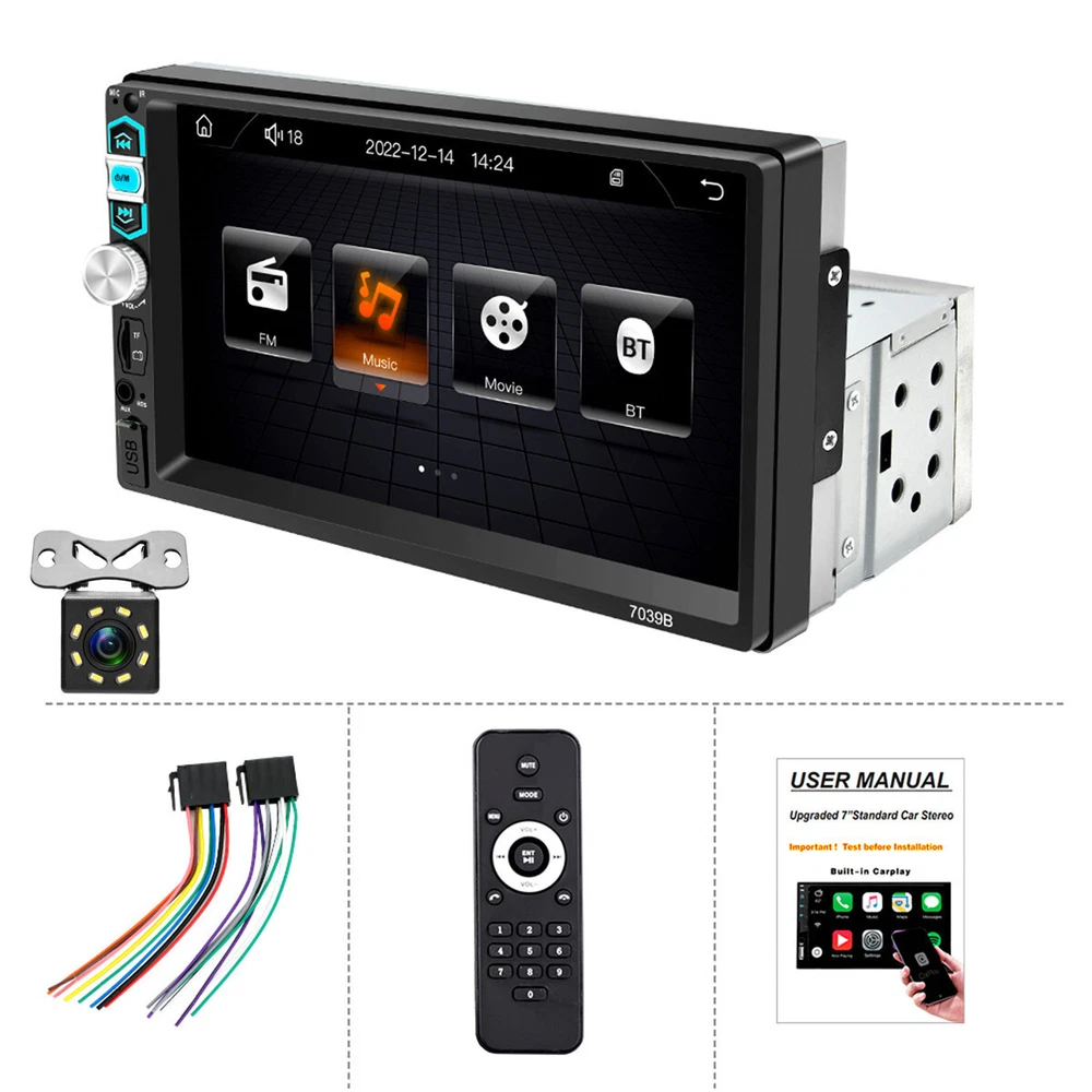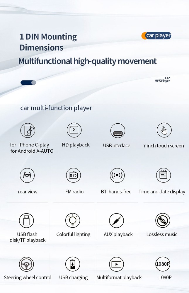 Product Description 1 Din Car Radio 7in Touch Screen Car MP5 Player For Wired Carplay&Android Auto FM Mirror Link Audio Stereo Multimedia Player With 8LED Rear Camera Note:Please check Radio's size with car dashboard before buying !! Please note: This is a Wince radio that does not support WIFI&GPS Option: Wired Carplay&Android Auto Specifications: Packaging size: 22 * 12 * 13CM Screen size: 7 inches System: wince Interconnection: Wired Carplay Interconnection Wired Android Auto Interconnection Mobile Interconnection Video playback: RMVB/RM/FLV/3GP/MPEG/DIVX/XVID/DAT/VOB/AVI/MP4 Audio playback: DIS, MP3, WMA, ACC, OGG, WAV, RA, AC3, MP2, AMR, etc. Power amplifier chip: 7388 Mobile phone charging: supports USB mobile phone charging Bluetooth: support USB drive playback: supported TF card playback: supported AUX: Support Steering wheel control: supported Reverse view priority: supported Mobile internet: support USB interface: supported Features: ●Carplay: You can use the connection to Carplay, connect to your Apple phone, access phone contacts, emails, notifications, map navigation, music, videos, and other information, and achieve voice control. ●Android Auto, connected using a USB data cable. ●Screen: 7-inch high-definition video playback ●Image linkage: Supports Android/iPhone image linkage, which can be synchronized to the onboard screen through the original USB cable of the phone. It can support Apple version 13.4 and Android version 10.1. The above version may not support mobile phones, and the software needs to be upgraded after factory debugging ●Equipped with built-in Bluetooth function, can connect to mobile phones, make hands-free calls, make driving safer, and play Bluetooth music ● FM radio: can listen to real-time road conditions, news broadcasts, weather forecasts, and other 18 preset storage functions of the receiver ● Support steering wheel control function: use the car steering wheel to quickly switch the functions you want, making it more convenient ● Rear view camera input function : Support ,included 8LED camera ●Seven color backlight settings: supports seven colors of backlight, you can choose from ●Decorate your car with your favorite colors in the settings menu ●The AUX audio input interface supports external MP3 players, mobile phones, music players, etc. ●Please note that the MP5 player does not support WIFI and GPS Package Included: 1x Host 1x Remote Control 1x Power Wire 1x Manual 1x 4LED Rear Camera Payment Returns Contact Us Shipping We accept payment by PayPal only ! Payment should be completed within 5 days after buyer places the order,or else an unpaid case will be opened in order to cancel the transaction. If you can not pay in time, please contact us. e-check from PayPal will only be processed once the payment clears. All of the items will be shipped to buyer's EBAY address,please confirm your address on Ebay before you buy.Your order will be usually shipped out the same or next business days once the payment is made and cleared. 30-day Warranty with Exchange for defective, malfunctioned, incorrect or parts-missing items. Please notify us and return the item with all parts and accessories packed and marked "FOR EXCHANGE" within 14 days of receipt. If defective, malfunctioned or parts-missing items are no longer available, a refund may be issued. All returning postage costs will be the responsibility of the buyers under all circumstances. If you encounter any problems about anything, please feel free to contact us and we will do our best to assist you solve the issue. If you are not satisfied in anyway, please feel free to let us know and give us a second chance to correct it before you decide to leave any neutral or negative feedback. Please contact us through eBay link if you have any questions. We will reply you within 24- 48 hours. Please check you spam mail if no response for 48 hours. All items will be checked before packing. All items are new and of high quality. Item will be shipped within 1 business days upon receipt of payment, excluding weekends and public holidays. If to USA,we will ship your order by USPS,it will take about 8-12 working days to you,and you can track it on line. If to other country,we will ship your order by China Post or Singapore Registered Air Mail,it will take about 14-21 working days to you,you aslo can track it on line. Delivery time is about 14-28 business days and it may take up to 8 weeks . Payment We accept payment by PayPal only ! Payment should be completed within 7 days after buyer places the order,or else an unpaid case will be opened in order to cancel the transaction. If you can not pay in time, please contact us. eCHECK from PayPal will only be processed once the payment clears. All of the items will be shipped to buyer's EBAY address,please confirm your address on Ebay before you buy.Your order will be usually shipped out the same or next business days once the payment is made and cleared. Returns 30-day Warranty with Exchange for defective, malfunctioned, incorrect or parts-missing items. Please notify us and return the item with all parts and accessories packed and marked "FOR EXCHANGE" within 14 days of receipt. If defective, malfunctioned or parts-missing items are no longer available, a refund may be issued. All returning postage costs will be the responsibility of the buyers under all circumstances. Contact Us If you encounter any problems about anything, please feel free to contact us and we will do our best to assist you solve the issue. If you are not satisfied in anyway, please feel free to let us know and give us a second chance to correct it before you decide to leave any neutral or negative feedback. Please contact us through eBay link if you have any questions. We will reply you within 24- 48 hours. Please check you spam mail if no response for 48 hours. Shipping All items will be checked before packing. All items are new and of high quality. Item will be shipped within 1 