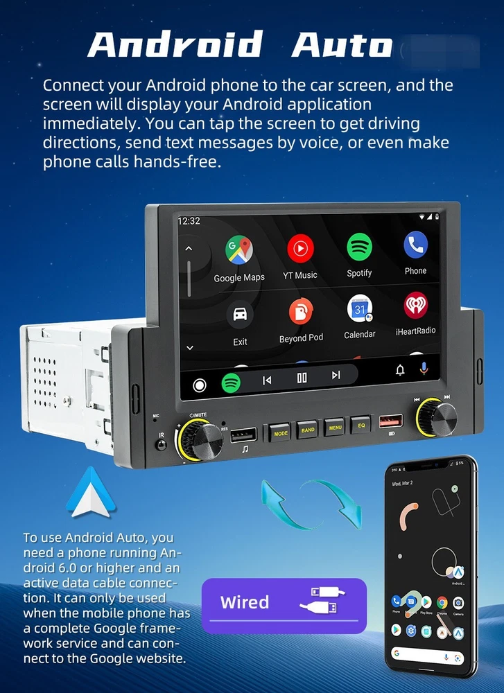 Product Description 1 Din Car Radio W/12LED Camera Android 10.1 Bluetooth Handsfree Wifi GPS USB Mirror Link 6.2in Multimedia Player 2+32G Head Unit Support CarPlay Android-Auto Add our listing to Watchlist Or Add to Cart , you will get more discount Performance parameters Type: Android navigation machine System: Android 10.1 Software solution: Jing Anchi Radio IC: FM 87.5~108.0MHz Power amplifier IC: YD7388 Output power: 60Wx4 Working voltage: 12~14.4V Working temperature: - 10~60 ℃ Bluetooth version: 4.0 (default name: Car BT) Wifi frequency:2.4GHz GPS signal:GPS+GLONASS+Beidou CPU:A7 1.1GHz x 4 Operating memory 2G (DDR3) Memory:32G Display resolution: 800x480 Screen size: 6.2 inches Installation size:178x50MM Face shell size: 188x110MM Host depth: 108MM Functional parameters Mobile internet: support Reverse camera:support (camera optional) Play video warning: support Steering wheel control: supports key learning Video output: support Offline map: is not supported DASH CAM: support (optional) GPS navigation: support USB: front USB charging (red)+front USB2.0 reading (black)+rear USB2.0 reading TF card: does not support Reset button: support Audio output: 2 channels (left channel+right channel) Video output: 2 channels Audio input: is not supported Rear external microphone input: support (optional) Video input: 1 channel Reverse video input: 1 channel Audio format: MP3/WMA/WAV/APE/FLAC/AAC/OGG/RM Video format: MPEG/AVI/RM/FLV/ASF/WMV/MP4/MKV/OGM/TS/DivX/RMVB/VOB Picture format: JPG/BMP/PNG/JPEG/GIF Language parameters Chinese/Chinese Traditional/English/Russian/Greek/Polish/Turkish/Arabic/Persian/Romania/French/Hungarian/Italian/Thai/German/Ukrainian/Spanish/Portuguese/Czech/Vietnamese/Japanese/Malaysia/Dutch/Indonesian/Korea Factory setting password: 1234 Basic functions 1. Radio (FM) 2. Read USB flash disk (audio/video/pictures) 3. Audio input function 4. Bluetooth function 6. Rear view function (camera optional) 7. Video input 8. Original vehicle steering wheel learning function 9. Android recorder can be installed 10. WIFI internet access 11. GPS navigation 12. Mobile Internet (Android/Apple) 13. APP can be installed 14. Wired/wireless android auto, wireless carplay Accessories 1. Host 2. Instruction 3. Power cord 4. Remove the key 5. 12LED Rear Camera Payment Returns Contact Us Shipping We accept payment by PayPal only ! Payment should be completed within 5 days after buyer places the order,or else an unpaid case will be opened in order to cancel the transaction. If you can not pay in time, please contact us. e-check from PayPal will only be processed once the payment clears. All of the items will be shipped to buyer's EBAY address,please confirm your address on Ebay before you buy.Your order will be usually shipped out the same or next business days once the payment is made and cleared. 30-day Warranty with Exchange for defective, malfunctioned, incorrect or parts-missing items. Please notify us and return the item with all parts and accessories packed and marked "FOR EXCHANGE" within 14 days of receipt. If defective, malfunctioned or parts-missing items are no longer available, a refund may be issued. All returning postage costs will be the responsibility of the buyers under all circumstances. If you encounter any problems about anything, please feel free to contact us and we will do our best to assist you solve the issue. If you are not satisfied in anyway, please feel free to let us know and give us a second chance to correct it before you decide to leave any neutral or negative feedback. Please contact us through eBay link if you have any questions. We will reply you within 24- 48 hours. Please check you spam mail if no response for 48 hours. All items will be checked before packing. All items are new and of high quality. Item will be shipped within 1 business days upon receipt of payment, excluding weekends and public holidays. If to USA,we will ship your order by USPS,it will take about 8-12 working days to you,and you can track it on line. If to other country,we will ship your order by China Post or Singapore Registered Air Mail,it will take about 14-21 working days to you,you aslo can track it on line. Delivery time is about 14-28 business days and it may take up to 8 weeks . Payment We accept payment by PayPal only ! Payment should be completed within 7 days after buyer places the order,or else an unpaid case will be opened in order to cancel the transaction. If you can not pay in time, please contact us. eCHECK from PayPal will only be processed once the payment clears. All of the items will be shipped to buyer's EBAY address,please confirm your address on Ebay before you buy.Your order will be usually shipped out the same or next business days once the payment is made and cleared. Returns 30-day Warranty with Exchange for defective, malfunctioned, incorrect or parts-missing items. Please notify us and return the item with all parts and accessories packed and marked "FOR EXCHANGE" within 14 days of receipt. If defective, malfunctioned or parts-missing items are no longer available, a refund may be issued. All returning postage costs will be the responsibility of the buyers under all circumstances. Contact Us If you encounter any problems about anything, please feel free to contact us and we will do our best to assist you solve the issue. If you are not satisfied in anyway, please feel free to let us know and give us a second chance to correct it before you decide to leave any neutral or negative feedback. Please contact us through eBay link if you have any questions. We will reply you within 24- 48 hours. Please check you spam mail if no response for 48 hours. Shipping All items will be checked before packing. All items are new and of high quality. Item will be shipped within 1 business days upon receipt of payment, excluding weekends and public holidays. If to USA,we will ship your order by USPS,it will take about 7-10 working days to you,and you can track it on line.
