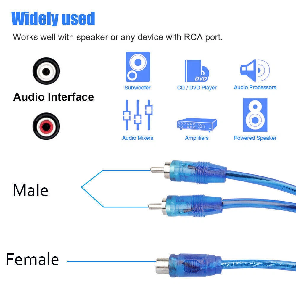 Product Description Plug Type: RCA 1 Female to 2 male Color: Clear Blue Length: 28.5 cm ± 1.5 cm (11.2" ± 0.59") Feature Oxygen free copper cable Compact, lightweight and easy for storage Easy to use, just plug and play Can be used for car or home audio use Used to split a signal for distribution to multiple devices Package includes: 2-20PCS Splitter Y adapter Cable (As Your Choice On Oct 19, 2023 at 18:23:29 PDT, seller added the following information: