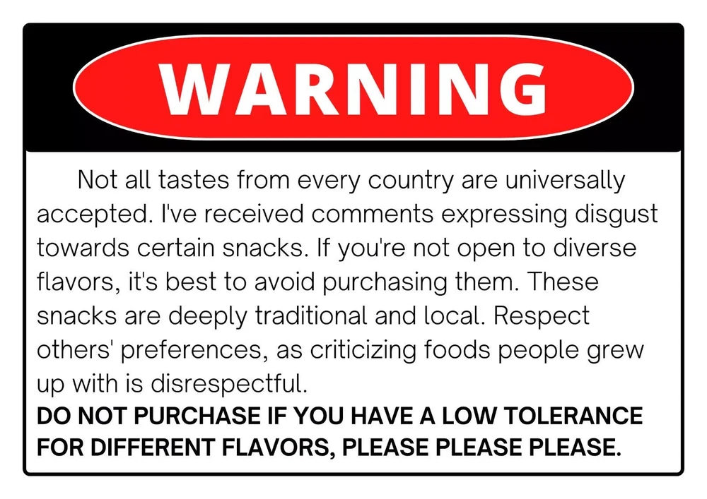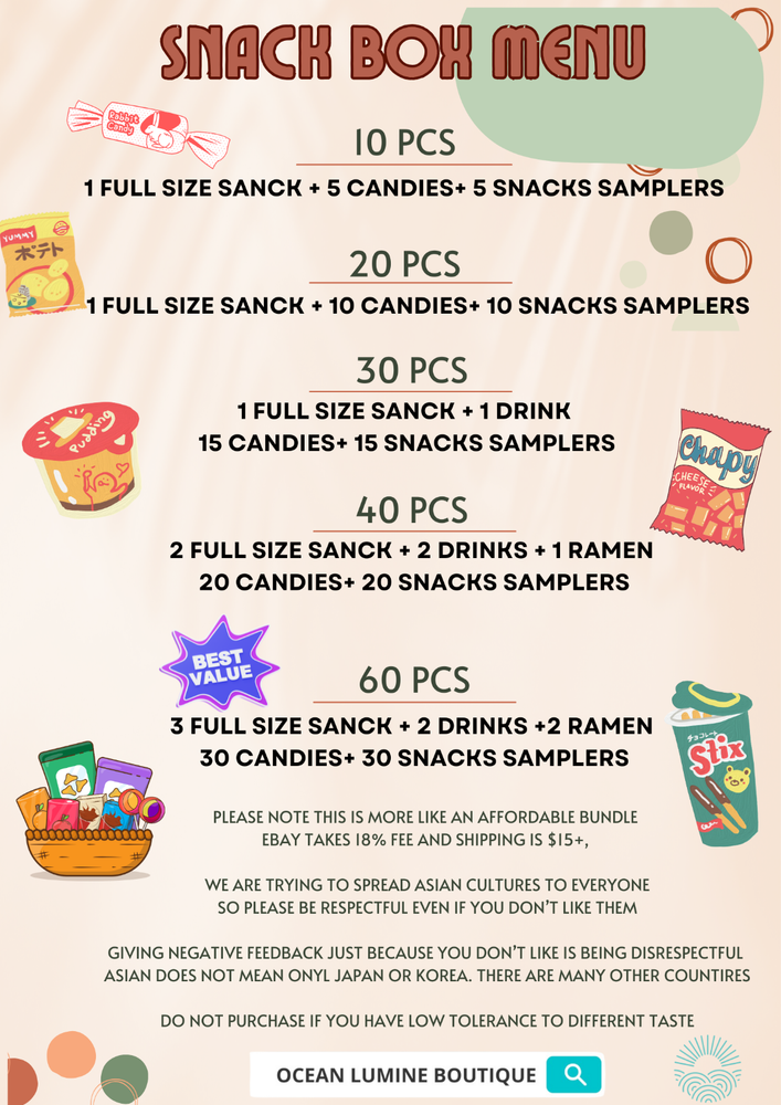 PLEASE READ BEFORE YOU PURCHASE YOU WILL GET SAMPLERS NOT A WHOLE PACKAGE ✅May be some repeating items, Expiration date may be different for all items but guarantee fresh ✅You will get one free ramen for all size of options 📌Important Details:📌 1️⃣ Manufacturing Dates: Some products may display manufacturing dates 2️⃣ Illustrative Purposes: Images shown are for illustration only. Actual products may vary due to our rotating stock. 3️⃣ Variety: Photos are examples of what may be included as some snacks in our rotation may change. 4️⃣ Size Variation: Please note that snack sizes vary. While some snacks are small yet premium (like many Japanese snacks), others may be larger. We focus on flavor and quality over size. 5️⃣You will receive snack samplers individually packed for freshness, not full packages of snacks. Our selection prioritizes flavor and quality over size. If you prefer large, budget-friendly snacks, we suggest exploring alternatives like cotton candy. 6️⃣You will get a mix of sweet & savory snacks/ candies, if you have preference, please contact me! Also please note there will be repeat items. 7️⃣Contains Milk, Soy, Wheat, Cashew...May Contain Traces of Egg, Peanut, Almond...Please DO NOT purchase if you have any food allergy 🎈🎇🎈🎇Seller's Note🎈🎇🎈🎇 Please respect diverse cultural foods; personal taste varies widely. My goal is to offer affordable opportunities for everyone to explore different cultures and foods. Please DO NOT purchase if you have low tolerance of different flavors and having trouble being respect to other cultures. No food is "nasty", people grew up and live with these foods, so please behave like a cultured and educated person, you don't like it doesn't mean it is nasty, other people like it. 🛑Shipping Disclaimer🛑 While we take every precaution—labeling packages as fragile and conducting thorough hand-checks—damage may occasionally occur due to mishandling during transit. Should any issues arise, we recommend contacting your local postal service first. Alternatively, feel free to reach out to us directly, and we will work with you to resolve the matter promptly. Contact us We can be contacted at any time through eBay messages if you have any questions, comments or product requests. We will respond to you within 24 hours and do our best to help you out! We encourage our customers to contact us with any questions or concerns! We'd like to be sure you are completely satisfied with your purchase. Disclaimer Product packaging, specifications, and prices are subject to change without notice. All information about the products is provided for information purposes only. Please always read labels, warnings, and directions provided with the product before use. Shipping All orders are shipped within 1-2 business days after payment is received. For expedited shipping options, please contact us, and we will gladly assist in meeting your needs. Returns We DO NOT take any returns for food & drinks.