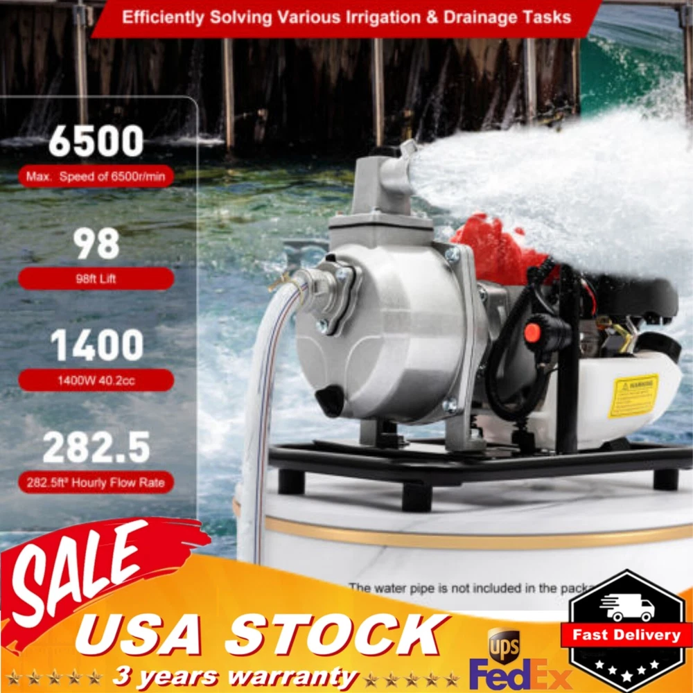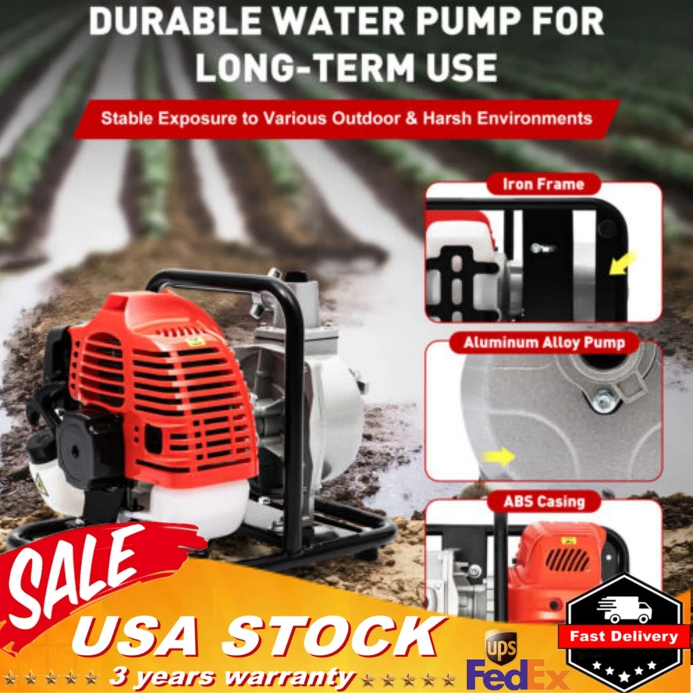 Specifications Material: Aluminum Alloy, Iron, ABS Color: Black, Red, Grey Style: Modern Assembly Required: Yes Engine Type: Single Cylinder, Air-cooled, 2-stroke Number of Items: 1 Displacement: 40.2cc Max. Lift: 30m/98ft Max. Suction: 7m/23ft Max. Power: 1400W Max. Speed: 6500r/min Gasoline: No.90 and Above Flow Rate: 8m³/ 282.5ft³/ H Fuel Tank Capacity: 0.85L/0.22gal Inlet/Outlet Diameter: 2.5cm/1in Fuel Consumption Rate: 610g/1.34lbs/Kw.h Fuel Type: Mixed Oil (25 Gasoline: 1 2-stroke Engine Oil) Gross Weight: 9.79kg/21.6kbs Net Weight: 8.91kg/19.6lbs Product Size: 40*28*30cm/15.74*11*11.81in Package Size: 40*33*33cm/15.74*13*13in 1" GAS POWER SEMI-TRASH WATER PUMP HIGH PRESSURE IRRIGATION TRANSFER PUMP 1.7 HP Description Efficient and simple irrigation or drainage methods are one of the pursuits of many farmers, rescue teams, and fruit farmers. This portable water pump is a good choice! It combines high power with a lightweight body, making it easy for you to carry around and start working efficiently wherever you need it. It will be a good helper in the field and a good partner in emergency repair work. Key Features High Efficiency: It adopts a strong two-stroke engine, with larger and stronger cylinder strength. The 1400W, 40.2cc engine has a maximum speed of 6500r/min, achieving 282.5ft³ hourly flow rate and 98ft lift. With its help, your various irrigation and drainage tasks can be efficiently solved. Durable & Sturdy: The aluminum alloy pump body, iron frame, and ABS casing all have high hardness, high wear resistance, corrosion resistance, and rust resistance, achieving a longer service life. Large Fuel Tank & Low Fuel Consumption: The 0.22gal fuel tank allows you to work for a longer time at once, saving you time and effort. A high-quality carburetor ensures a 610g/Kw.h of fuel rate, reducing fuel consumption. User-friendly Design: The drawstring start, one-click shutdown, and gear controlled speed regulation design simplify various operations while ensuring safety, making it easier and more reassuring for you to use. Lightweight & Portable: It is lightweight(19.6 lbs) and portable(15.74*11*11.81in), combined with a convenient handle located in the middle, allowing you to easily lift it with one hand to the place you need and start working. Safety Guard: The check valve can effectively prevent backflow, providing higher safety for your use. Oil bubbles and visible fuel pipes make it easy to track the delivery of fuel and achieve a safe start-up. High Stability: The quadrilateral base and enlarged anti-slip pads provide greater stability and effective vibration reduction, ensuring better performance in harsh environments. Silencing Hood: The internal silencing hood effectively alleviates the noise generated during operation, maintaining noise within an acceptable range without affecting other activities. Protective Packaging: This product comes in a custom air column bag that resists common compression and falls to prevent product damage in transit as much as possible. Details Heat Dissipation Holes: Widely distributed and efficient heat dissipation holes can quickly dissipate the heat generated by the machine during operation, preventing damage caused by high temperatures and ensuring stable operation. Air & Water Filters: The filters can effectively isolate impurities in water and air, prevent blockage of water pipes and water pumps, and improve the working efficiency. Large Diameter Inlet/Outlet: The 1-inch large diameter inlet/outlet can be paired with most of the water pipes on the market, with high universality and more effective use. Drainage Port: It can easily discharge excess water and impurities from the pump, extending its service life. Application It can provide reliable drainage or irrigation solutions for homeowners, farmers, construction personnel, etc. It is mainly used for pumping irrigation of vegetable gardens and flower beds, garden lawns, outdoor pumping and drainage operations, irrigation and fertilization of crops and green seedlings, flood control and drainage, tunnel drainage, etc. Specifications Material: Aluminum Alloy, Iron, ABS Color: Black, Red, Grey Style: Modern Assembly Required: Yes Engine Type: Single Cylinder, Air-cooled, 2-stroke Number of Items: 1 Displacement: 40.2cc Max. Lift: 30m/98ft Max. Suction: 7m/23ft Max. Power: 1400W Max. Speed: 6500r/min Gasoline: No.90 and Above Flow Rate: 8m³/ 282.5ft³/ H Fuel Tank Capacity: 0.85L/0.22gal Inlet/Outlet Diameter: 2.5cm/1in Fuel Consumption Rate: 610g/1.34lbs/Kw.h Fuel Type: Mixed Oil (25 Gasoline: 1 2-stroke Engine Oil) Gross Weight: 9.79kg/21.6kbs Net Weight: 8.91kg/19.6lbs Product Size: 40*28*30cm/15.74*11*11.81in Package Size: 40*33*33cm/15.74*13*13in Package Included 1*Water Pump 1*Fuel Oil Mixing Bottle 1*Tool Kit 1*Filter 1*Funnel 1*Extra Air Filter 1*English Manual All Accessories for Assembly Notes Please carefully read the manual and strictly follow the precautions to have a better experience. Please use #90 or above gasoline for this product and mix it with two-stroke engine oil in a ratio of 25:1. Please note that water must be added to this product before use. Before starting the machine, please check if the machine is complete and check the coupling to see if the internal drive is damaged. After using, please idle for 2-3 minutes and wait for the engine temperature to decrease before turning it off to improve its service life. Please drain the fuel tank when not in use for a long time. Please allow the slight color difference caused by the shooting light and 1-3cm error due to manual measurement, and make sure you do not mind before you order. Payment Delivery details Terms of sales About us Contact us Payment We accept ebay payment 。 Fees such as import duties, taxes are not included in the item price or shipping costs. These charges are the buyer's responsibility. Delivery details Shipping: 2-9 working days to: USA Terms of sales We maintain high standards of excellence and