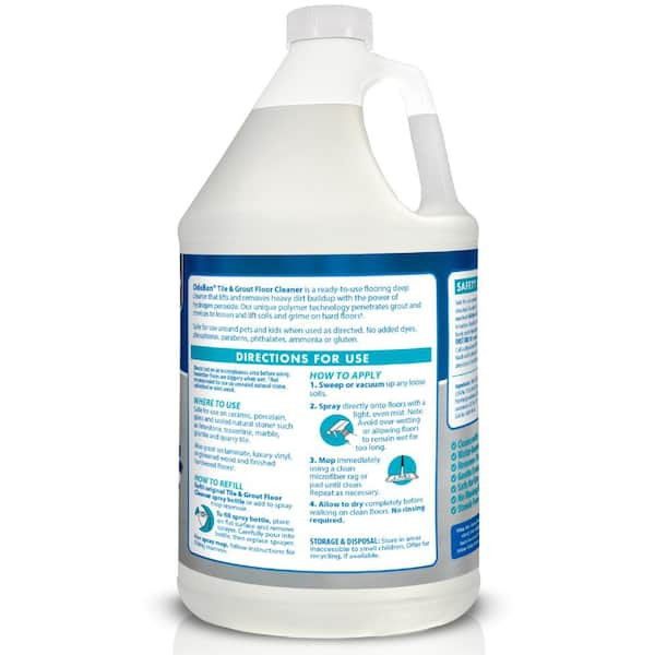 OdoBan Tile and Grout Floor Cleaner is a ready-to-use flooring deep cleaner with the power of hydrogen peroxide. Featuring powerful oxy cleaning action that penetrates grout and crevices to lift and remove soils and grime on hard flooring. Safe for use on ceramic, porcelain, glass and sealed natural stone such as limestone, travertine, marble, granite and quarry tile. Also great on laminate, luxury vinyl, engineered wood and finished hardwood floors. Fast-drying, streak-free formula leaves no dulling residue. Safe for use around pets and kids, when used as directed. No added dyes, phosphorus, parabens, phthalates, ammonia or gluten. Not for use on unsealed natural stone and unfinished or oiled wood.