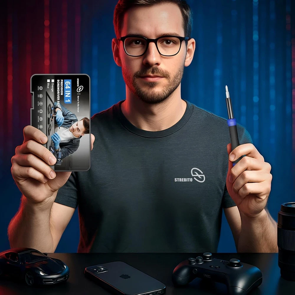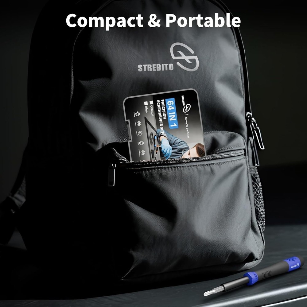 Small Precision Screwdriver Set 64-piece with Torx, Triwing, Pentalobe, Electronics Repair Tool Kit for Computer, PC, Laptop, Macbook, Tablet, Phone, PS5, XBOX, Switch, Glass, Ring Doorbell About this item 64-in-1 Precision Screwdriver Set: This small screwdriver set includes 48 bits (Phillips, Flathead, Torx, Torx security, Triwing, Pentalobe, Hex, Triangle, U-type, Square, SIM, MID, OVAL, Gamebit, Nut driver). It's a complete electronics repair kit that has been professionally designed to repair computers, PC, laptops, Macbooks, tablet, phones, PS4 PS5, XBOX, Switch, eyeglasses, drone, watches, Ring doorbells and more Ergonomic & Magnetic Design: The super smooth swivel cap on the top of the handle makes it easier to rotate screws with less effort. This mini screwdriver features an ergonomic non-slip design and rubberized handle that provides a comfortable grip and precise control. The built-in strong magnet ensures magnetic bit holder transmits magnetism through the screwdriver tip to help you with tiny screws Practical Accessories: Our electronics tool kit comes with 8 types of 15 essential accessories. Magnetizer can enhance the magnetism of the screwdriver tip, pointed tweezers make it easy to handle screws and tiny components, spudger and hook tool is effective for connecting/disconnecting components, scraping off adhesives, suction cup, pry tools, opening picks and brush to help open and clean your device Organize & Portable Storage: All screwdriver bits are stored in rubber bit holder which marked with type and size for fast recognizing. The rubber bit holder can be fixed on the shelf of the sturdy plastic case, also can be removed for easy access, making it more convenient for you to perform repairs. The case provides secure protection and organized storage, while being lightweight and portable for easy transportation