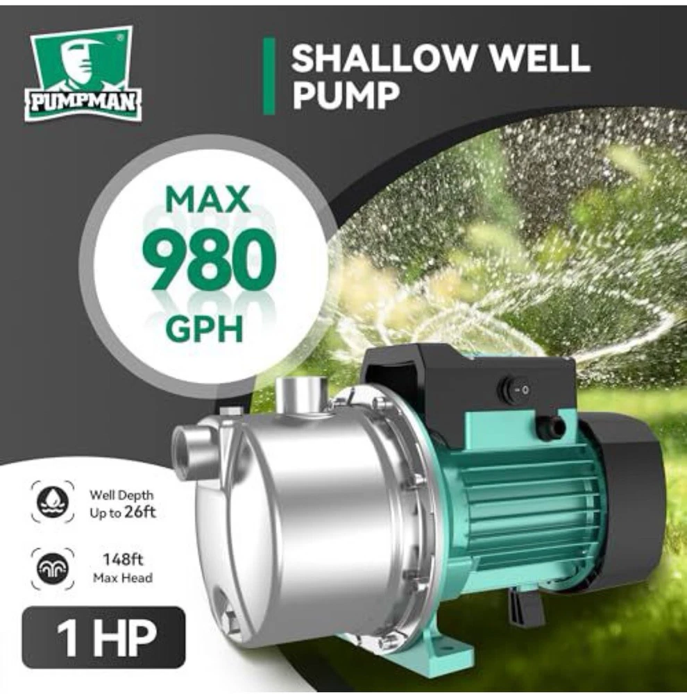 New, open box. PUMPMAN 1HP Shallow Jet Well Pump Portable Garden Pump, 980GPH 110V 148Feet Stainless Steel, Water Transfer Draining Irrigation Pump Lawn Water Sprinkler Booster pump 357