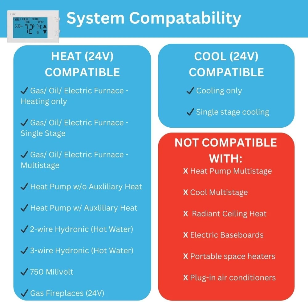 Product Description Lux LTX9600TS 7 Day Digital Programmable Thermostat for Home Use; 2 Heat, 1 Cool Easily adjust your temperature and create weekly schedules with the large touchscreen display, offering intuitive control powered by technology Set energy-saving home & away temps; use hold settings for extended absences, maximizing efficiency & comfort Personalize your week with 7-day menu-driven programming, featuring 4 periods per day for tailored comfort and efficiency Easy to install and use, making temperature control simple and straightforward for anyone Backlit touchscreen display shows current and set point temperatures simultaneously, providing clear visibility day or night About Us We are a reputable seller with many years of experience selling on eBay. Our goal is to provide high-quality products and excellent customer service. Shipping Items will be shipped within 1-3 business days when we received payment. (Orders are not processed on weekends & holidays) Tracking information will be sent once item is shipped. Delivery time depends on destination and other factors Item is shipped to ebay address. Leaving correct address can minimize delay. For international shipping and shipping to Guam, Hawaii and Alaska, Please contact us before placing the order. International buyers please note: Import duties, taxes and charges are not included in the item price or shipping charges. These charges are buyer’s responsibility. We will try our best to reduce the risk of the custom duties. Local pick-up is unavailable at the moment. Contact Us We reply any email messages within 1 business / working days(off-duty at weekend). If you do not get a response from us, then please check your junk or spam mailbox. Our Business hours: Mon-Fri 9:00-18:00, UTC/GMT +8 hours. Please contact us either by clicking "contact seller" in the "purchase history" section or simply click "ask a question" at the bottom of this page. If you are unsatisfied with our item or service, please contact us before leaving any feedback. We are committed to resolve all issues in a friendly and satisfactory manner.