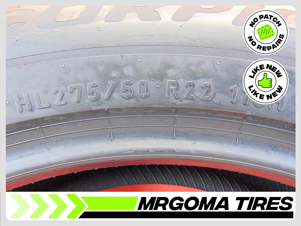9.0/32 Tread Depth 90% Remanining life 2024 DOT/NO PATCH ACTUAL PICTURE OF ITEM 1 PIRELLI SCORPION TM MS ELECT PNCS XL HL275/50R22 ACTUAL PICTURES OF ITEM Size: HL275/50R22 Load/Speed Index: 116H Tread Depth: 9.0/32 Remaining Life Remaining Life: 90% avg. Run Flat: NO DOT: 0524 Production Year: 2024 Product #: 574527 Patched: NO. No patches, no repairs FREE INSTALLATION (Local customers only) ACACTUAL PICTURE OF ITEM ACTUAL PICTURE OF ITEM ACACTUAL PICTURE OF ITEM