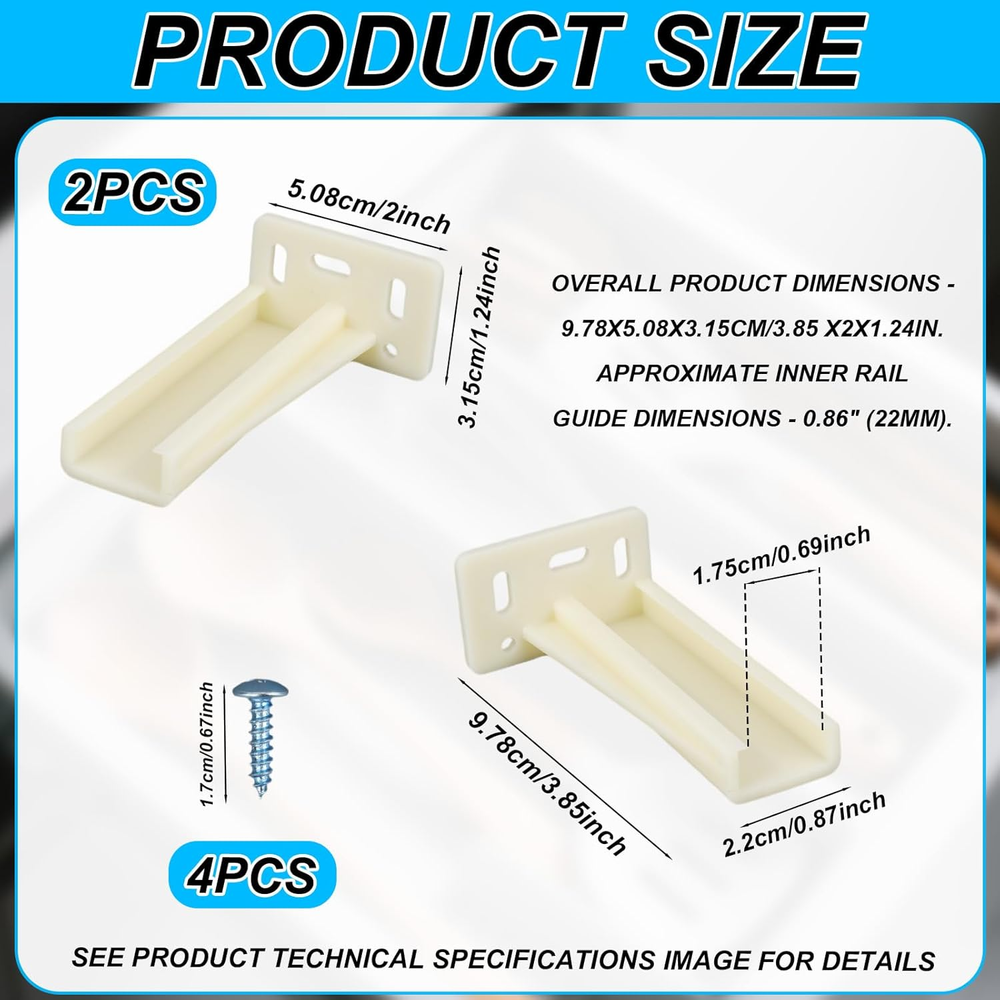 Package List: You will get enough number of drawer track socket brackets, and come with enough number of screws, practical functions and sufficient quantity can bring convenience to your daily use of furniture. Awesome Material: This drawer track socket bracket is mainly made of reliable plastic material, which is strong and durable, plus the metal screws can provide you with a sturdy and durable support, making your drawer last longer. Widely Used: Our drawer track socket bracket is suitable for most of the furniture in your room, such as bedroom dressing table, office furniture or bedroom cabinet, which is very versatile. Size Details: The overall size of this drawer track socket bracket is 9.78x5.08x3.15cm/3.85 x2x1.24in, which is a moderate size and can fit your cabinet perfectly. Easy Installation: You can easily install our drawer track socket bracket by removing the screws on the track bracket, replacing the old drawer slide joint, then finding the appropriate corresponding position and tightening the corresponding screws. Specification: Color: white, silver Material: plastic, metal Product Size: 9.78x5.08x3.15cm/3.85 x2x1.24in Package details: Sufficient number of drawer track socket brackets Sufficient number of screws Note: Due to manual measurement, the size and weight may have a certain error. Due to the difference between monitors, there may be a slight color difference.