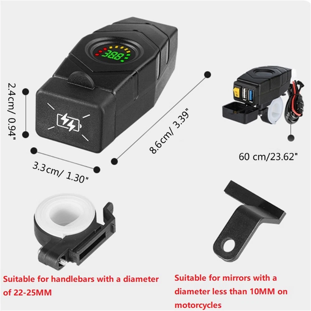 SAFE & SECURE SHOPPING 100% SATISFACTION GUARANTEED FAST SHIPPING Store Categories Store Categories You may also like 1 Pcs USB Charger With Bracket Durable 24V 36V 48V 60V For Mobile Phones Product Description 20-90V Handlebar USB Charger 24V 36V 48V 60V Electric Scooters Motorcycle QC3.0 Quick Charger for Mobile Phones Features: 1. Electric charger, with an input of 20V-90V, Do not allow two devices to charge simultaneously, supports QC3.0 fast charging, intelligently adjusts the output, and does not damage the 2. Intelligent chip safety protections, 6-fold intelligent safety protections for overvoltage, overcurrent, over-load, short circuit, and over temperature, which can faster improve charging efficiency and ensure safe use 3. LED voltages monitoring, real-time monitoring of electric vehicle voltages, to prevent problems caused by low voltages 4. With protective cover, dustproof and waterproof designing, preventing rain and dust from entering 5. Suitable for electric motorcycles handlebars with a diameter of 22-25mm/0.86-0.98" and mirror bases within a diameter of 10mm/0.39" Specifications: Material: Plastic Voltages Light Color: Blue, Green, Red(optional) Size: Approx. 86x33x24mm/3.39x1.30x0.94inch Cable Length: Approx. 60cm/23.62"/1.96ft Input: 20V-90V White USB Output: 5V2A/ 10W Blue USB Output: 5V3A, 9V2A, 12V1.5A 18W Applicable Voltages: 20-90V Package Includes: 1x USB Charger 1x Bracket Note: Not suppoted two devices to charge simultaneously. Not suitable for 12V motorcycles. Please allow 0-1cm error due to manual measurement. Please allow for slight color difference due to different display resolution. Shipping Returns Contact Us Payment Shipping 1. Items sent from US warehouse. 2.Receiving time = Processing time + Shipping time 3. Processing Time: Around 1-2 business Days 4. Shipping Time: 3-5 business day it may have a little delay during some holiday (such as Christmas),any problem ,please feel free to contact Returns 1. 30 days warranty from the purchased date. Please contact us via email before returning the defective item. 2.Our warranty does not extended to any product that are physically damaged or that are not under normal operating conditions as result of misuse or improper installation on the buyer/user's part. 3.Return items should include the original packaging and all accessories. buyers MUST contact us for the returning address. 4.In all cases, buyers pay shipping fees at their own cost to return products for exchange or refund. We will be responsible for the postage of replacements. Refund will be made upon receipt of the returned item. Contact Us Pls contact us if you have any problems,we will try our best to solve for you Payment We accept all verified payment from eBay. Copyright © 2022 Tongtool
