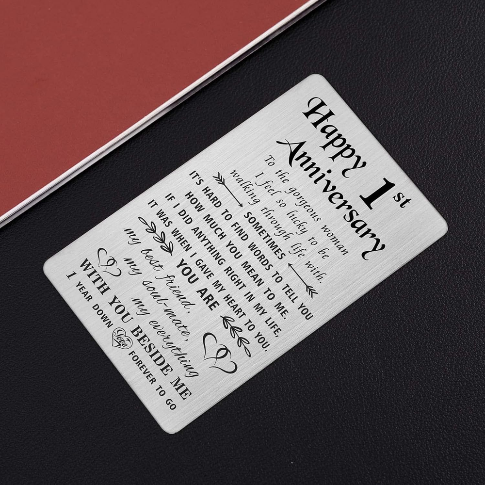 Store New Arrivals Add to Favorite View Feedback Contact Fast deliveries to the customer's home Quality customer service John Make the customers happy! 1 Year Anniversary Card Gifts for Girlfriend Wife, Happy First 1St Wedding Anniversary Cards for Women Her, Engraved Metal Wallet Insert Description 1 Year Anniversary Gifts for Her - Celebrate her with romantic 1st anniversary greeting cards, engraved with permanent love notes, could be keep for a life time. Best first one yr anniversary gifts for girlfriend women wife Engraved Metal Wallet Card - Made with Stainless steel, laser engraved keepsake, cute and lightweight, will not tarnish or change color, will not easy bend within wallet Credit Card Size - Approximately credit card size 3.38"x2.13"x0.03", fits perfectly in any wallet, could always be with your love Happy 1st Anniversary Card for Women - To the gorgeous woman I feel so lucky to be walking through life with. Sometimes it's hard to find words to tell you how much you mean to me. If I did anything right in my life, It was when I gave my heart to you. You are my best friend, my soul mate, my everything. WITH YOU BESIDE ME. 1 year down love forever to go Happy 1 Year Anniversary for Wife- Packaged with a nice blue paper envelope, sweet and ready for gifts giving Happy 1st Anniversary Card for Her Wife - To the gorgeous woman I feel so lucky to be walking through life with. Sometimes it's hard to find words to tell you how much you mean to me. If I did anything right in my life, It was when I gave my heart to you. You are my best friend, my soul mate, my everything. WITH YOU BESIDE ME. 1 year down love forever to go Item model number TW3001 Style 1st Anniversary for Her Number of Items 1 Color Silver Manufacturer Part Number TW3001 Item Weight 2.89 ounces Pre-printed happy 1st anniversary Product Dimensions 3.38 x 2.13 x 0.04 inches Size Credit Card Size ABOUT US We offer the best prices around on high quality products. Our E-store includes media such as books, movies, music and games while offering electronics, toys, sporting apparel, clothing, tools, general home, garden items and more. SHIPPING We are always working hard to ensure your package arrives as soon as possible. Please understand that some factors like weather, high postal traffic, and the performance of shipping companies are outside of our control. We offer free shipping to the lower 48 states and ship within 2 business days of payment, usually sooner. We do not accept P.O. Boxes. Please provide a physical address. For shipping outside of the continental USA, we only use eBay's Global Shipping Program. The item is shipped to KY and then sent to the rest of the world. International customers are responsible for all duties and taxes. Continue to 'check out' to calculate costs for shipping the item to your country. Messages regarding eBay's Global Shipping Program MUST be directed at eBay EXCLUSIVELY. RETURNS We offer a 30-Day Return Policy on items in which you are not completely satisfied with. You have the option of a full-refund or an exchange of the item. No returns are available on items shipped outside of the USA PAYMENT We accept PayPal. CONTACT US This page content is yet to come Please ad us to your favorite seller and visit again later Thank You CUSTOMER SATISFACTION We try our very best to make sure every customer is completely satisfied. If there's a problem, message us! We're happy to help. WE ACCEPT