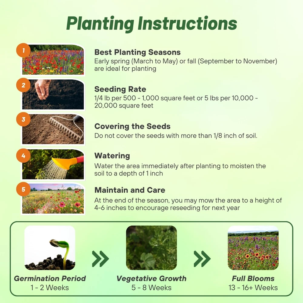 To meet the special growing needs of Texas and Oklahoma, this wild flower seed mix was formulated, and it includes: 18% Baby's Breath, Annual 18% Candytuft, Annual 11% Coneflower, Purple 9% Cornflower, Dwarf Blue 9% Coreopsis, Lance Leaved 9% Cosmos Sulphur Bright Lights 9% Indian Blanket 9% Sage, Scarlet 2% Coneflower, Clasping 2% Verbena, Purple Moss 1% Coneflower, Prairie 1% Black-eyed Susan 1% Coreopsis, Plains 1% Evening Primrose, Showy This mix can be used in both Texas and Oklahoma except for the extreme eastern and southern areas of Texas and the extreme eastern area of Oklahoma. Prepare a site by removing weeds and loosening soil. Seed can be broadcast and raked into the soil, covering 2 – 3 times their thickness, or seed can be drilled to a maximum of ¼ inch. This Texas and Oklahoma mix should be planted in the spring once soil temperature warm to 55F. Seed should stay moist by either rainfall or irrigation until germination occurs. To meet the special growing needs of Texas and Oklahoma, this wild flower seed mix was formulated, and it includes: 18% Baby's Breath, Annual 18% Candytuft, Annual 11% Coneflower, Purple 9% Cornflower, Dwarf Blue 9% Coreopsis, Lance Leaved 9% Cosmos Sulphur Bright Lights 9% Indian Blanket 9% Sage, Scarlet 2% Coneflower, Clasping 2% Verbena, Purple Moss 1% Coneflower, Prairie 1% Black-eyed Susan 1% Coreopsis, Plains 1% Evening Primrose. Grows best in USDA zones 6 - 10. It is an annual and perennial mix reaching a height of 24 - 32 inches. This mix can be used in both Texas and Oklahoma except for the extreme eastern and southern areas of Texas and the extreme eastern area of Oklahoma. Prepare a site by removing weeds and loosening soil. Seed can be broadcast and raked into the soil, covering 2 – 3 times their thickness, or seed can be drilled to a maximum of ¼ inch. This Texas and Oklahoma mix should be planted in the spring once soil temperature warm to 55F. Seed should stay moist by either rainfall or irrigation until germination occurs. Sowing Rate: 1/4 LB Per 500 - 1,000 SF or 5 LBS Per 10,000 - 20,000 SF. Most wildflower seeds and mixtures have a purity of 95-99% and total viable seed percentages of between 70-95%. The total viable seed percent is the germination percent, plus the hard seed or dormant seed percent. Hard seeds have impermeable seed coats and cannot imbibe water during seed testing. Dormant seeds are viable seeds that have specific physical or physiological conditions.