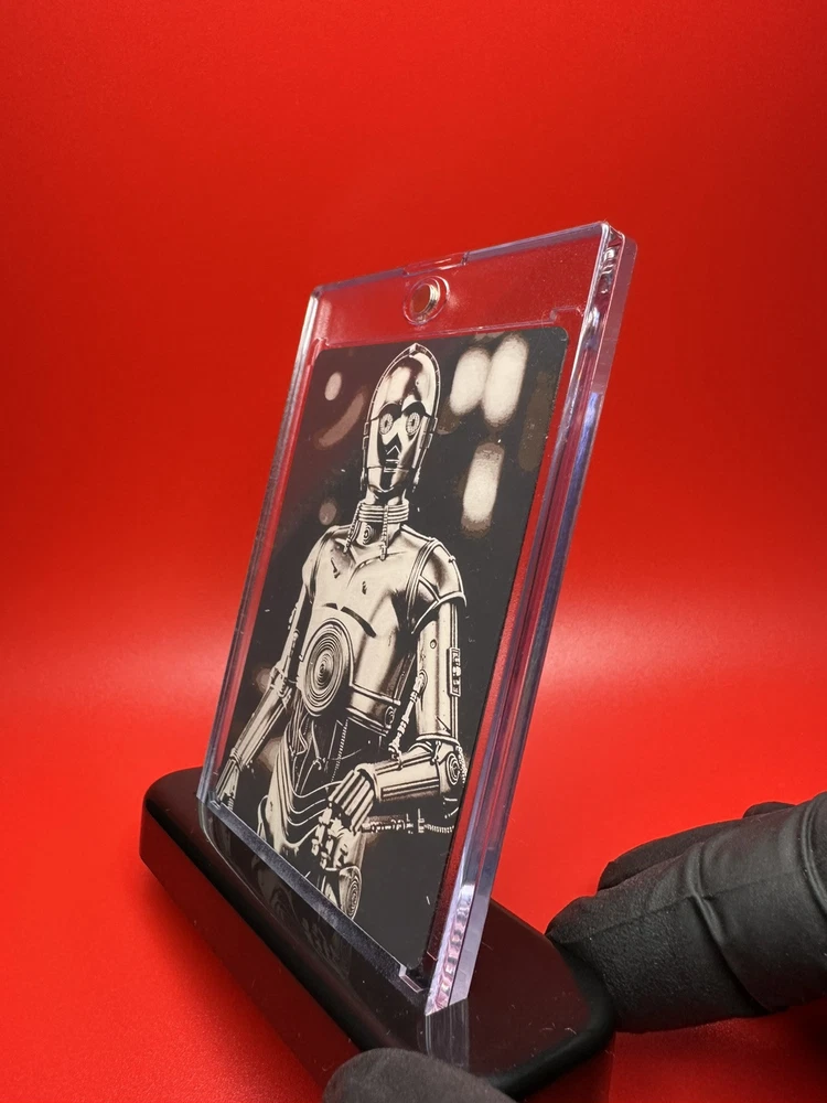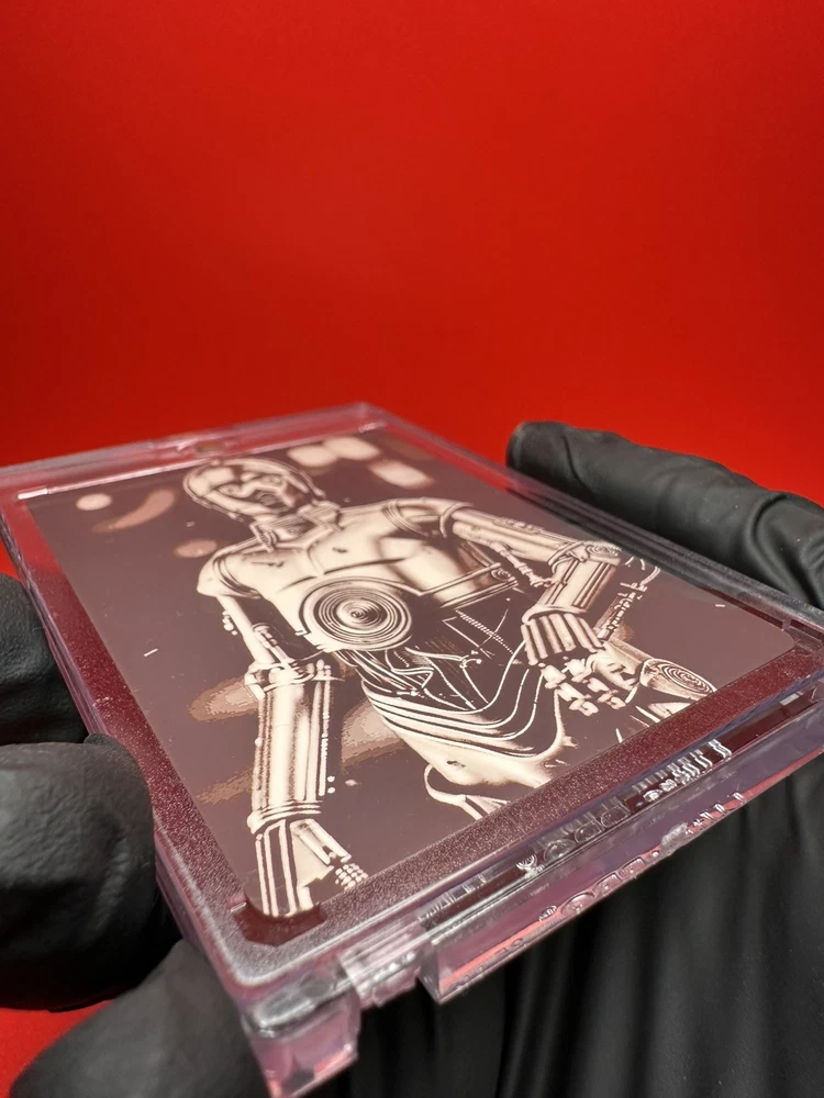 NEXUS MINT Presents - C-3PO 1 oz .999 Fine Silver Card (1 of 1) We are thrilled to announce a significant enhancement to our image resolution for our laser engraving process. Our dedicated team has pushed the boundaries of innovation to deliver a product that exemplifies sophistication and precision like never before. Prepare to be amazed as our laser engraving technology now boasts an extremely high resolution, ensuring every intricate detail is captured with stunning clarity. Each Nexus Mint Silver Card is a masterpiece, meticulously crafted from the finest .999 pure silver and engraved with a level of detail that will leave you in awe. Introducing our latest innovation: the Reverse Side Boast with a stunning "Frost Silver finish". After extensive testing and development, we are proud to present the new frost texture that takes our craftsmanship to astonishing heights. This addition showcases our commitment to excellence and luxury. The reverse side is meticulously engraved with essential details, including the Nexus Mint logo, weight, purity, and an exclusive mintage. This unique feature ensures that each piece is truly a one-of-a-kind art piece. What sets our silver card apart is the innovative and advanced laser engraving process employed, representing the pinnacle of our craftsmanship. This cutting-edge technique allows us to capture and replicate images with unparalleled clarity and finesse, surpassing traditional methods and setting a new standard in precision engraving. Whether you're commemorating a special occasion, gifting a luxurious keepsake, or adding to your collection of precious metals, our Nexus Mint Silver Cards are the epitome of elegance and quality. Expect nothing less than perfection as you hold a piece of art in your hands, reflecting our commitment to excellence and your discerning taste. Elevate your collection today with the Nexus Mint .999 Fine Silver Cards – where every engraving tells a story of precision and beauty. Don't miss out on experiencing the pinnacle of laser-engraved silver cards. Order now and see the difference for yourself! Card Highlights: - Metal content: .999 Fine Silver - Approximate weight: 1 oz ( However, the weight of each card may vary slightly due to material being removed in the laser engraving process.) - Dimensions of the card: 2 1/2 x 3 1/2 - 0.02 Inches (0.51mm) thickness - Exclusive mintage: 1 - Packaging includes: C-3PO 1 oz .999 Fine Silver Card (1 of 1) Ultra clear slab to handle and showcase the fine silver card (35pt card) (SEALED) One-Touch stand to display the fine silver card Trading card protectors Bubble wrapped At Nexus Mint our top priority is our customers. We are dedicated to ensuring that every customer service experience we offer is second to none. Our business is built on the premise of community engagement. We therefore thrive to promote and maintain an interactive environment that facilitates positive relationships with our customers. We hold our products to a high standard and each product must satisfy our quality assurance test. For us every single detail matter, from packaging to the production of the actual fine silver card. We aim to produce products that are innovative, timeless and of high quality. We're always happy to help! for questions regarding your order please don't hesitate to ask. Count on Nexus Mint for all your premium, fine silver and gold cards, bars and coins.