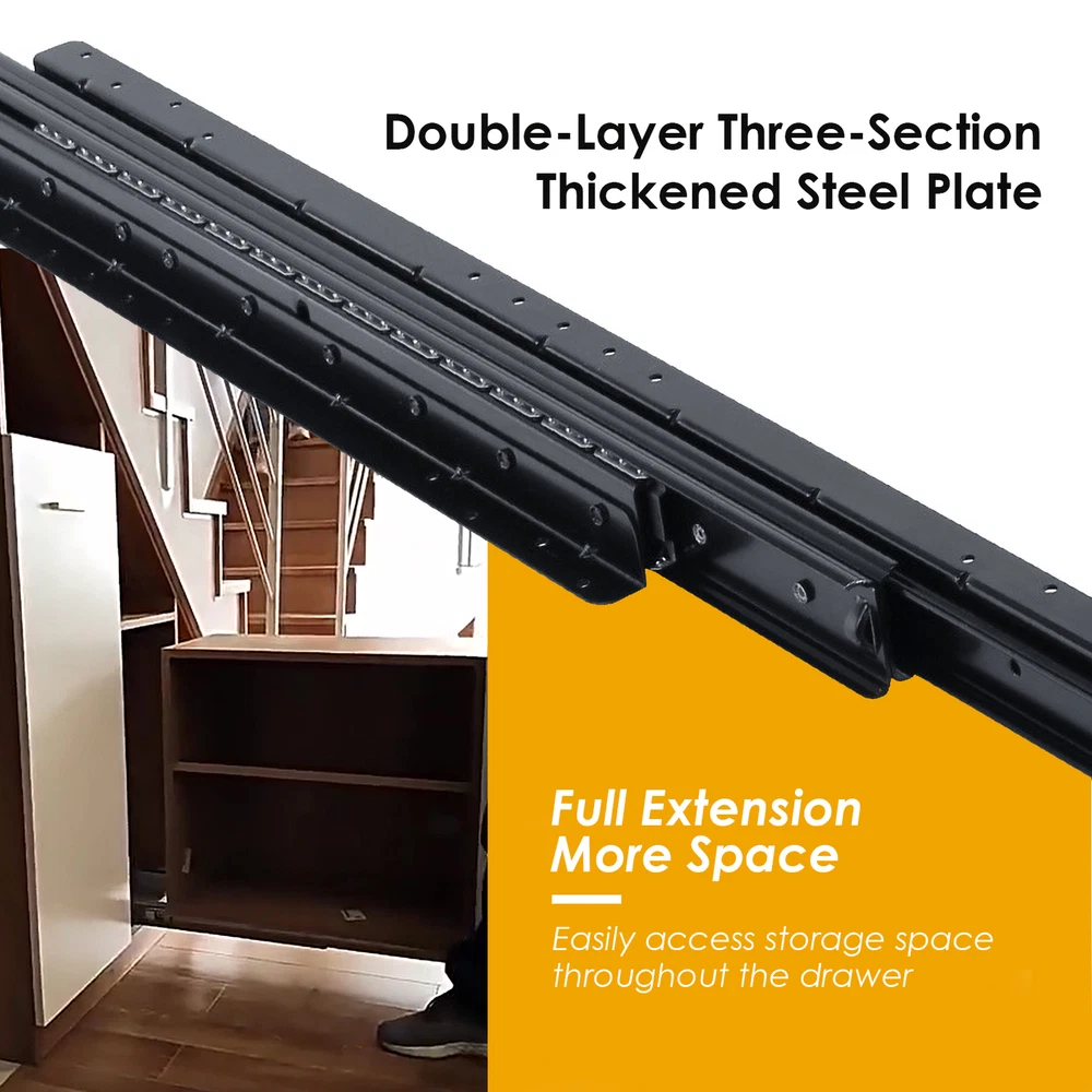Store category Sign Up Now ! You may also like Product Description Bullet Points: Wonderful Resilience: Constructed from high-density, high-strength 2mm thick cold-rolled steel, these drawer slides boast wonderful durability. The industrial-grade solid steel balls provide heavy load capacity, ensuring a long service life for any heavy-duty industrial application. Smooth and Silent Operating: Treated with electrophoretic coating to resist rust and minimize friction, our heavy duty drawer slides are equipped with industrial-grade steel balls for a silent and smoother sliding experience. Featuring excellent load-bearing capacity, these slides are made of solid steel for lasting durability. Effortless Accessibility: With full-extension, these heavy duty drawer slides allow you to efficiently expand your storage space, providing ample room to screw in stairs during installation and access items easily on a daily basis. Effortless Glide: By adding 12 more steel balls on the same track length, our heavy-duty drawer slides enable gently sliding and labor-saving operating. The anti-collision silencers prevent sticking and noise when opening or closing, making it a strong and stable product. Versatile Mounting: Our heavy-duty drawer slides provide enhanced stability and support for any tall and heavy cabinet, making them ideal for bottom mounting in sundry cabinets, wine cabinets, stair cabinets, and storage units. Don't compromise on stability. Our bottom mounted drawer slides are made of high-density, high-strength 2mm thick cold-rolled steel. They improve the load-bearing capacity of the slide and can be extended efficiently. Our slides are more labor-saving and perfect for your storage cabinets. Specifications: Product name: Heavy Duty Drawer Slides (screws included) Product size: 600/800/1000 mm A about 600 mm/23.62 inches B about 800 mm/31.5 inches C about 1000 mm/39.37 inches Stretching range: 600-1450/800-1850/1000-2250 mm Maximum load: about 120 kg Packing quantity: 1 pair Color: Black Track width: about 94mm/3.7 inches Packing List: 2* Cabinet Drawer Slides Note: Due to different lighting and screen settings, the item color may be slightly different from the picture. Due to different manual measurements, please allow a 1-2cm difference in size. Payment Delivery details Terms of sales About us Feedback & DSRs Payment Before you palce an order, please kindly make sure that you have a paypal account. We accept PAYPAL payment only. Payment should be completed within 2 days after auction closed, or unpaid dispute will be filed for an closing auction. An unpaid case will be filled after 4 days. Delivery details We ship to your eBay address. Each package will be shipped to US by UPS Regular Parcel with tracking number. Please check your shipping address carefully before checkout, it can't be changed if order completed. All items will be shipped within 1-2 business day upon receipt of payment.Orders placed on weekend will be shipped within 3 days. If you do not receive your item in 7-10 business days.please contact us immediately for further assistance. We will be responsible for any damages or losses incurred in the shipping process. About us We maintain high standards of excellence FIVE STAR and strive for 100% customer satisfaction! Positive Feedback is very important to us. We hope that you contact us immediately Before you give us neutral or negative feedback, so that we can satisfactorily address your concerns. We promise to offer the lowest price and high quality produce. Our working time: From Monday to Friday(9:30 am to 18:00pm), we don't working on holidays ,hope you can understand and know that , thank you. Please always talk to us via ebay Message. We appreciate your business and look forward to growing our e-Bay sales with satisfied customers. Feedback Contact us If you have any questions, please feel free to contact with us by ebay Message during our business hours ( 9:30a.m. to 5:30 p.m.), or email us through eBay, we will try our best to help you to resolve it. For any presale or after-sale questions,please do feel free to email us! Due to the time difference, each email will be replied within 1 working day,and weekend will be delayed a bit. Feedback