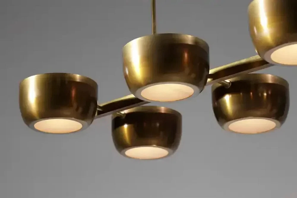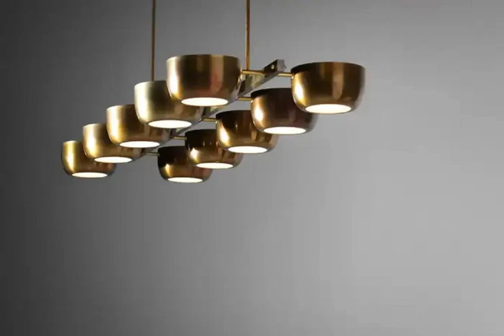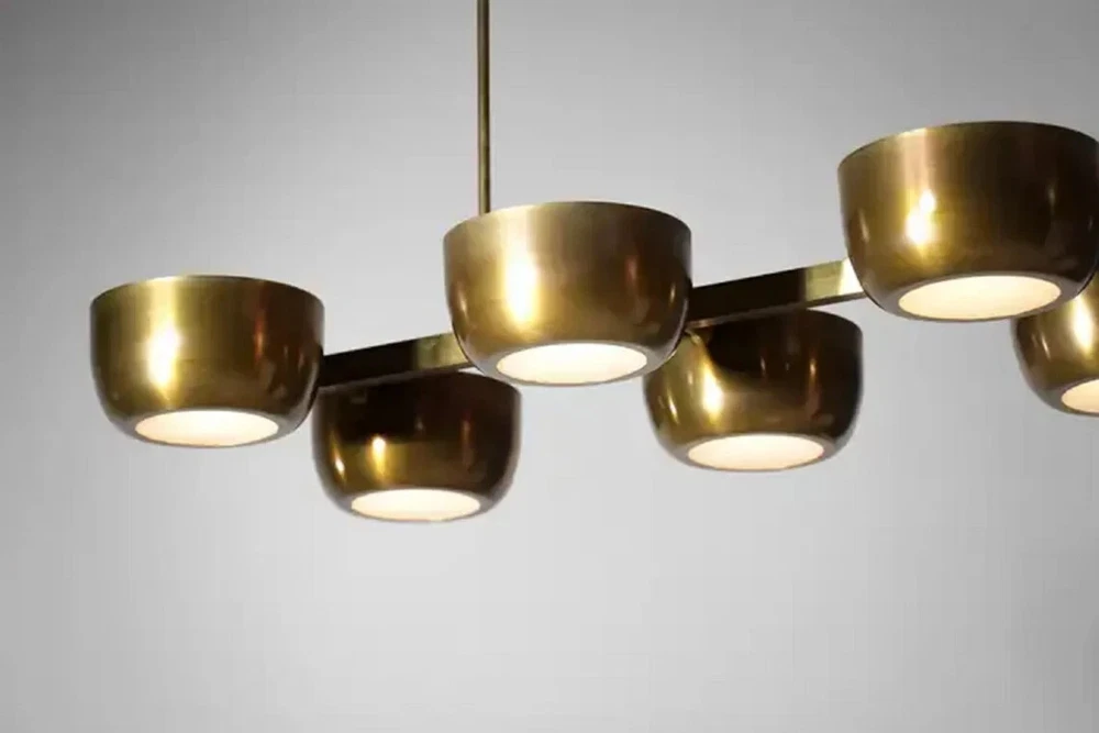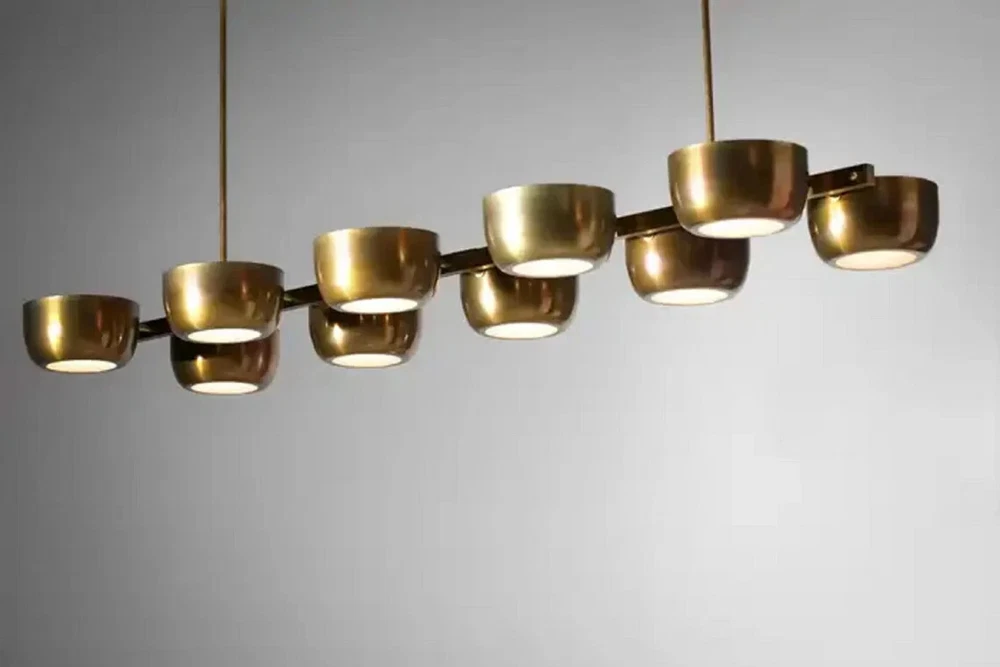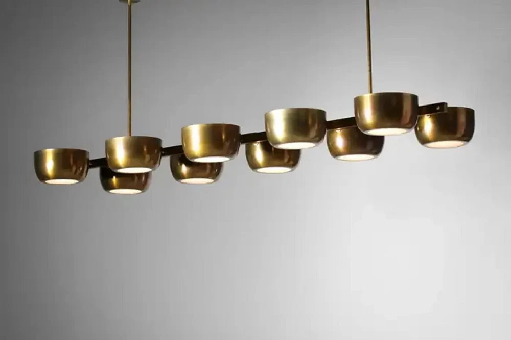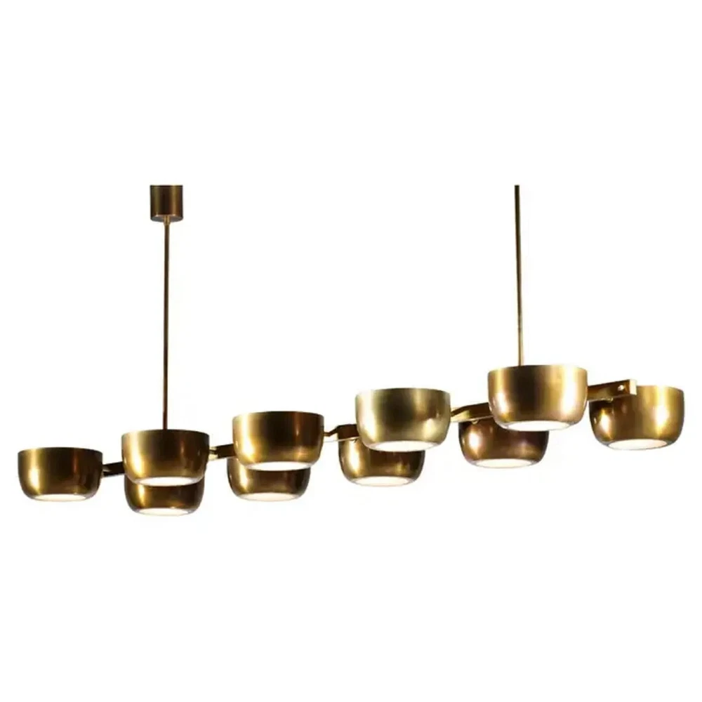 About this item 10 Arms Mid century Italian Modern Chandelier in Solid Brass Scale 10 Cups ceiling Light. Sculptural modern Italian chandelier, handcrafted in the taste of the 60s design. "Ladder" structure with a central bar on which rest 10 solid brass cups with a white Frosted. Recommended LED bulbs type E14. Brass finish and customized sizes available on request. -Made with heavy brass material - 21" Width x 50" depth x 29" total height itself - Total Length : Custom drop lengths are available. - 5 inches mounting canopy. custom canopy available. - Required 4 x E12 120 voltage standard base bulbs. - Required 4 x E14 240 voltage standard base bulbs for European countries. - UL listed material and components. - Bulbs not included with the purchase - Compatible with all medium base bulbs including LED, Edison and CFL.