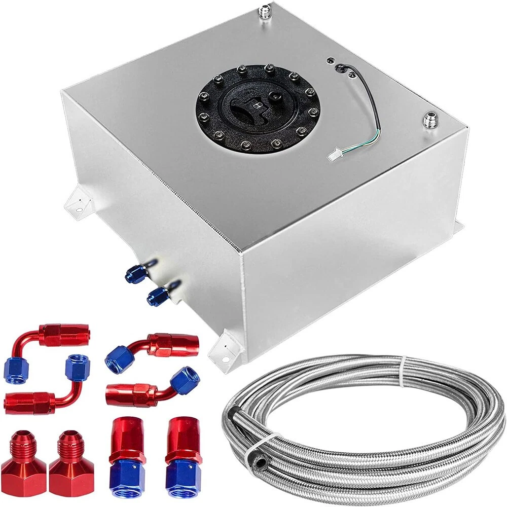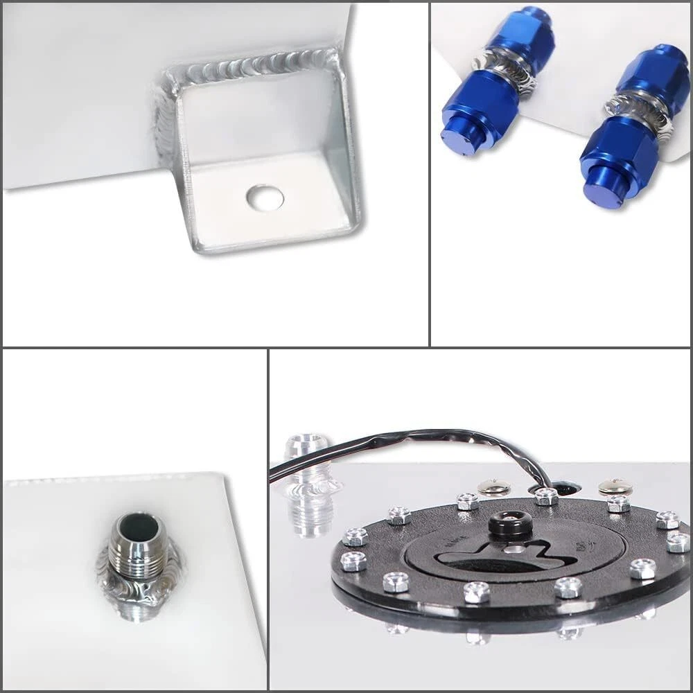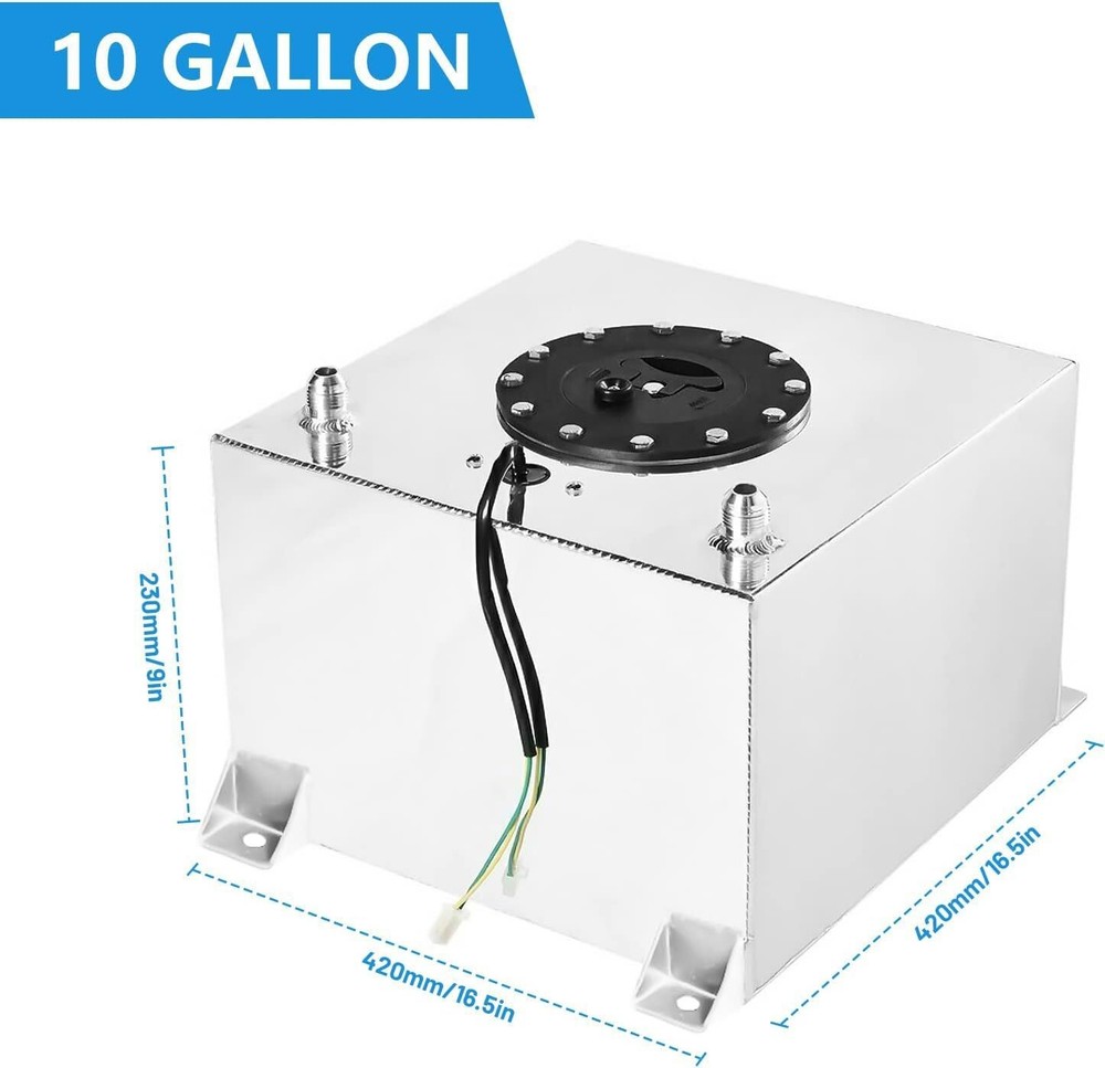 10 Gallon Aluminum Fuel Cell Gas Tank+Cap+Level Sender+Nylon Fuel Line Kit Slive ⛽ 10 Gallon Aluminum Fuel Cell Kit – Silver | W/ Level Sender, Nylon Fuel Line Kit & Cap ⛽ 【Dual -10 Outlets/Vents | 0-90 Ohm Sender | 12ft AN-6 Braided Hose】For Hot Rods/Race Cars/Trucks/SUVs (Gasoline Only) 1. Core Features 🔹 Universal Fit for Custom Performance Vehicles Engineered as a complete fuel system upgrade for aftermarket builds (not factory stock vehicles), with flexible mounting to suit diverse setups: Vehicle Type Compatible Uses Performance/Race Cars Track cars, street racers, drag cars (solves factory tank bulk/weight issues) Classic/Modified Vehicles Hot rods, restored trucks/SUVs (seamless custom fuel system integration) Off-Road Builds Buggies, lifted trucks (durable aluminum resists off-road debris and corrosion) Critical Restriction : For gasoline only – CANNOT use with alcohol, methanol, or water (will damage the tank, hose, and fuel system components). 🔧 Premium Silver Aluminum Tank – Safe & Performance-Driven Outperforms factory steel tanks with race-ready design and durability: High-Grade Aluminum Construction : Lightweight (reduces vehicle weight for better performance) yet rigid – resists rust, fuel degradation, and impact. Silver finish adds a sleek, show-ready look to under-hood builds. Anti-Sloshing Foam Core : Filled with open-cell foam to minimize fuel movement during aggressive driving (prevents unbalanced handling or fuel starvation to the pump – critical for race conditions). 6"×6"×2" Deep Sump : Collects fuel at the tank’s bottom, ensuring consistent delivery to the fuel pump (even at low fuel levels or sharp turns). 🌟 All-In-One Kit – No Extra Parts Needed Includes everything for a full fuel system upgrade, saving time and effort: 10 Gallon Fuel Cell : Dual -10 fuel outlets (ideal for high-flow setups like dual fuel pumps). Dual -10 vent outlets (prevents pressure buildup, ensuring smooth fuel flow). Built-in 0-90 Ohm level sender (works with most aftermarket fuel gauges – no separate purchase required). Secure quick-release cap (tool-free refueling for race days or daily use). AN-6 Braided Fuel Line Kit : 12ft stainless steel/nylon braided hose (resists 1500 PSI pressure and -40°F to +350°F temperatures – safe for high-performance use). 8 fittings total: 2 straight, 2 45°, 2 90° AN-6 swivel ends (flexible routing); 2 AN-6→AN-10 adapters (connects the tank’s -10 outlets to AN-6 lines). 2. Technical Specifications Parameter Category Detailed Specifications Condition 100% Brand New Product Type 10 Gallon Aluminum Fuel Cell + AN-6 Fuel Line Kit Tank Material High-grade aluminum (silver finish) Tank Dimensions - Overall: 16.5"L × 16.5"W × 9.25"H - Mounting Tabs (Center-to-Center): 18"L × 14.25"W - Sump: 6"L × 6"W × 2"H (deep) Tank Capacity 10 Gallons Tank Ports 2 × -10 fuel outlets; 2 × -10 vent outlets Level Sender Built-in 0-90 Ohm (compatible with most aftermarket fuel gauges) Fuel Line Kit - 12ft AN-6 stainless steel/nylon braided hose - 2 straight + 2 45° + 2 90° AN-6 swivel ends - 2 AN-6→AN-10 adapters Fuel Compatibility Gasoline only (no alcohol/methanol/water) Warranty 90-Day Manufacturer Warranty; 30-Day Free Return Shipping Dispatched within 24 hours (excludes weekends/holidays); NOT shipped to Puerto Rico 3. Package Included 1 × 10 Gallon Silver Aluminum Fuel Cell (with built-in 0-90 Ohm sender + quick-release cap) 1 × AN-6 Fuel Line Kit (12ft braided hose + 8 fittings, as shown) 4. Usage & After-Sales Tips Installation Guidelines Professional Installation Recommended : Requires custom bracketry (to match your vehicle’s mounting points) and fuel system knowledge (e.g., routing hoses away from hot components like exhausts). Foam Maintenance : Inspect the tank’s anti-slosh foam regularly for deterioration – replace foam if it breaks down (prevents debris from clogging fuel lines). Hose Care : Avoid kinking the braided hose (maintains fuel flow); do not exceed 1500 PSI pressure or +350°F temperature. After-Sales Support Fitment Check : Measure your vehicle’s intended mounting area (16.5"L×16.5"W×9.25"H) before installation to ensure space. Defects : If the tank leaks, fittings are missing, or the sender malfunctions, contact the seller first for a warranty replacement. The ultimate all-in-one fuel upgrade for custom builds! This kit combines durability, performance, and ease of installation – perfect for hot rod, race car, or modified truck enthusiasts. 🚗⛽