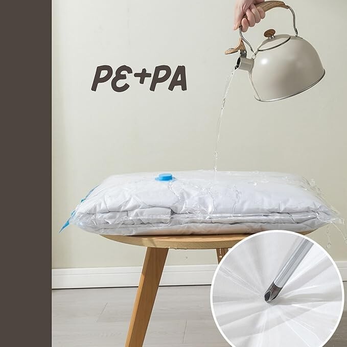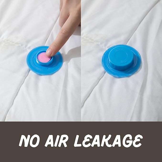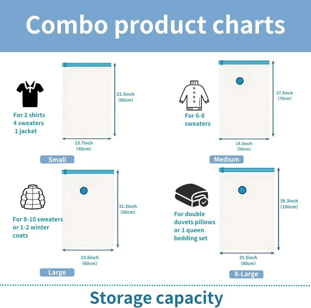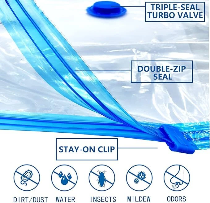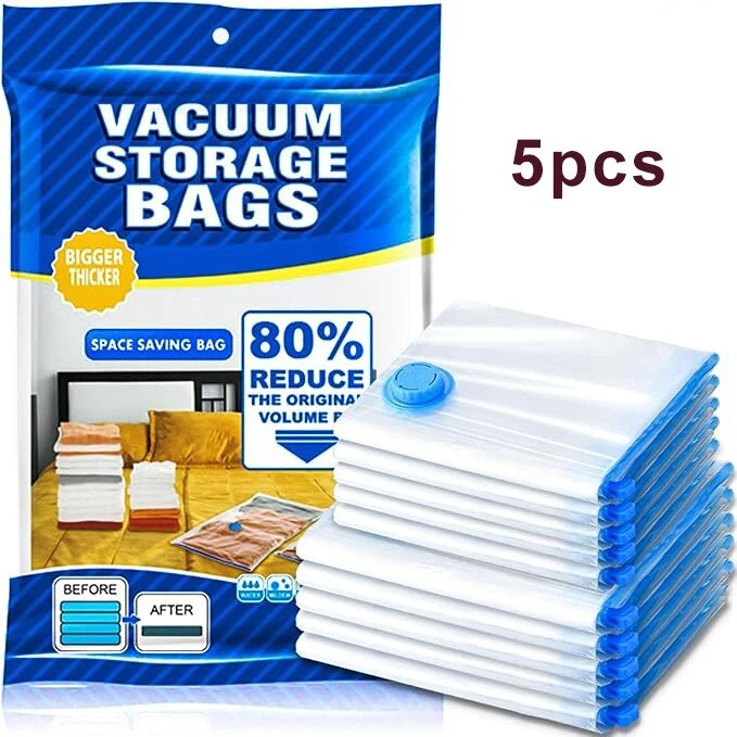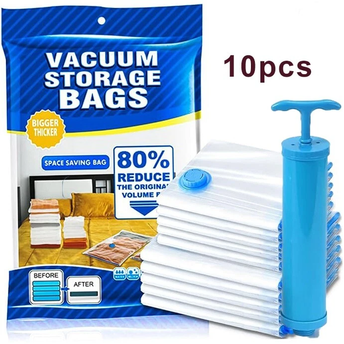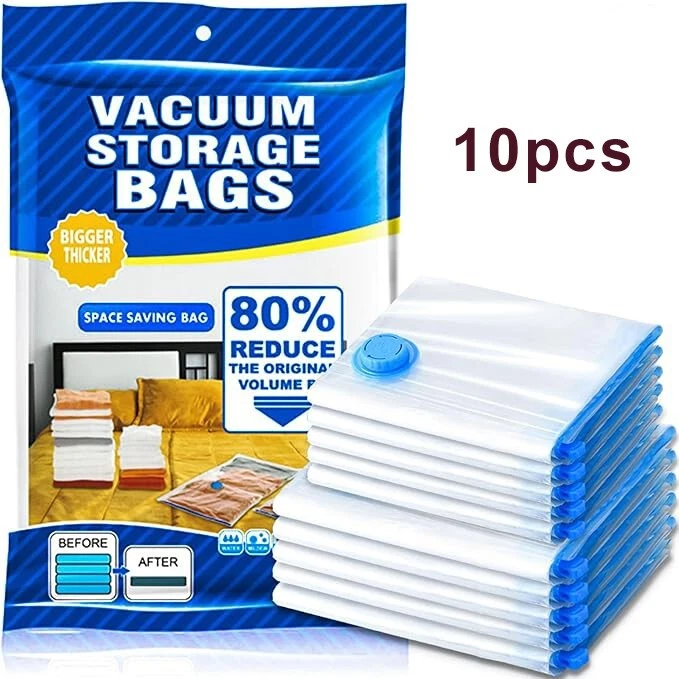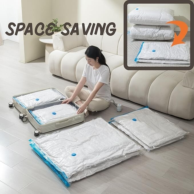 Product Description Our vacuum bags are great for maximizing luggage space for when you want to travel lighter and more efficiently. Use our space saver bags and store away variety size items including bedding clothes, blankets, pillows, plush toys, and more. What's more: you can use our compression bags to reduce larger and fluffier items such as vests and winter coats to minimal sizes with ease. Our jumbo vacuum storage bags come in handy for packing hefty item such as big quilts, bedding or blankets. Each vacuum storage bag is designed with a unique double-zip seal, and a triple-seal turbo valve to ensure no air gets in or out after the bag is sealed. These simple bags can be easily loaded and sealed using a home vacuum cleaner to reduce larger and fluffier articles of clothing like vests and winter coats to their minimum possible size. 6 packs includes 2 Medium/2 Large/2 Jumbo vacuum storages bags can help you save 80% storage place. Note: 1. Please do not remove the pink/transparent silicone from the valve. 2. Firmly grasp the sure-zip slider using your thumb and index finger. Then, slide the zipper across the top of the bag. Make sure to slide the zipper back and forth at least twice. Press down a little harder to ensure a tight seal has been made, and no air will leak out. On Mar 30, 2025 at 01:34:29 PDT, seller added the following information:
