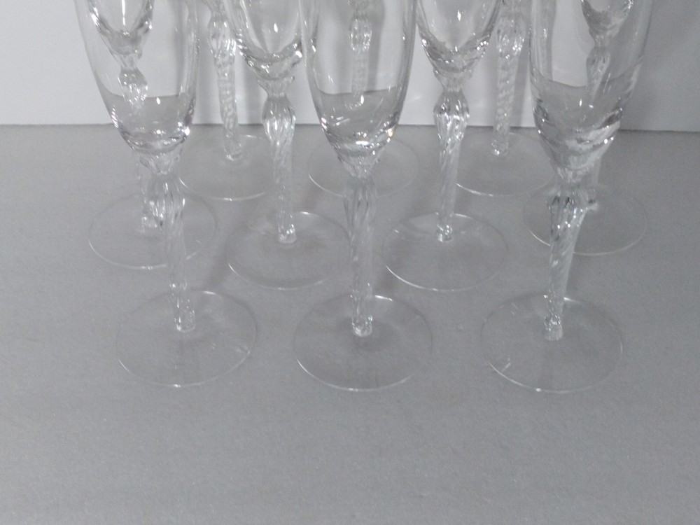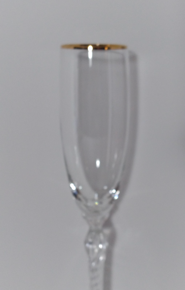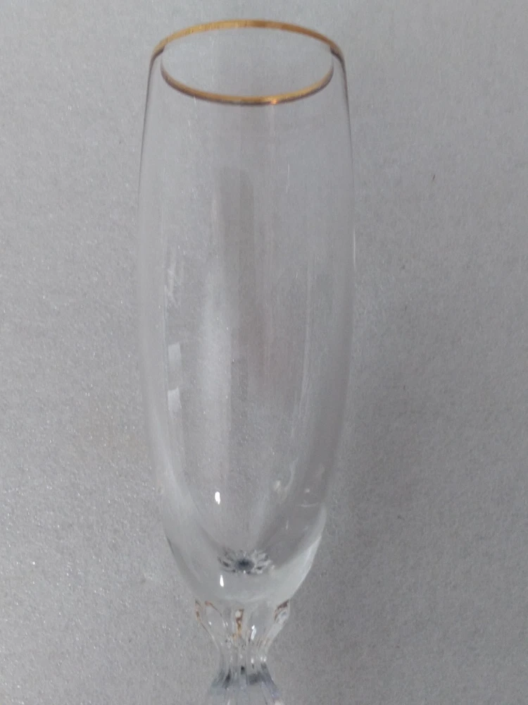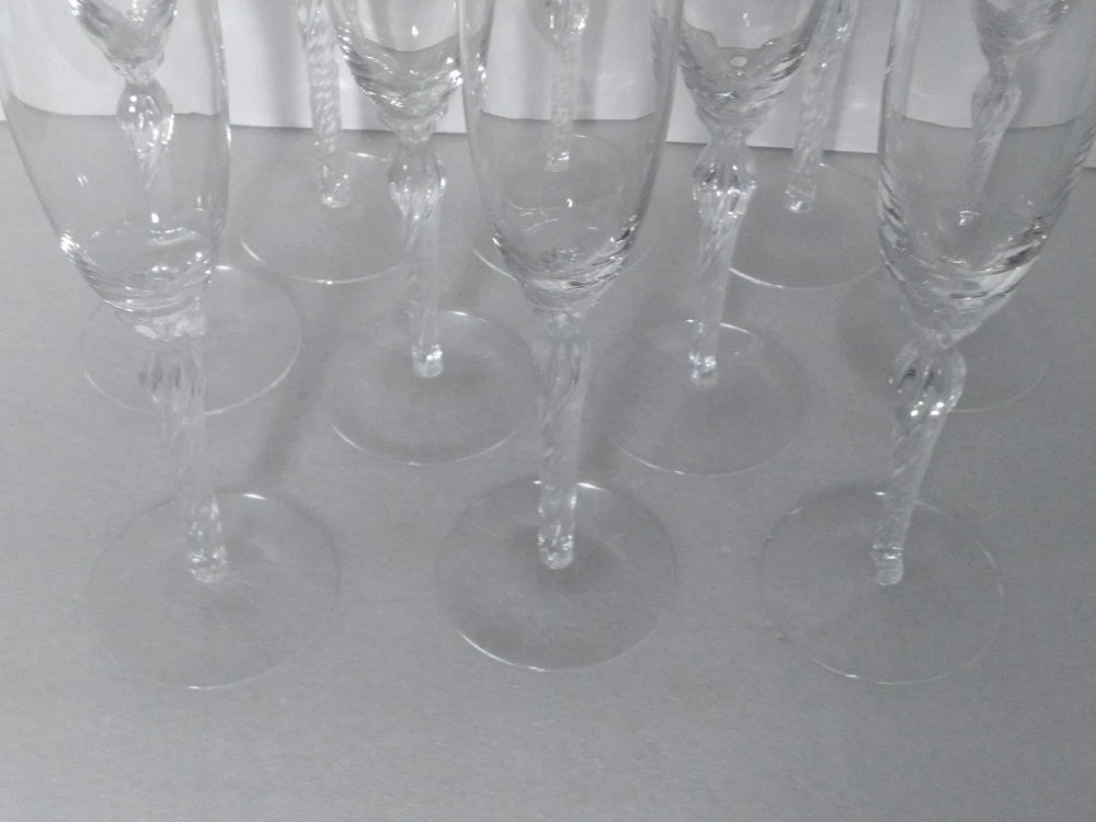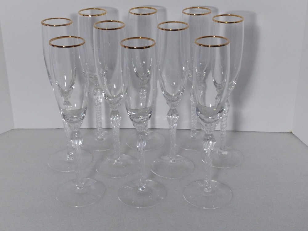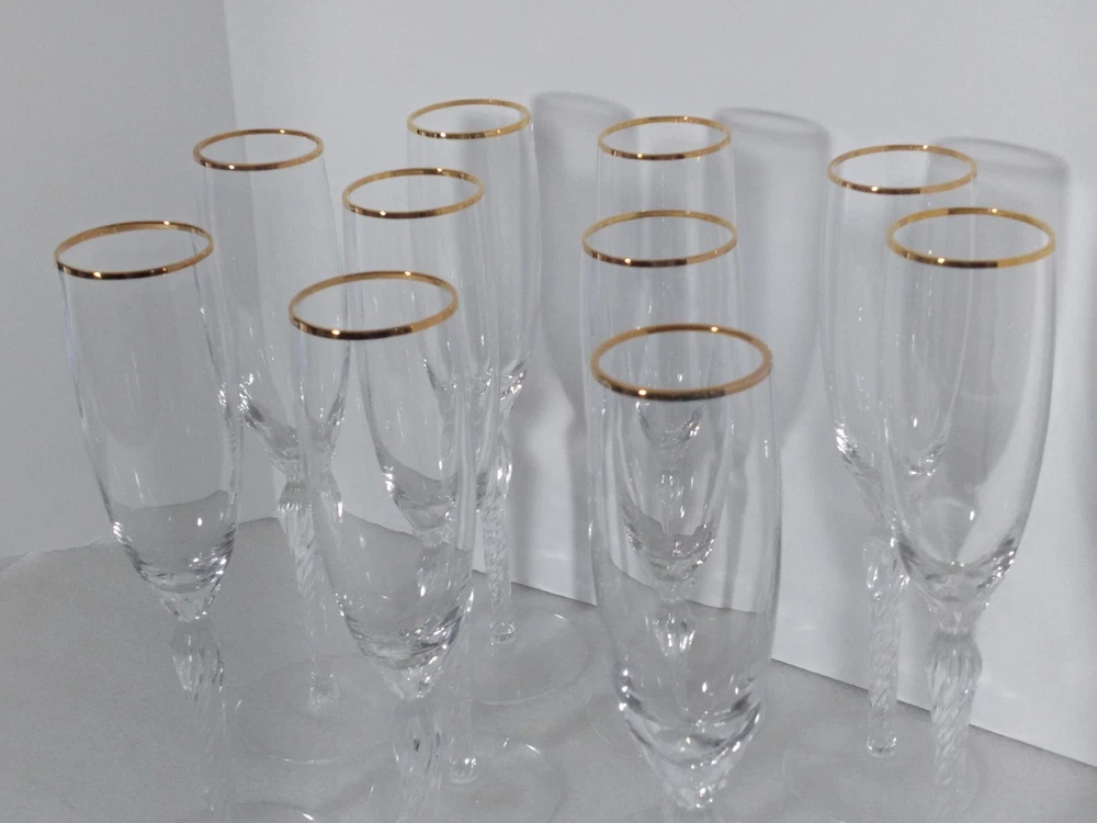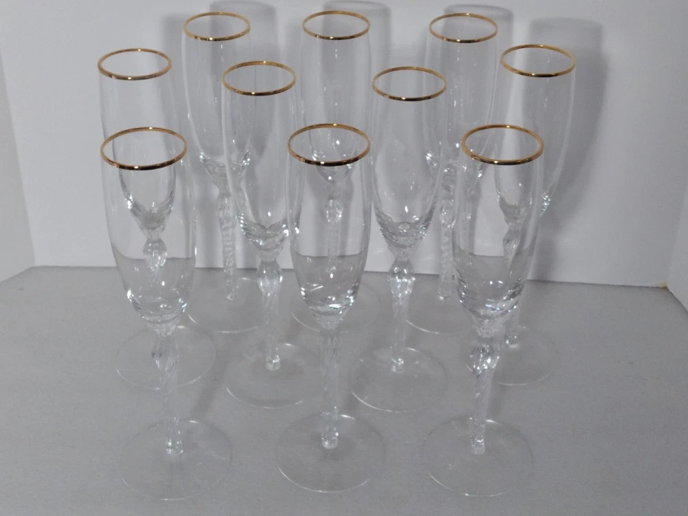 This set of 10 Lenox Monroe Gold Trim 9 1/8" Fluted Champagne Glasses is luxurious and elegant drinkware for any occasion. Made with hand-blown crystal glass and featuring a glossy finish, these vintage glasses have a modern style with a gold trim that adds a touch of luxury. The glasses are signed by Lenox, a reputable brand known for high-quality glassware, and are made in the United States. These champagne glasses are a perfect addition to any glassware collection for those who appreciate fine craftsmanship and timeless design. These have never been used, were stored away in a glass cabinet for show, I have rinsed soaked them in water before listing