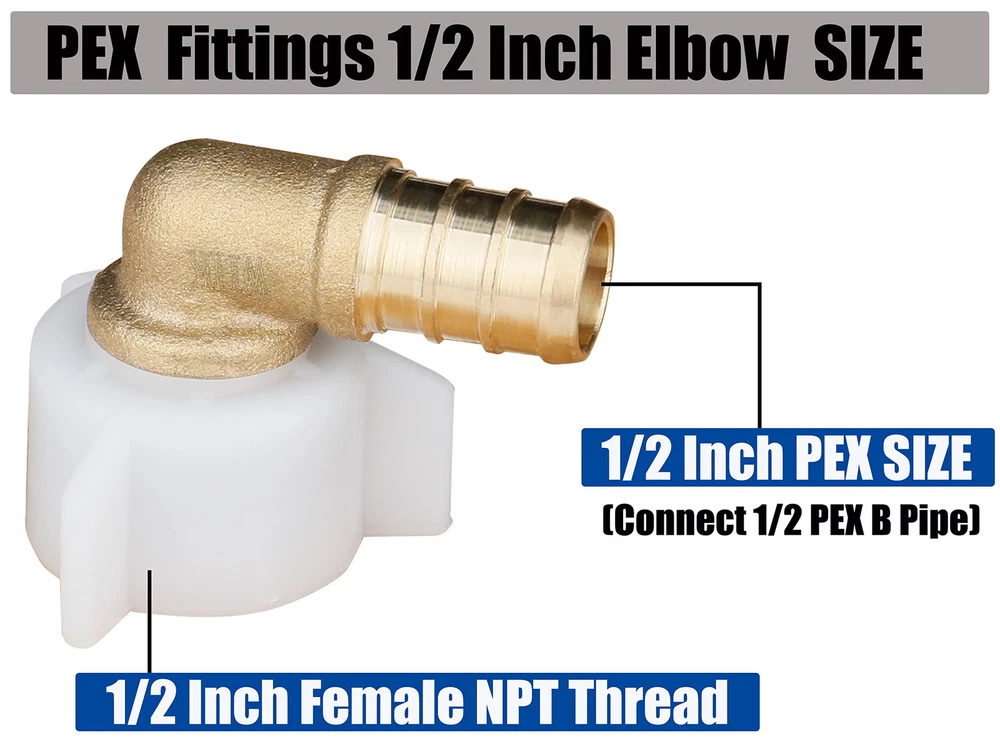 The measurement Pex fittings is 1/2 inch PEX x 1/2 Inch Female NPT(FPT),it is 90 degree PEX swivel crimp Connectors,Fast and Easy intallation,You just need only spend a few seconds by your hand to quick connect 1/2 NPT PEX B/PEX C pipe to Your home or RV Plumbing fitings system.The pex pipe fittings is made of high quality Lead free brass which can ensure your home or RV PEX Fittings systems use safe and hot and cold water,The fauce pex connectors has complied with ANSI-61/NSF and ASSE 1061 American standard,It can widen use all kinds of PEX B or C Tubing. SIZE OF PEX FITINGS: 1/2 Inch Pex Fittings X 1/2 Inch Female NPT (FPT) Elblow Fittings,It is 1/2 Inch PEX 90 degree Swivel Fittings. MATERIAL: 1/2 Inch PEX fittings use 100% Quality DZR Lead Free Brass,More Safe and More ,It's good chosie to apply for RV plumbing fittings,RV Water line fittings,RV toilet water line and PEX faucet adapter. EASY TO INSTALLTION AND SAVE TIME: Pex 90 degree 1/2 Inch Fittings just need to spend a few second,No soldering or glue; Just crimp to create a watertight seal. WIDE APPLICATION:The Pex fittings 1/2 inch 90 degree elbow is Suits for all Brands of Pex B or C Tubing(DON'T use PEX A Pipe).Work with Crimp Connection System (PEX Crimp tool+Copper Crimp Rings) or Clamp Connection System (PEX Clamp tool + Stainless Steel PEX Clamps) PACKAGE INCLUDES AND CERTIFICATE :PEX crimp Fitting includes 10 PCS 1/2" PEX X 1/2 Inch FPT swivel eblow connectors,They are used for potable water and hydronic heating water distribution,The products are comply American standard ANSI-61/NSF and ASSE 1061.