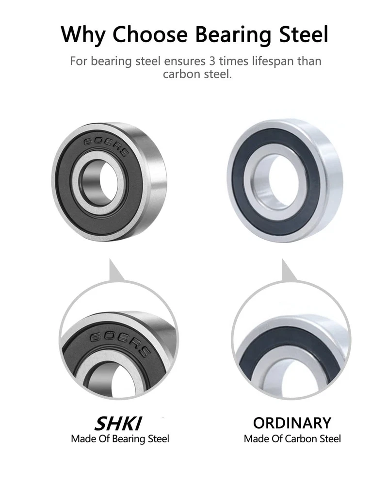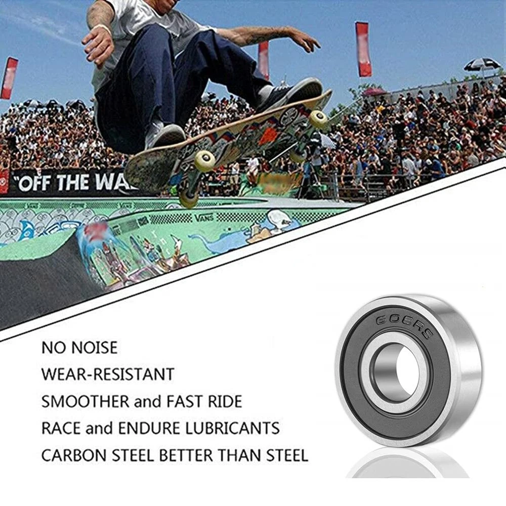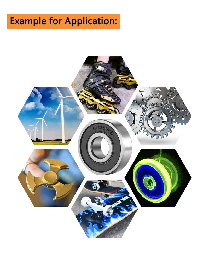 Features: 608-2RS ball bearings are a type of deep groove ball bearing that has two rubber seals to protect the bearing. These bearings are commonly used in skateboard wheels, inline skates, and other small machinery. 1. Smooth operation: 608-2RS ball bearings are designed to provide a smooth and efficient operation, which is essential for high-speed applications. 2. Low friction: The low friction coefficient of these bearings allows them to spin with minimal resistance, reducing energy loss and extending their lifespan. 3. High durability: The rubber seals protect the bearing, increasing their durability and longevity. 4. Versatility: These bearings are widely used in a variety of small machinery applications, including skateboard wheels, inline skates, and electric motors. 5. Easy to install: 608-2RS bearings are relatively easy to install and replace, making them a convenient and cost-effective solution for many applications. Overall, the features and advantages of 608-2RS ball bearings make them an excellent choice for small machinery applications that require smooth, efficient operation and high durability. Details: Ball Bearings : If these small ball bearings don’t live up to your expectations, please let us know. You take NO RISK when you purchase with us. But we’re betting you’ll fall in love with these 608 bearings , and a team of wild horses couldn’t get them out of your hands and make you send them back. You’ll probably order MORE!