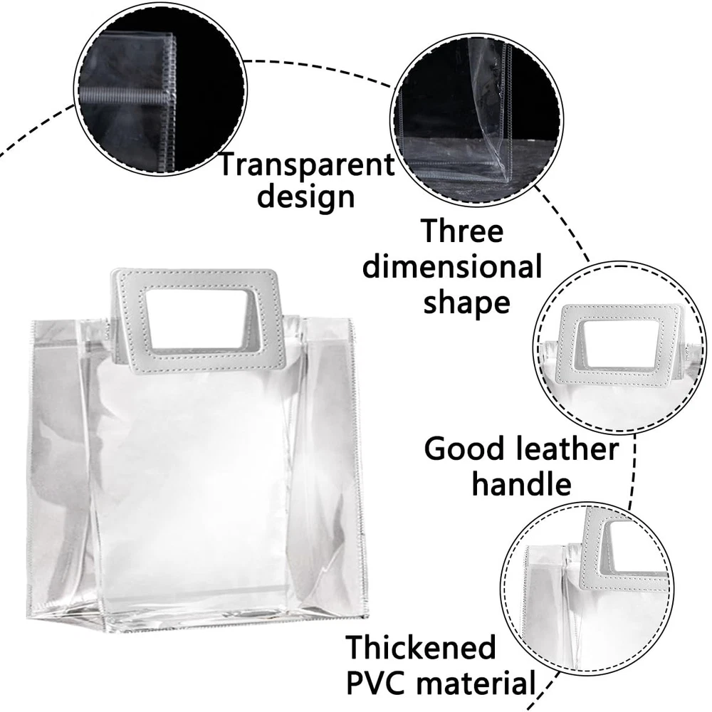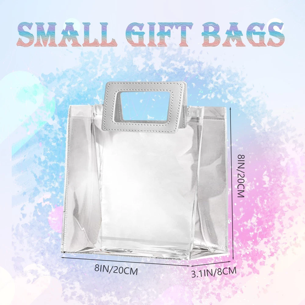 Size and Quantity: The package contains 10 clear gift bags with handles, each measures 8"x 3.1"x 8"/ 20x8x20 cm, portable size for your convenience, for your daily shopping needs, ideal size to hold party favors or gifts. Resistant Material: Our clear gift bags are made of polyvinyl chloride, thick and easy to carry, waterproof, easy to wipe, collapsible, easy to store, reusable and durable! The transparent design allows you to easily see the gift you are giving! Strong PU Handle: The white handles are made of PU material, which is stronger and more durable than ordinary handles, and can hold more weight. White handles add color to the transparent bag, making it look less monotonous and more sophisticated! Square Design: Square pull handle design for better usage, carry things more convenient, square bag body, can stand, not easy to crooked. Elegant and stylish, this clear shopping bag will make you stand out from the crowd and catch everyone's eye! Wide Application: Our clear gift bags can be used as gift bags, retailer bags, shopping bags, DIY craft bags. Perfect suitable for groceries, parties, weddings, baby shower, celebrations, festivals, bridal shower, Christmas, fashion items.