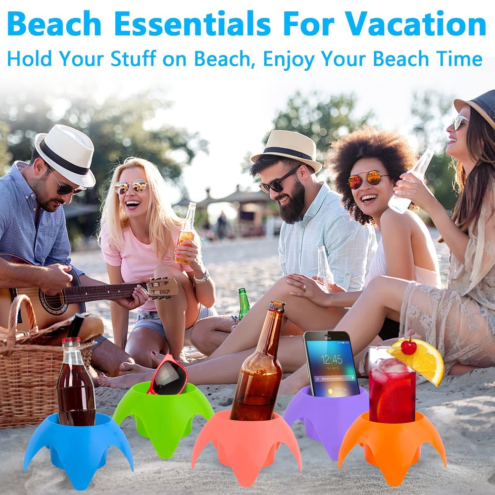 【Practical Beach Cup Holders】Are you annoyed by the sticky sand on your drinks or stuff when enjoying your sun bath on the beach? Here comes the beach cup holder! This 3.5 inches large capacity beach cup holder, right next to your beach chair or blanket directly into the sand, keeping your hands free and beverages snacks sunglasses sand-free. 【Large Capacity】This sand cup holder has a large capacity of 3.5 inches, which is perfect to hold most drinks, beer, cell phones, speaker, glasses, baby bottle, earphones, sunscreen, cameras or anything you want easily available within reach,just enjoy your beach time! 【Eye-catching Design】With a Cute starfish five wrist stackable design and 5 different bright colors, this beach drink holder makes you eye-catching on the beach. And the bright colors also help you to find your stuff on the beach easily, no worry of losing stuff on the beach,very helpful beach essentials,you must have for your trip! 【Space-saving,Easy to 】The size of this beach cup holder is 5.5 x 5.5 x 3 inches, they are stackable to save space. 5 packs stacked together only 5.5 inches,10 packs stacked together only 11 inches for easy travel packing.They're also light weigt to carry, very convenient and practical beach accessories for your beach trip!【Tips:Twist them to get them apart!】 【Wide Applications】This beach cup holder is not just a beach cup holder, also a storage compartment near your chair or towel at the beach, river, lake, picnics, camping, outdoor concerts, outdoor sporting events, tailgating, etc. Works great at the beach party,beach balls like volleyball and so on! A must have accessories for beach vacation! Great Present for your family,friends,fishmen and beach lovers!