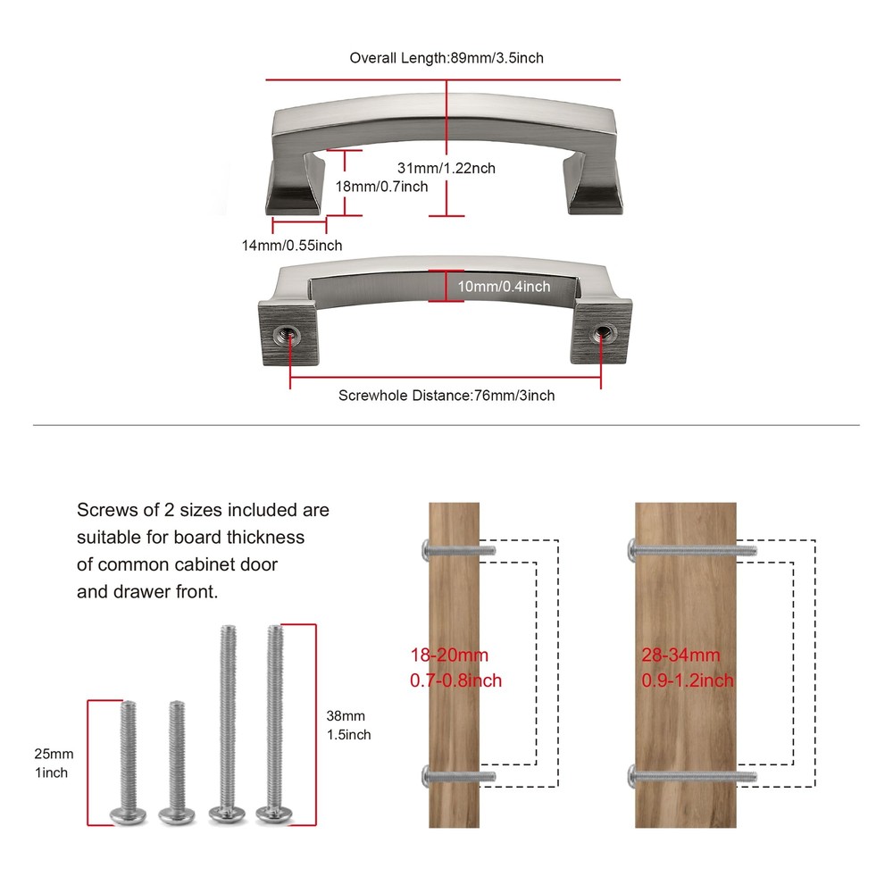 Wide range of applications: Ideal for cabinets, closets, cupboards, drawers, dressers, wardrobes. 100 Days After-Sales Guarantee: is committed to bringing high quality handles to our customers, if there is any quality problem within 100 days, we will replace it High Quality: Made of solid zinc alloy, it is strong, durable and easy to install. Beautiful in appearance and delicate in touch Dimensions: Hole Center (CC): 3 inches (76MM); Overall Length:3.5 inches (89MM); Width:0.4inches (10MM); Height:1.22inches (31MM);Weight: 71 g (2.50 oz),Please double check the handle size you need before purchasing. What's Included: 5 cabinet handles and 20 matching standard screws (1" (~25mm) and 1.5" (~38mm)). American screws, you can choose the right size according to the thickness of the cabinet. Each handle has its own packaging, effectively preventing bumps and scratches. Wide range of applications: Ideal for cabinets, closets, cupboards, drawers, dressers, wardrobes.